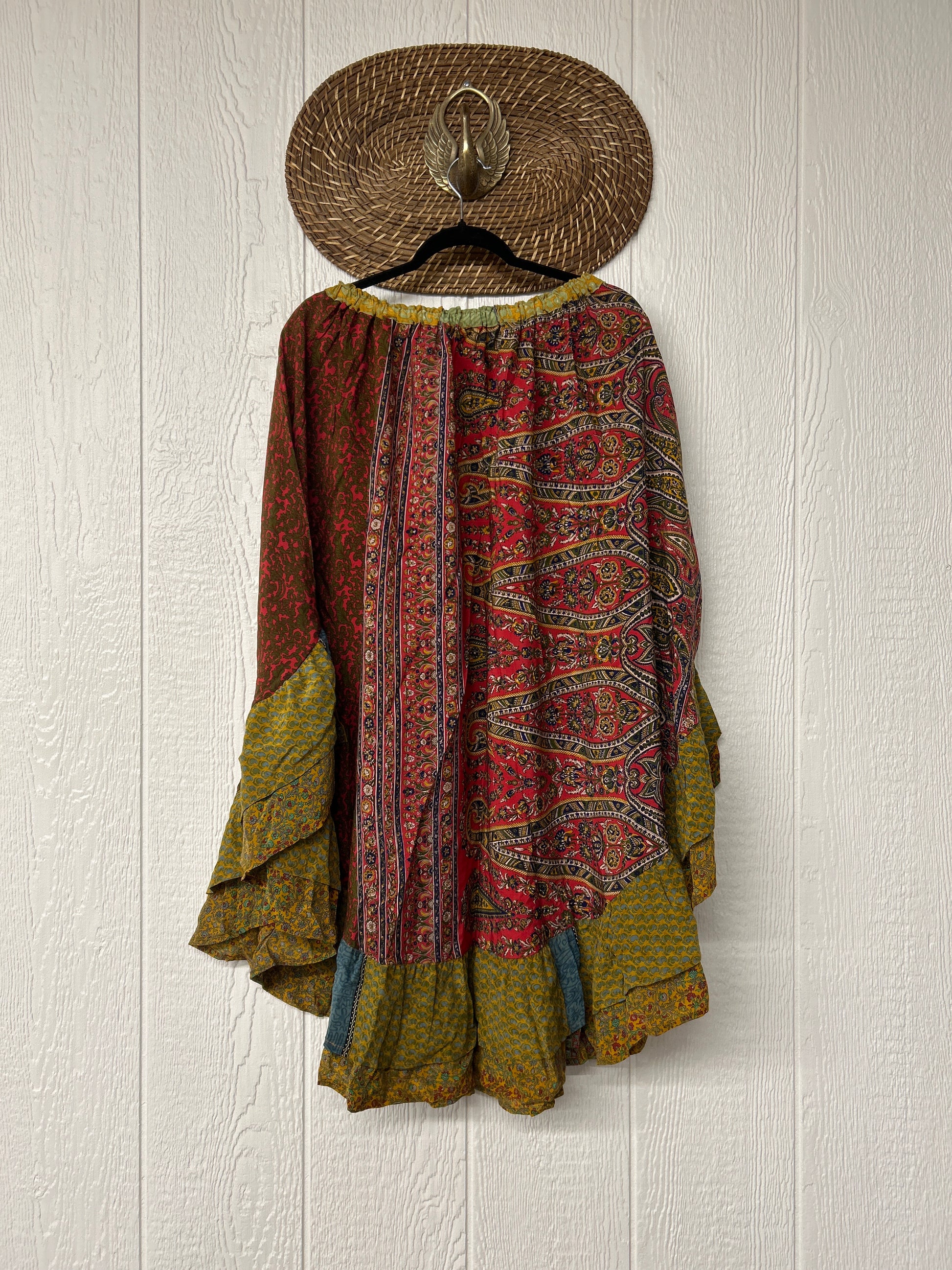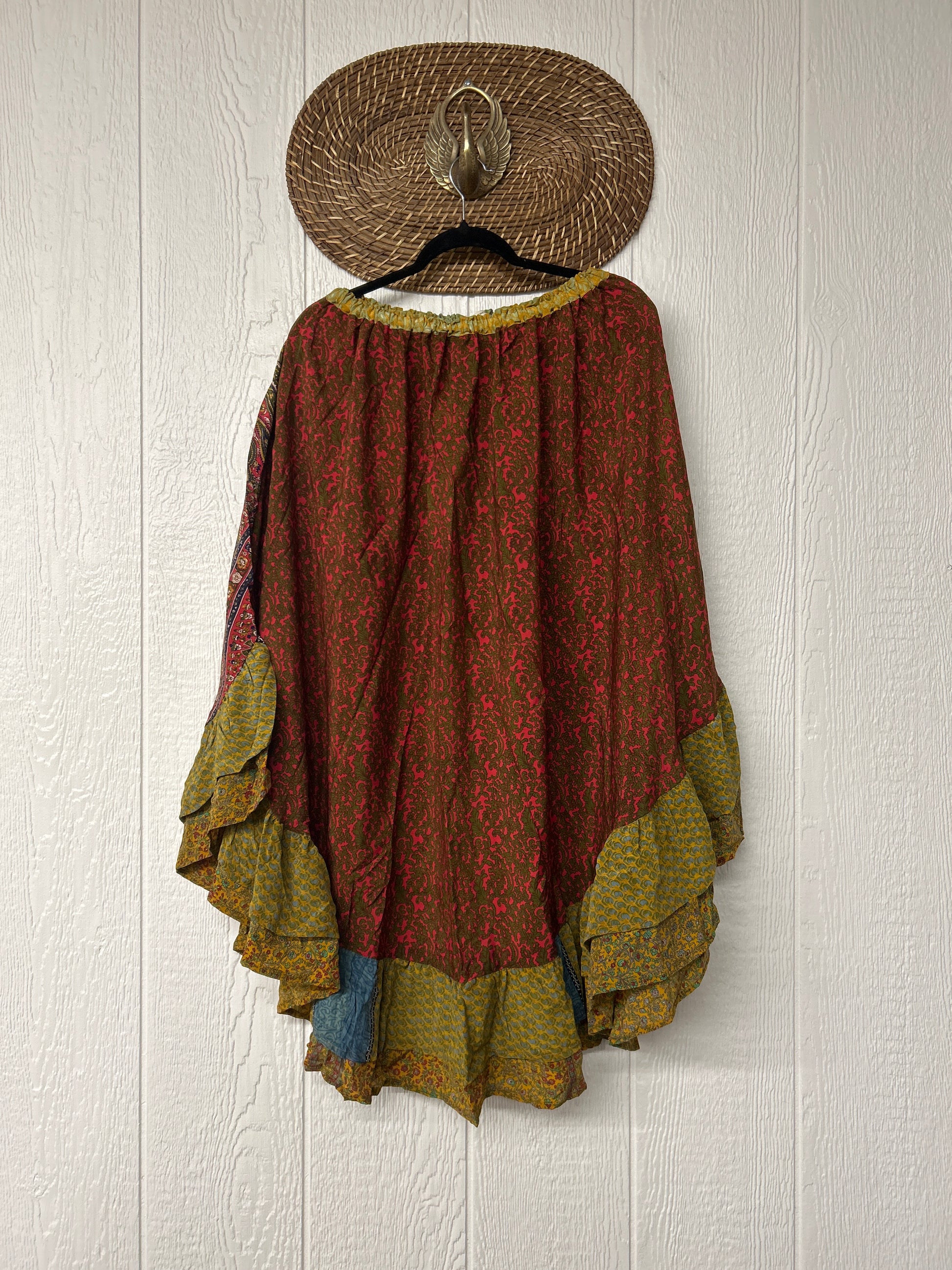 Crafted from vintage crepe sari this twirly skirt features a stretchy elastic waist and curved ruffle hem for extra dimension.