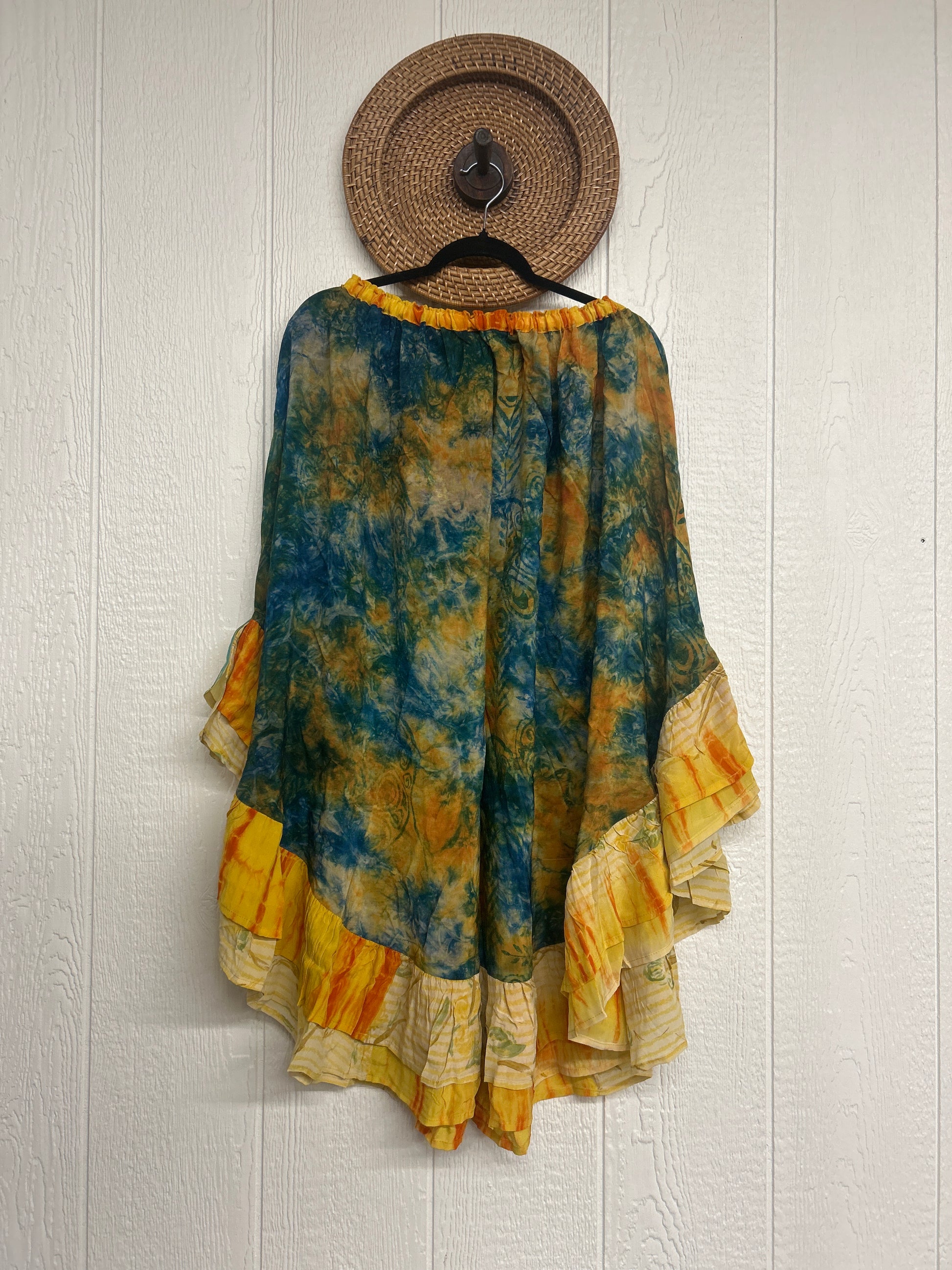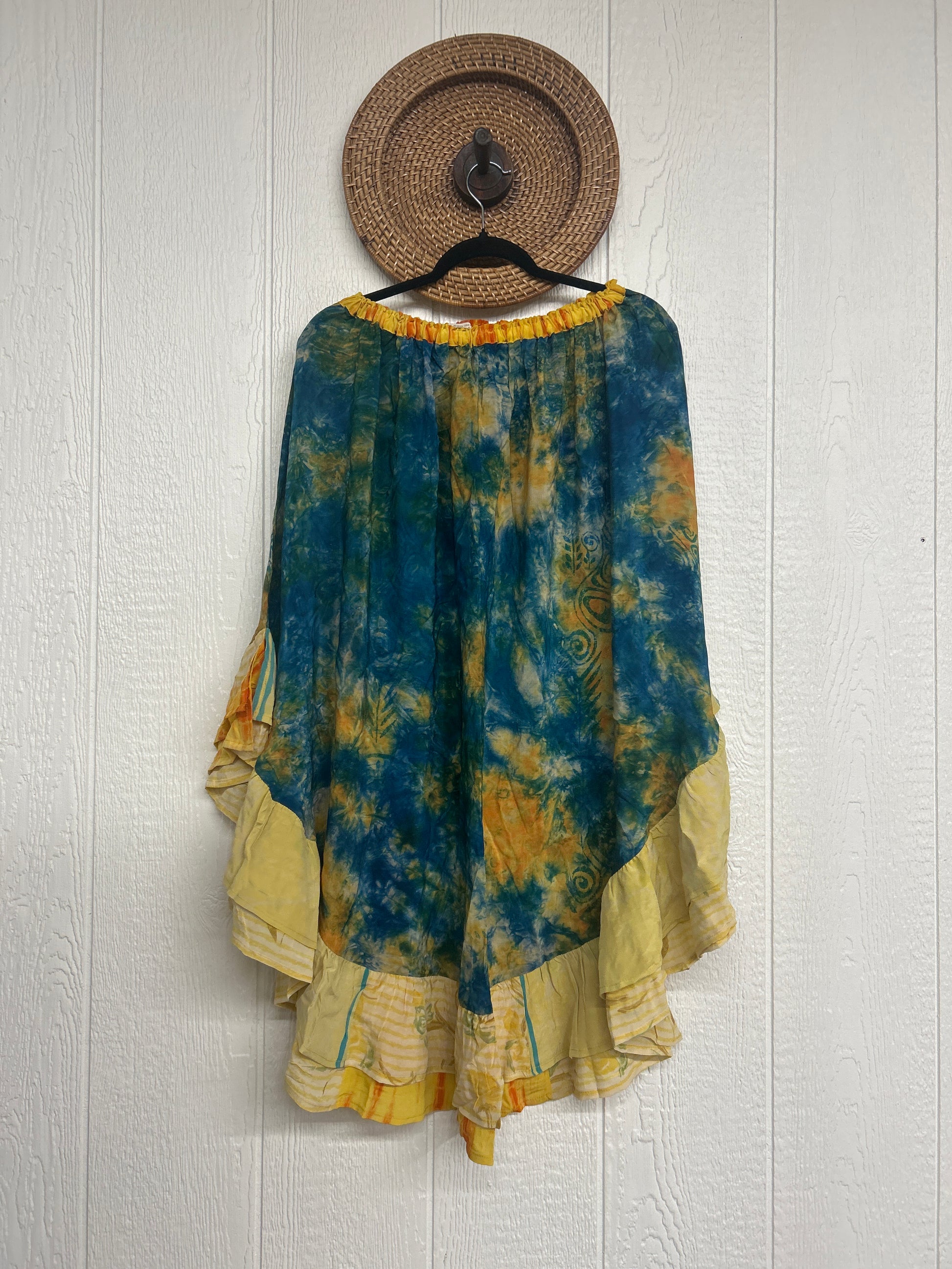 Crafted from vintage crepe sari this twirly skirt features a stretchy elastic waist and curved ruffle hem for extra dimension.