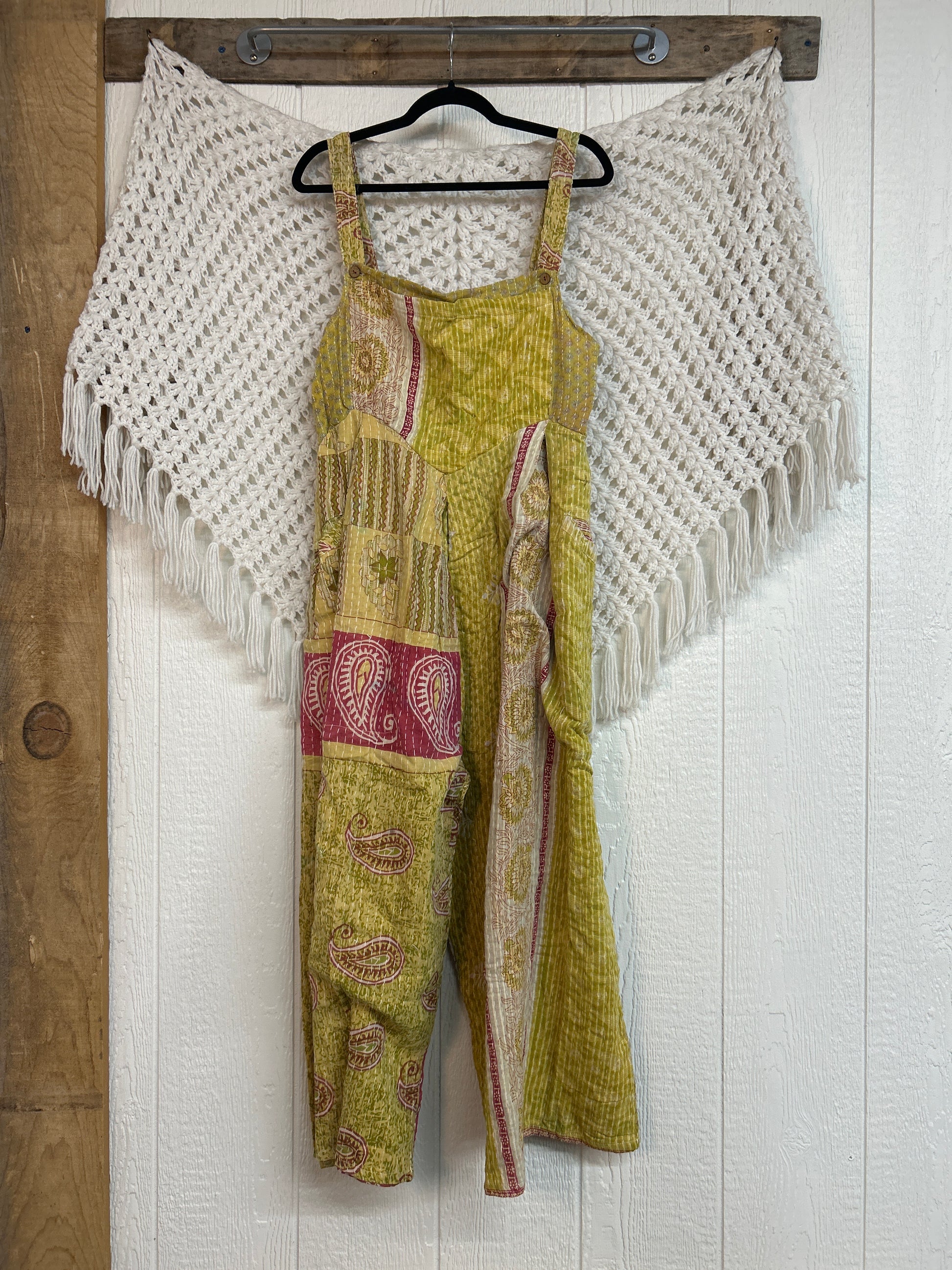 Features adjustable button straps, deep interior pockets, front bib pocket and wide flowy legs