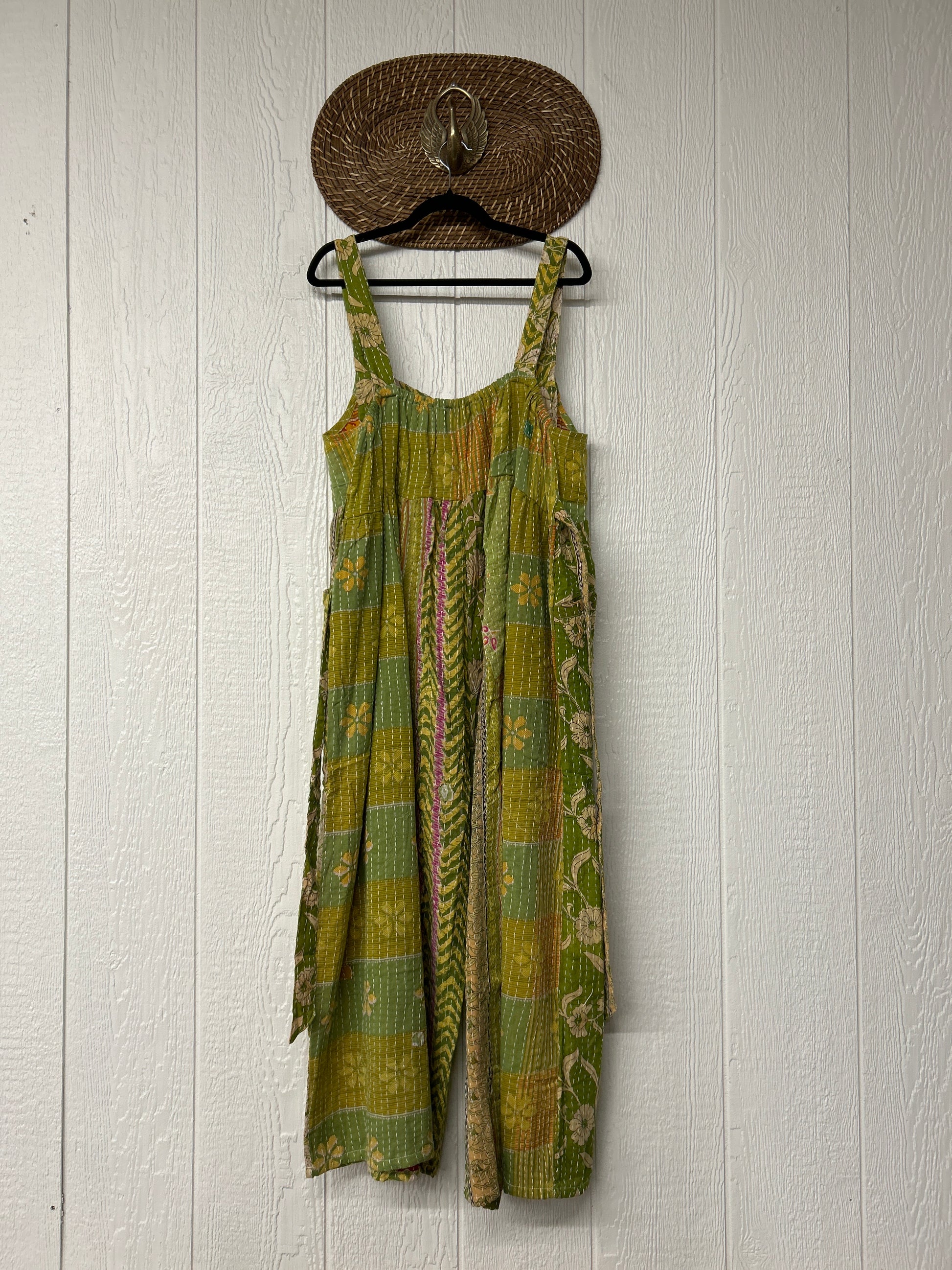 Features adjustable button straps, deep interior pockets, front bib pocket and wide flowy legs