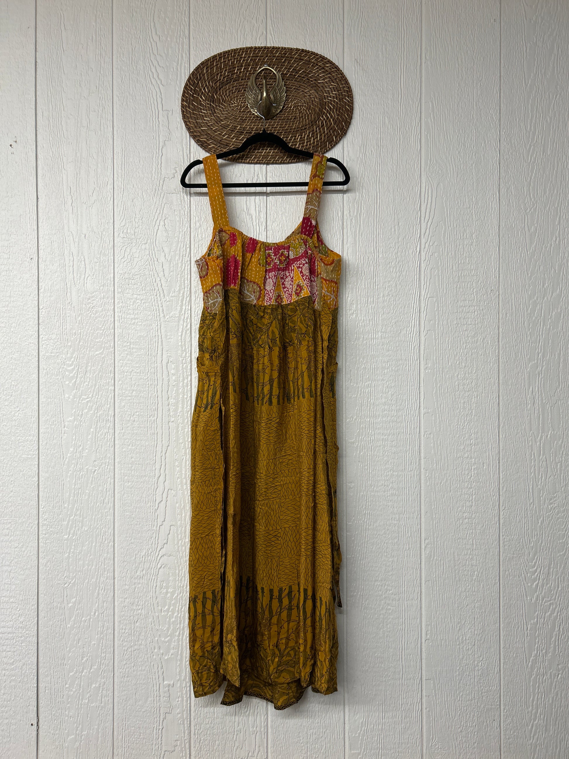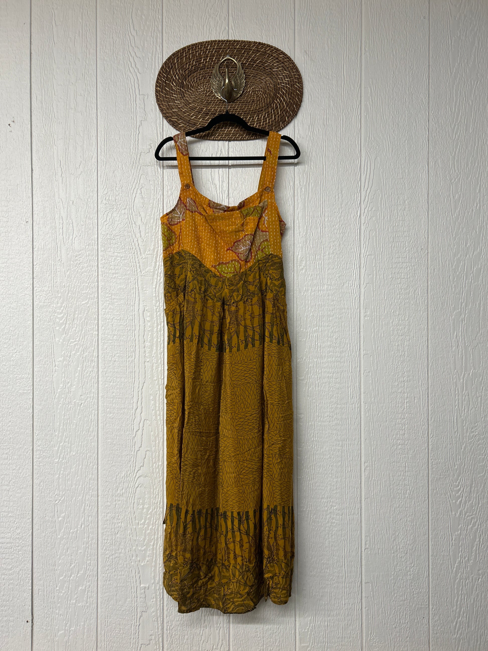 Perfect for EVERY season this overall dress features a kantha bib front with center pocket, adjustable button straps, tie back, crepe skirt and interior pockets on the skirt.