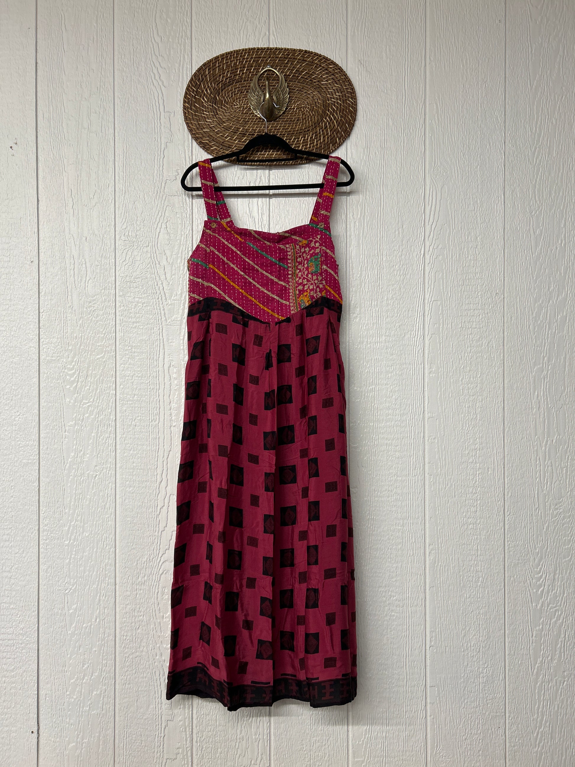 Perfect for EVERY season this overall dress features a kantha bib front with center pocket, adjustable button straps, tie back, crepe skirt and interior pockets on the skirt.