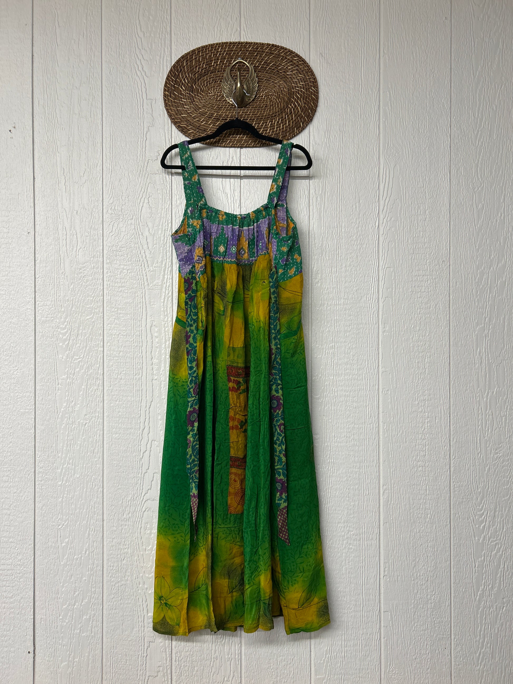 Perfect for EVERY season this overall dress features a kantha bib front with center pocket, adjustable button straps, tie back, crepe skirt and interior pockets on the skirt.