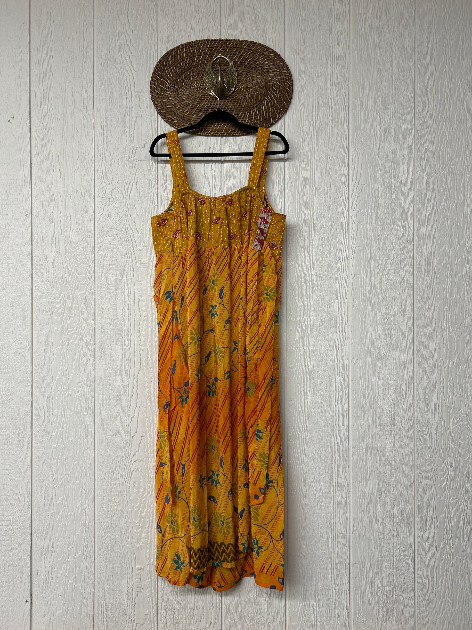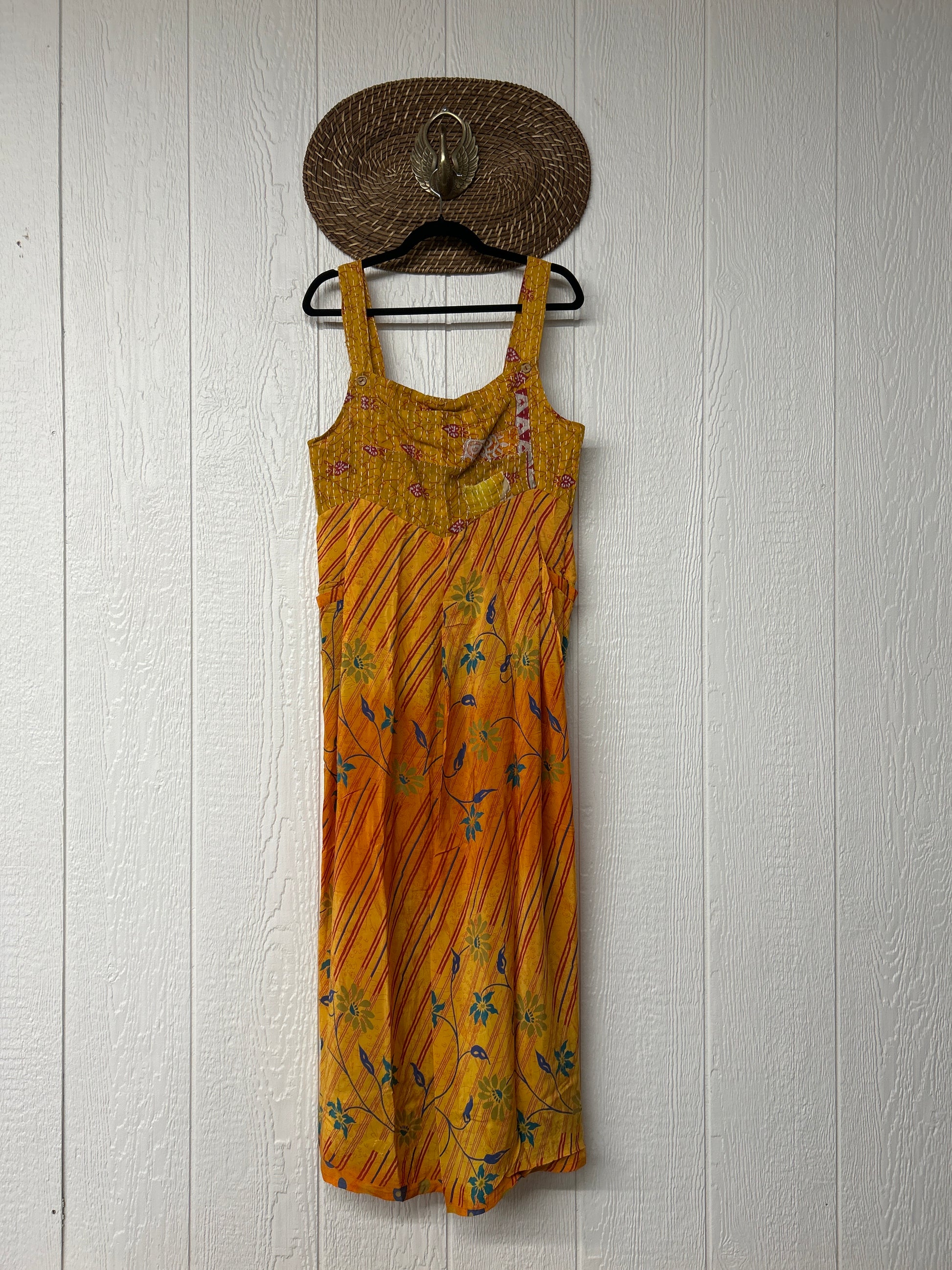 Perfect for EVERY season this overall dress features a kantha bib front with center pocket, adjustable button straps, tie back, crepe skirt and interior pockets on the skirt.