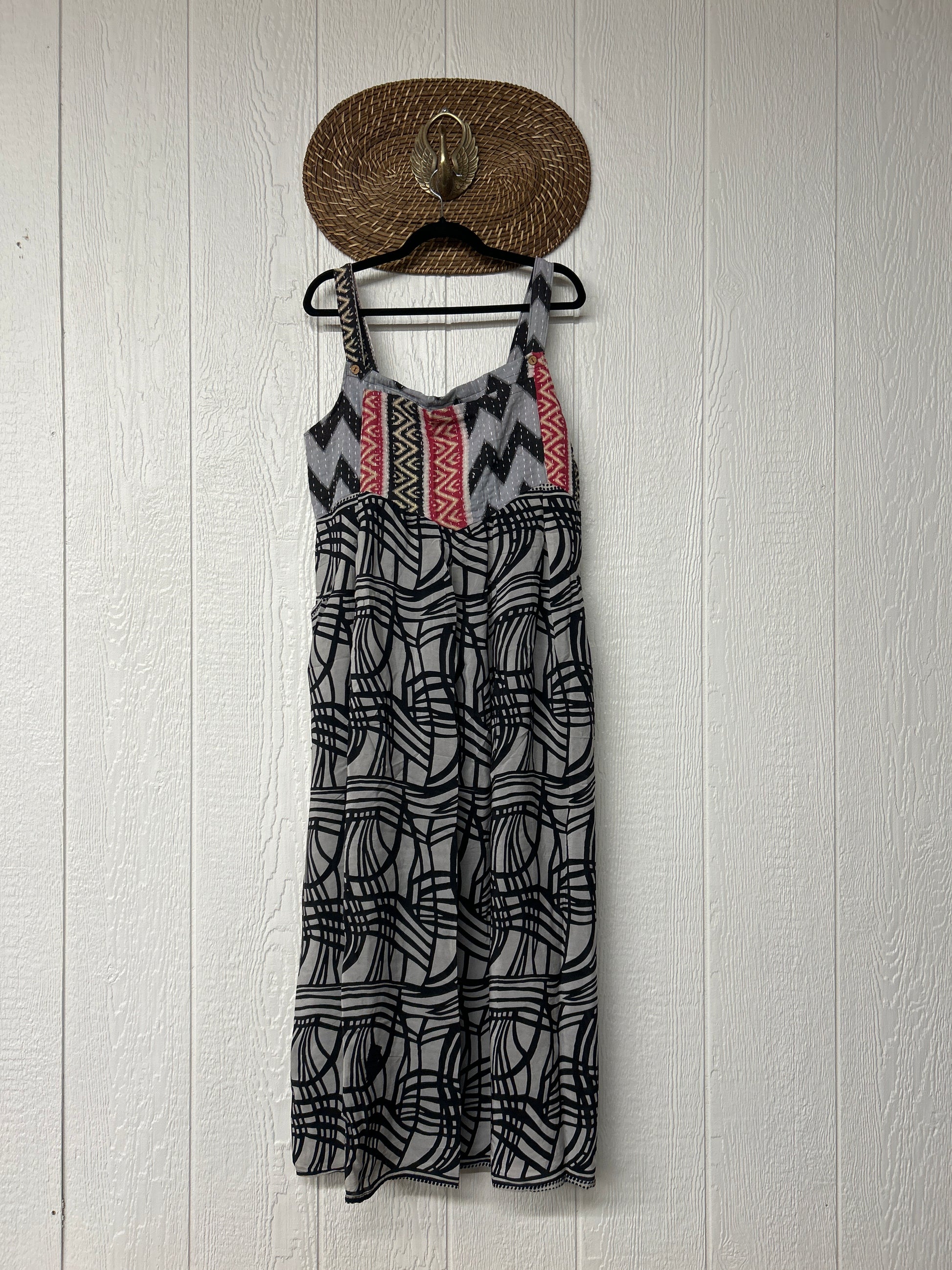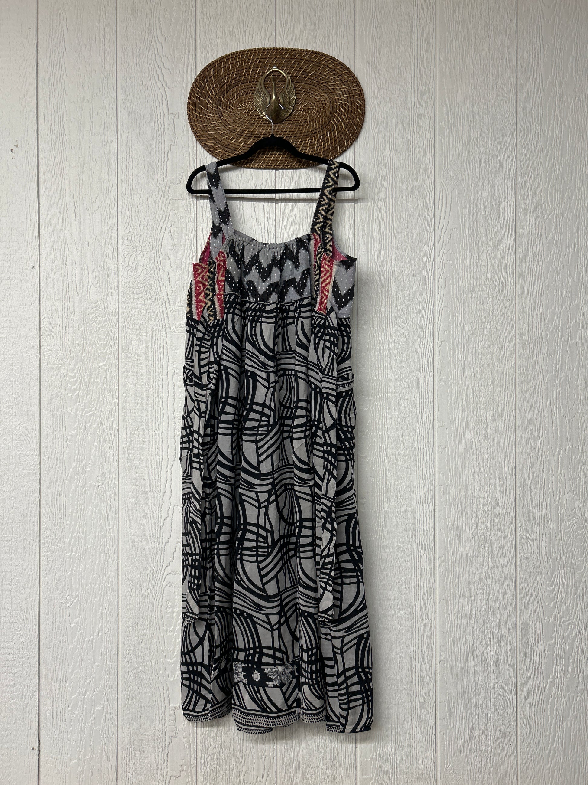 Perfect for EVERY season this overall dress features a kantha bib front with center pocket, adjustable button straps, tie back, crepe skirt and interior pockets on the skirt.