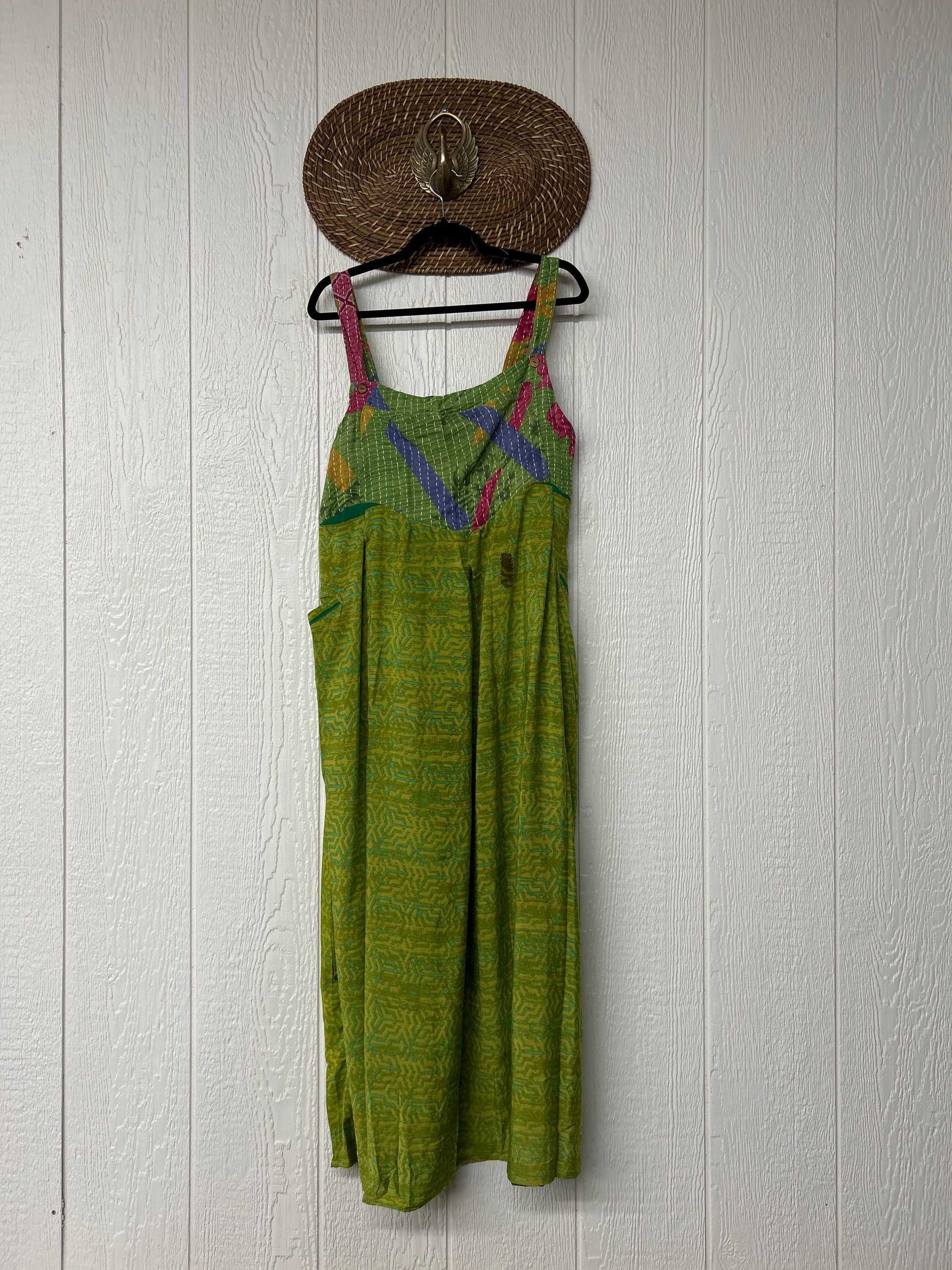 Perfect for EVERY season this overall dress features a kantha bib front with center pocket, adjustable button straps, tie back, crepe skirt and interior pockets on the skirt.