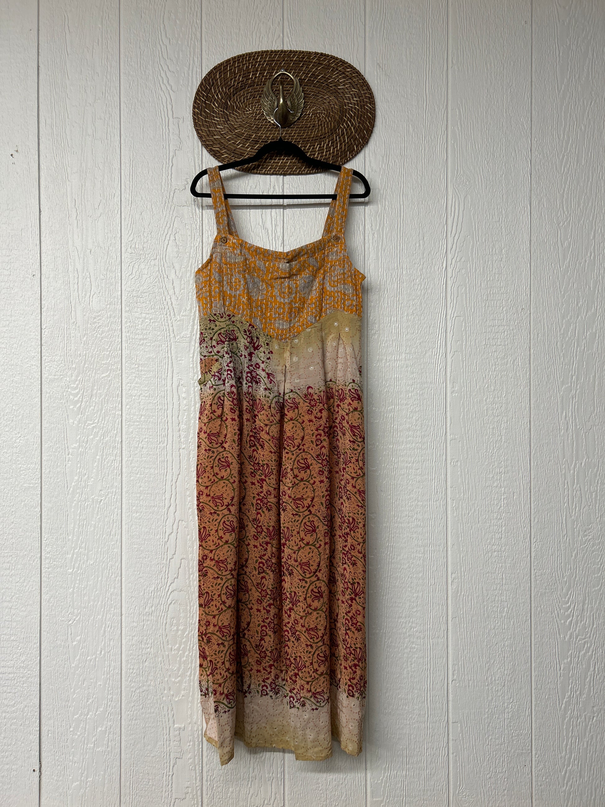 Perfect for EVERY season this overall dress features a kantha bib front with center pocket, adjustable button straps, tie back, crepe skirt and interior pockets on the skirt.