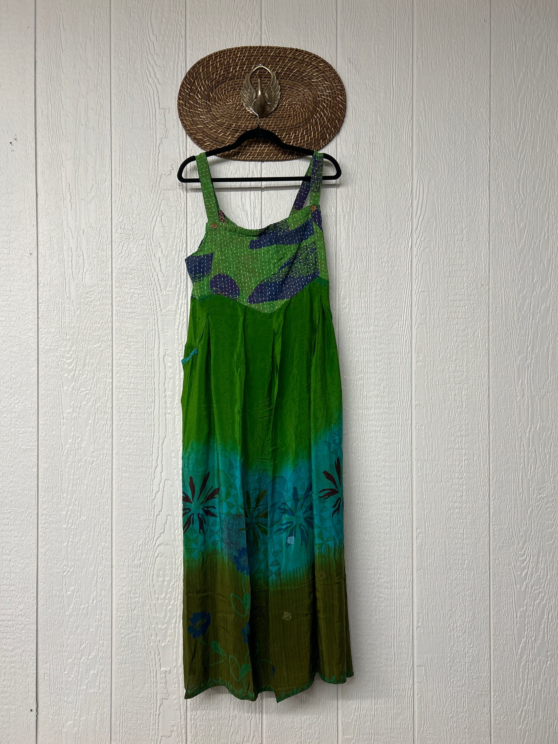 Perfect for EVERY season this overall dress features a kantha bib front with center pocket, adjustable button straps, tie back, crepe skirt and interior pockets on the skirt.