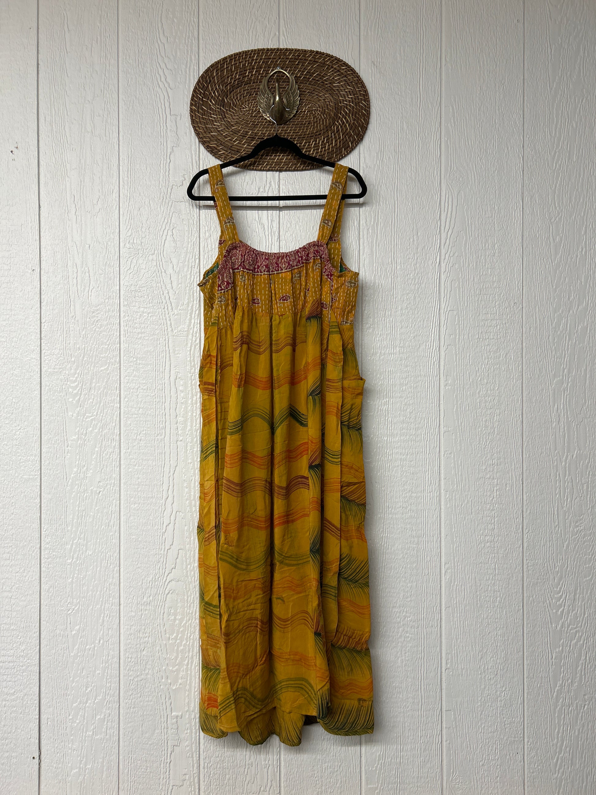 Perfect for EVERY season this overall dress features a kantha bib front with center pocket, adjustable button straps, tie back, crepe skirt and interior pockets on the skirt.