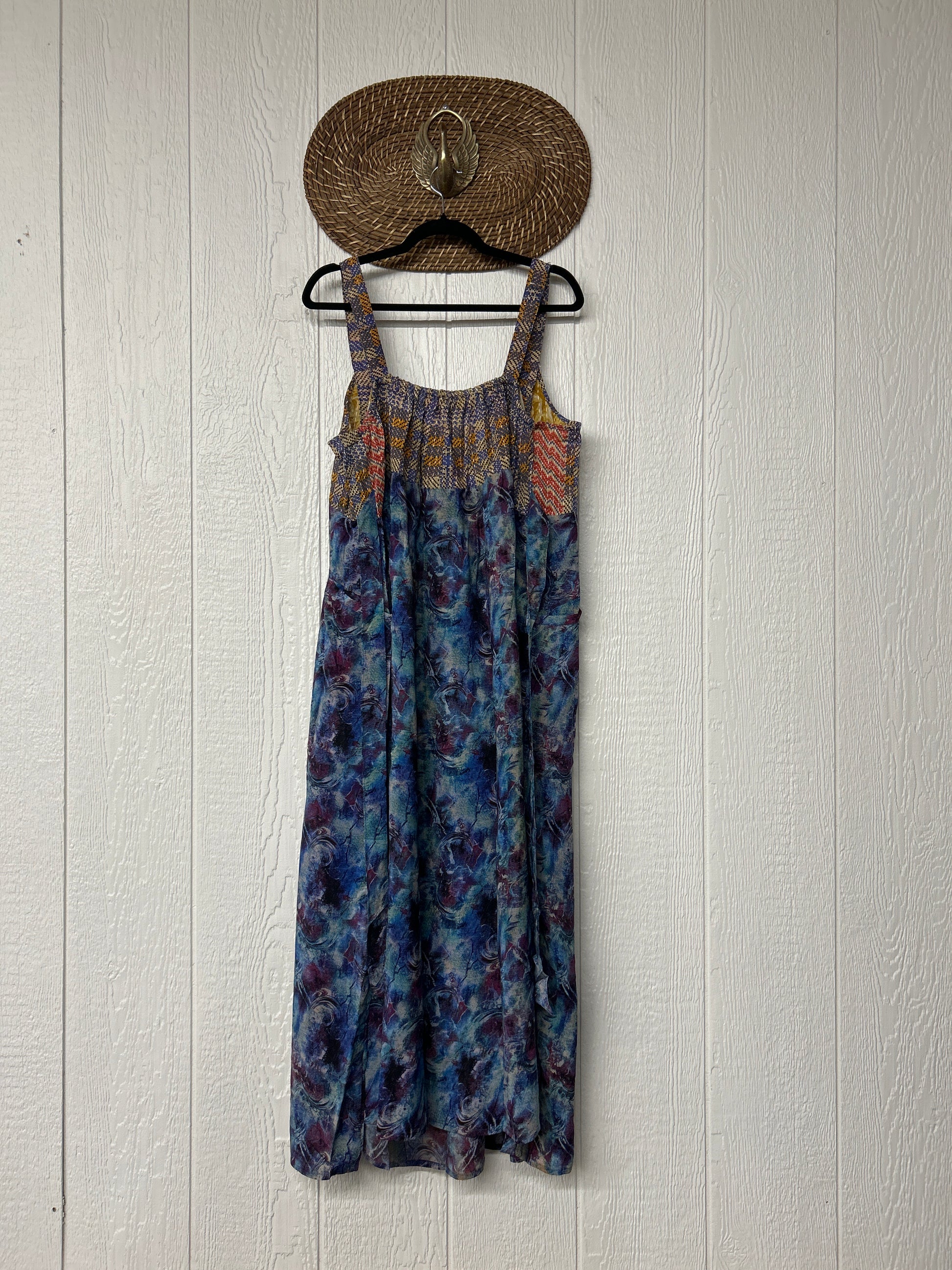 Perfect for EVERY season this overall dress features a kantha bib front with center pocket, adjustable button straps, tie back, crepe skirt and interior pockets on the skirt.