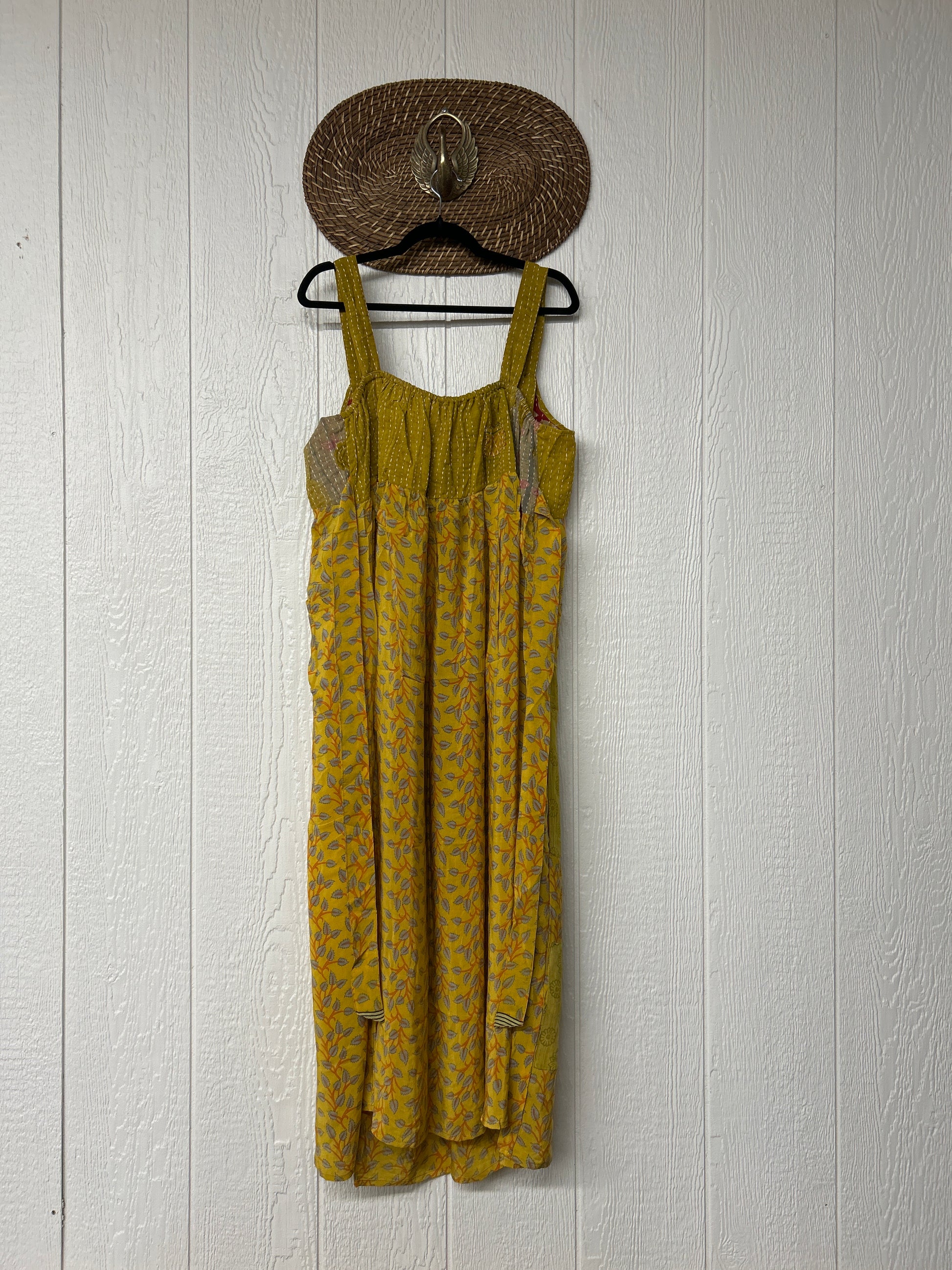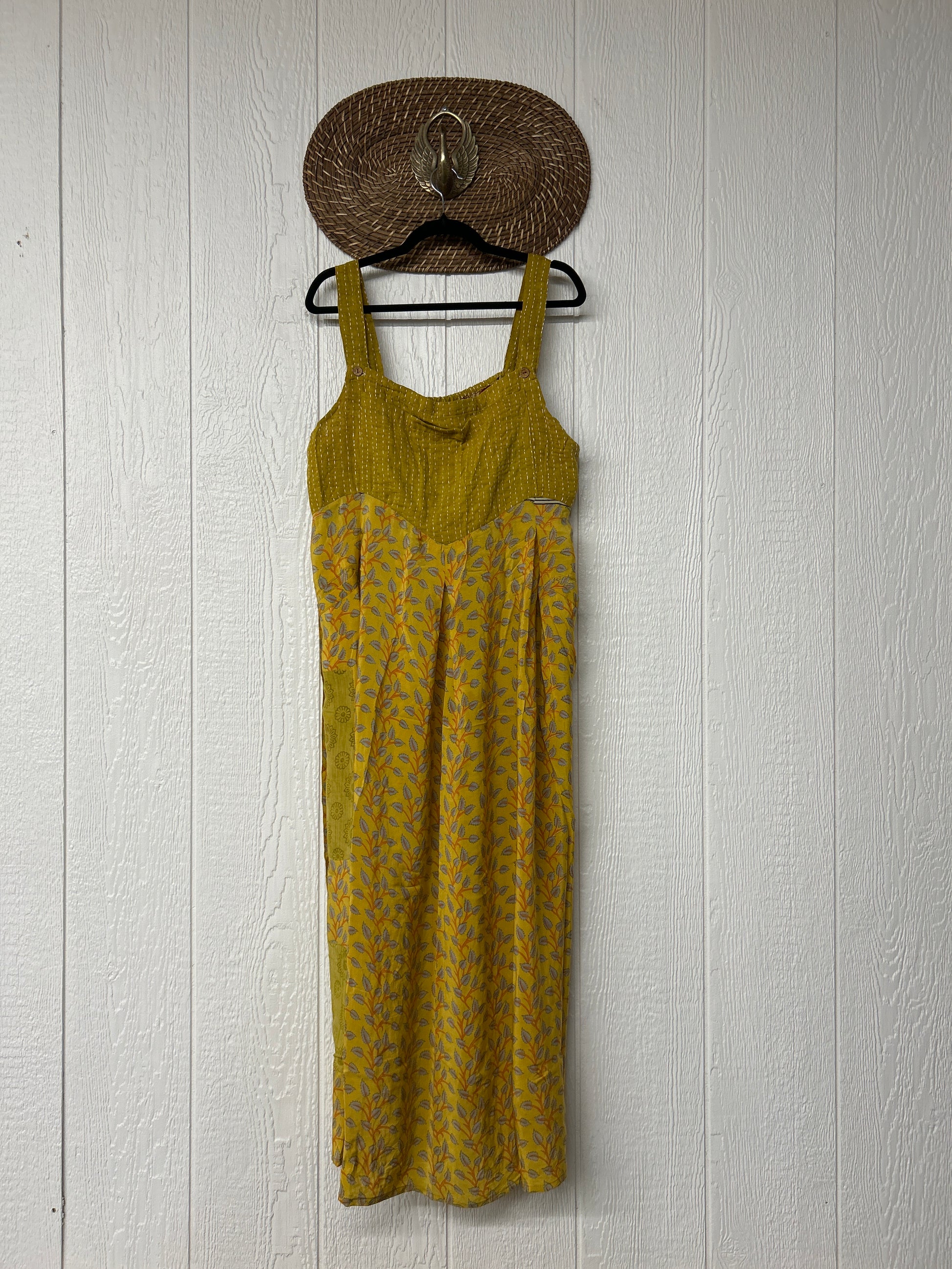 Perfect for EVERY season this overall dress features a kantha bib front with center pocket, adjustable button straps, tie back, crepe skirt and interior pockets on the skirt.