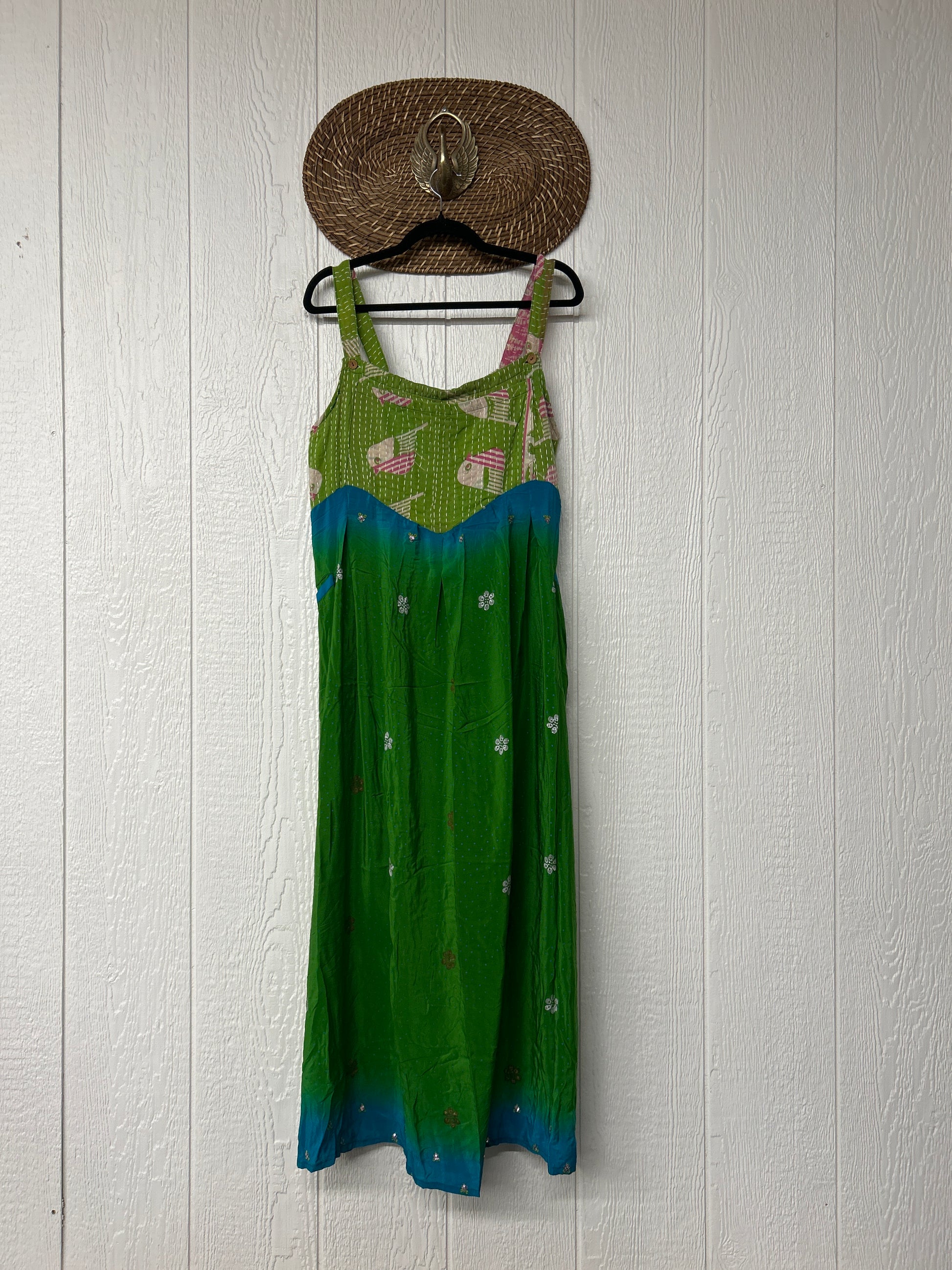 Perfect for EVERY season this overall dress features a kantha bib front with center pocket, adjustable button straps, tie back, crepe skirt and interior pockets on the skirt.