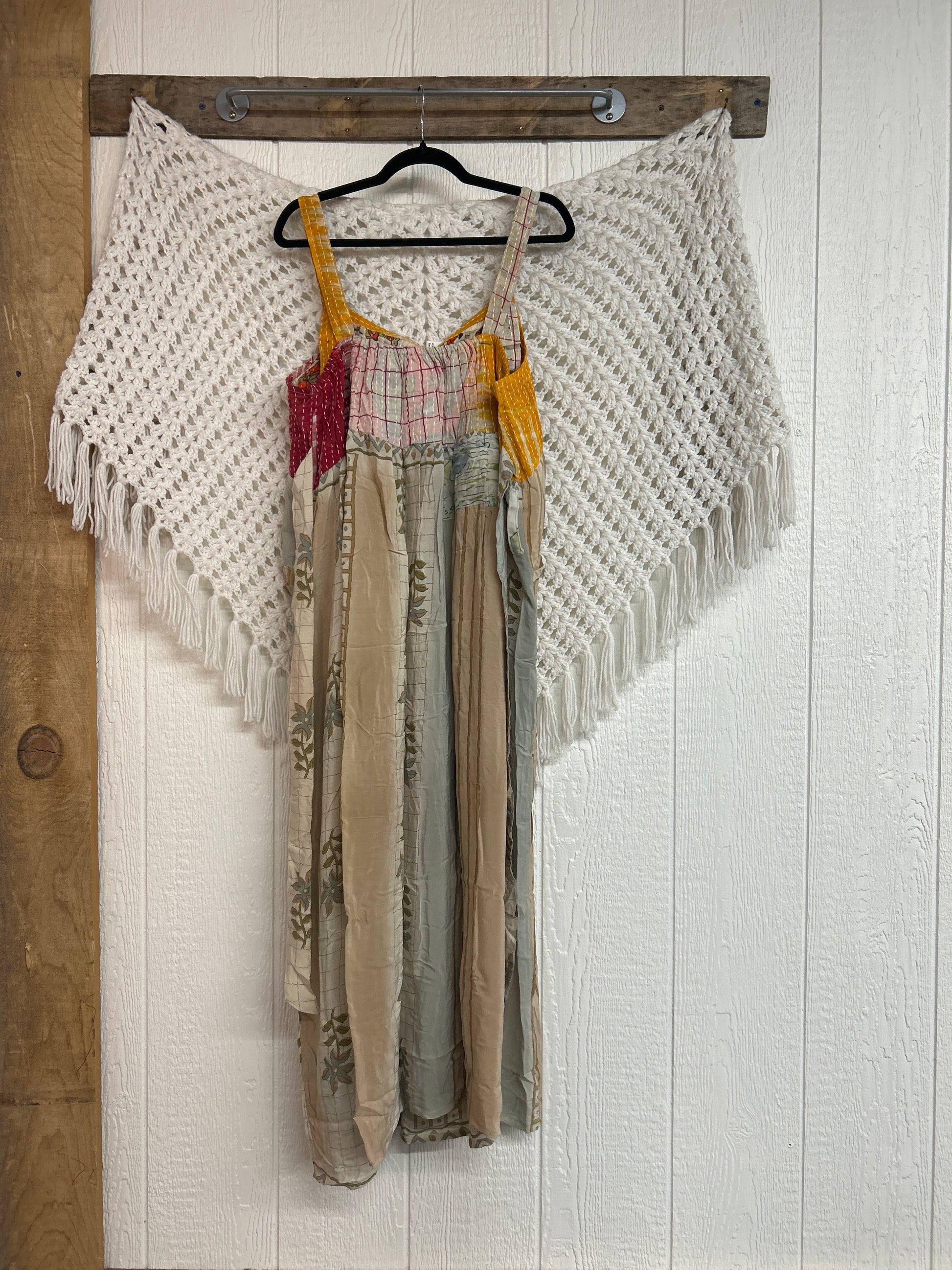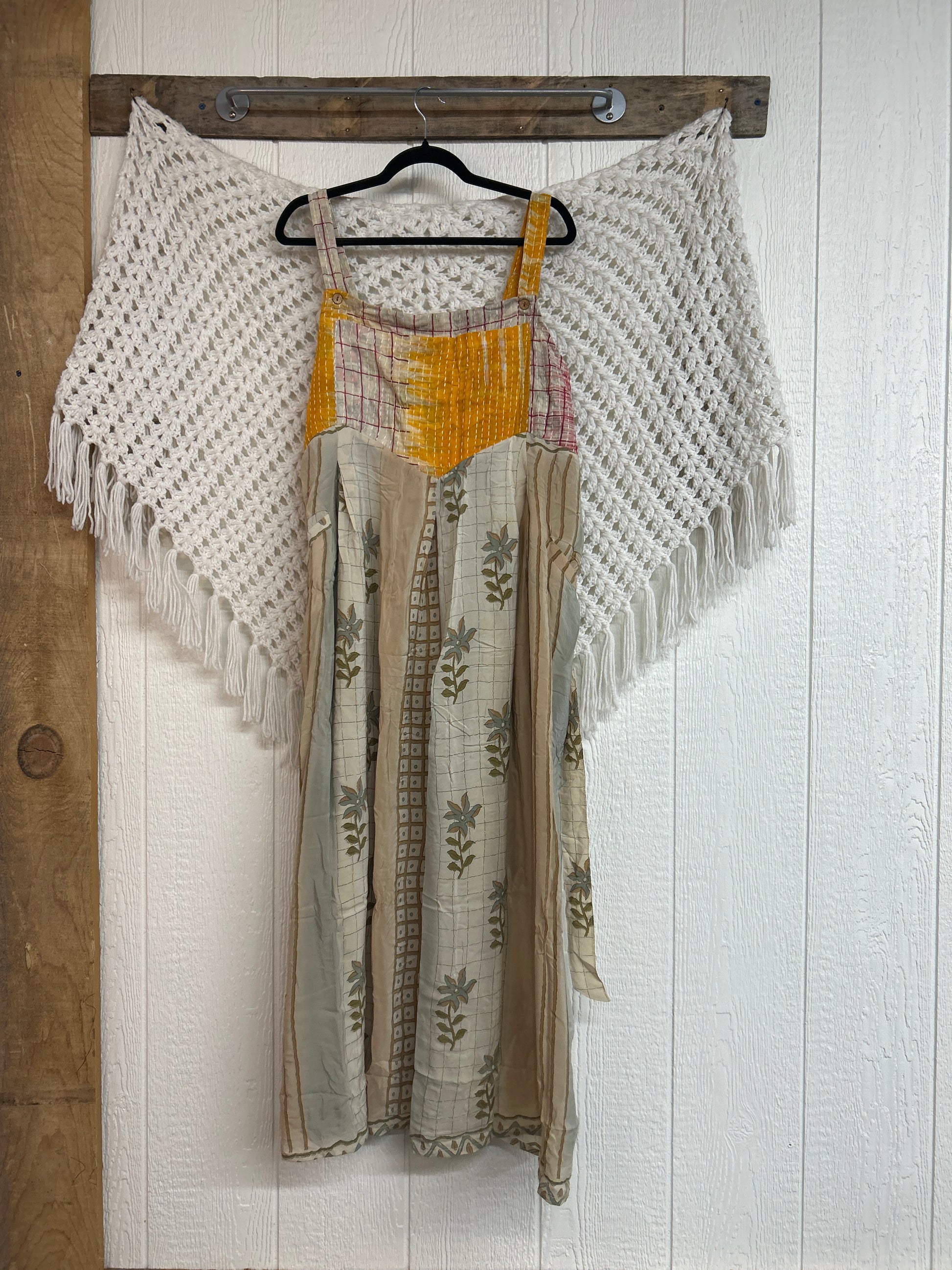 Perfect for EVERY season this overall dress features a kantha bib front with center pocket, adjustable button straps, tie back, crepe skirt and interior pockets on the skirt.