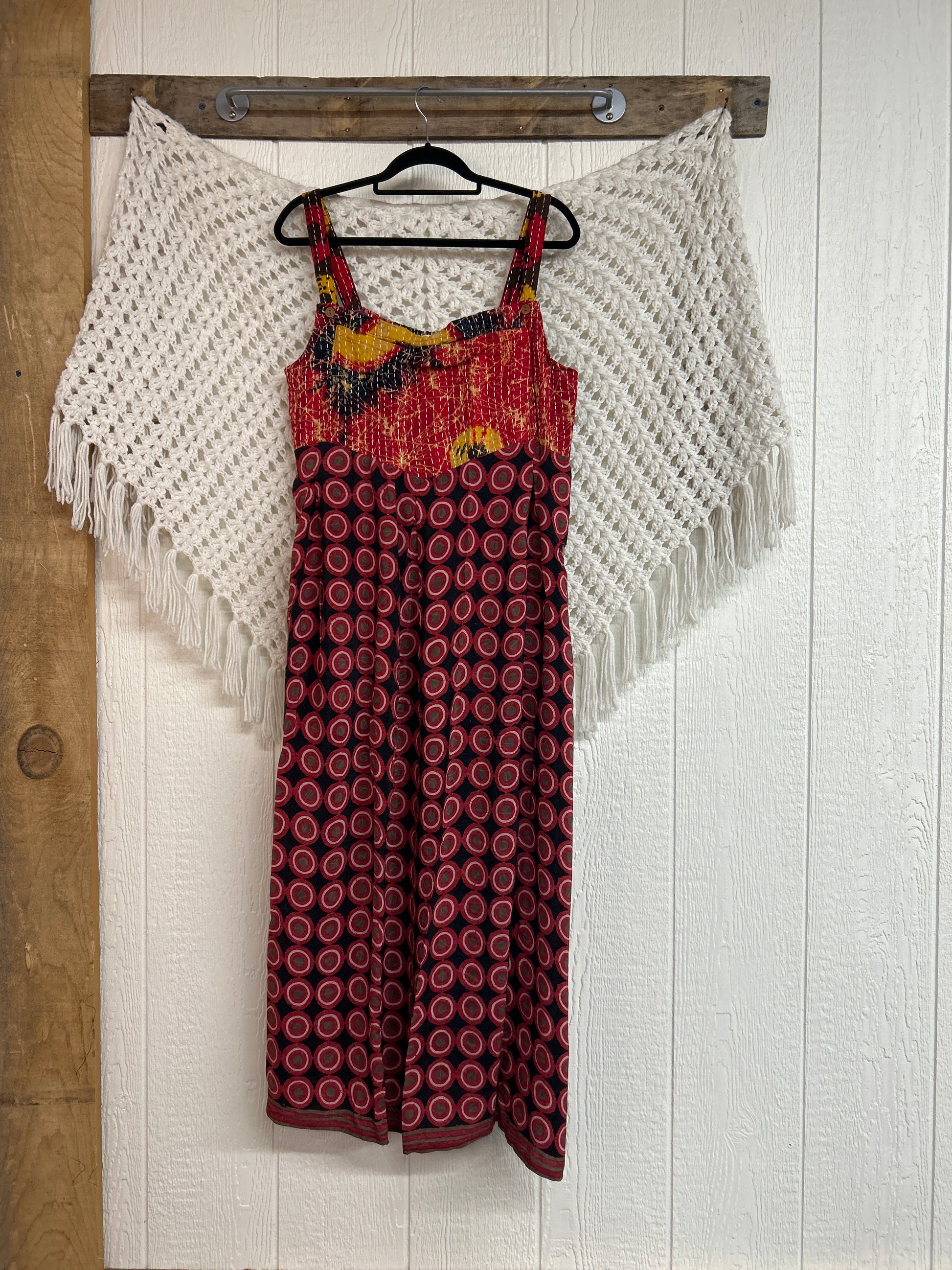 Perfect for EVERY season this overall dress features a kantha bib front with center pocket, adjustable button straps, tie back, crepe skirt and interior pockets on the skirt.