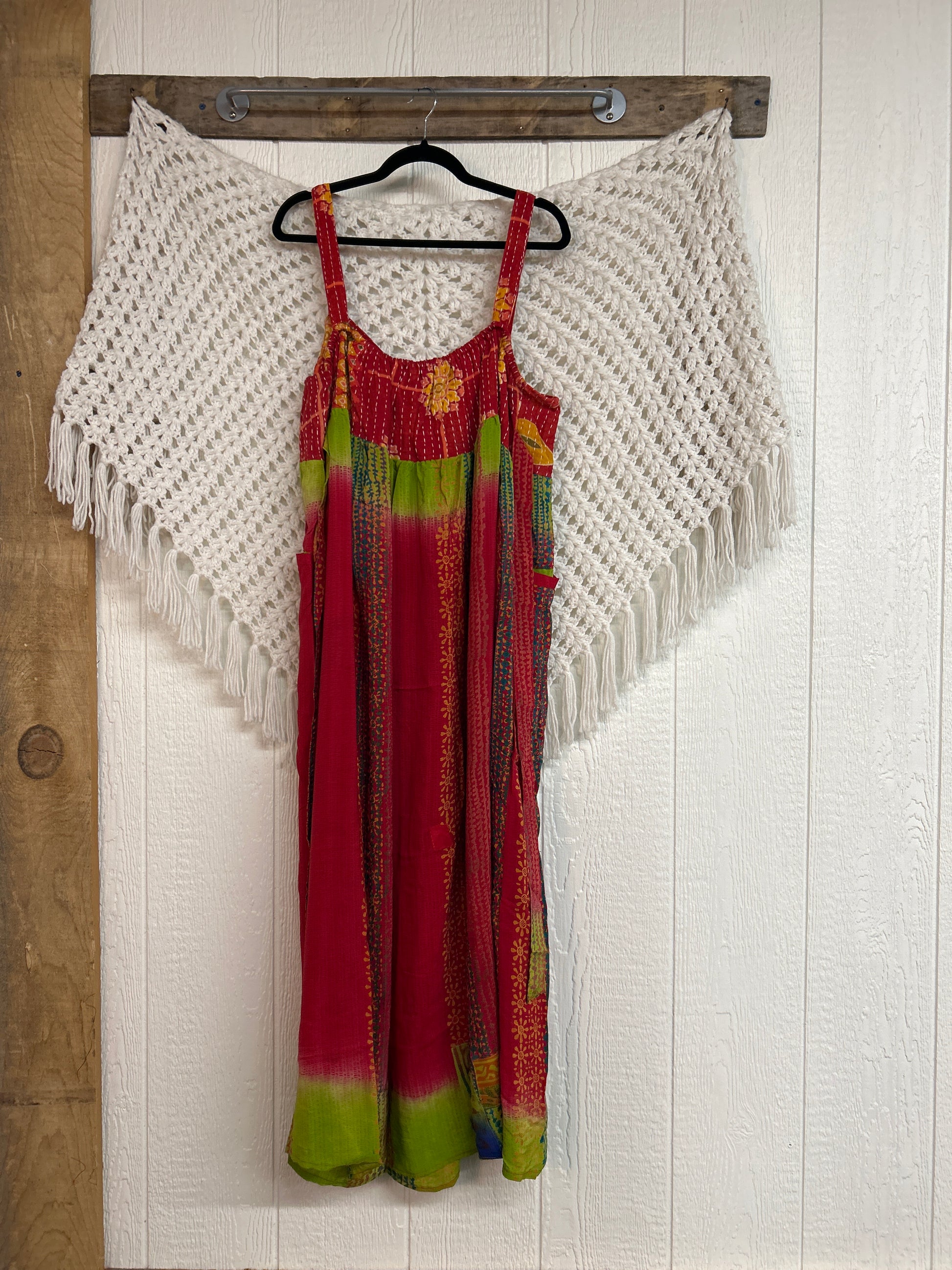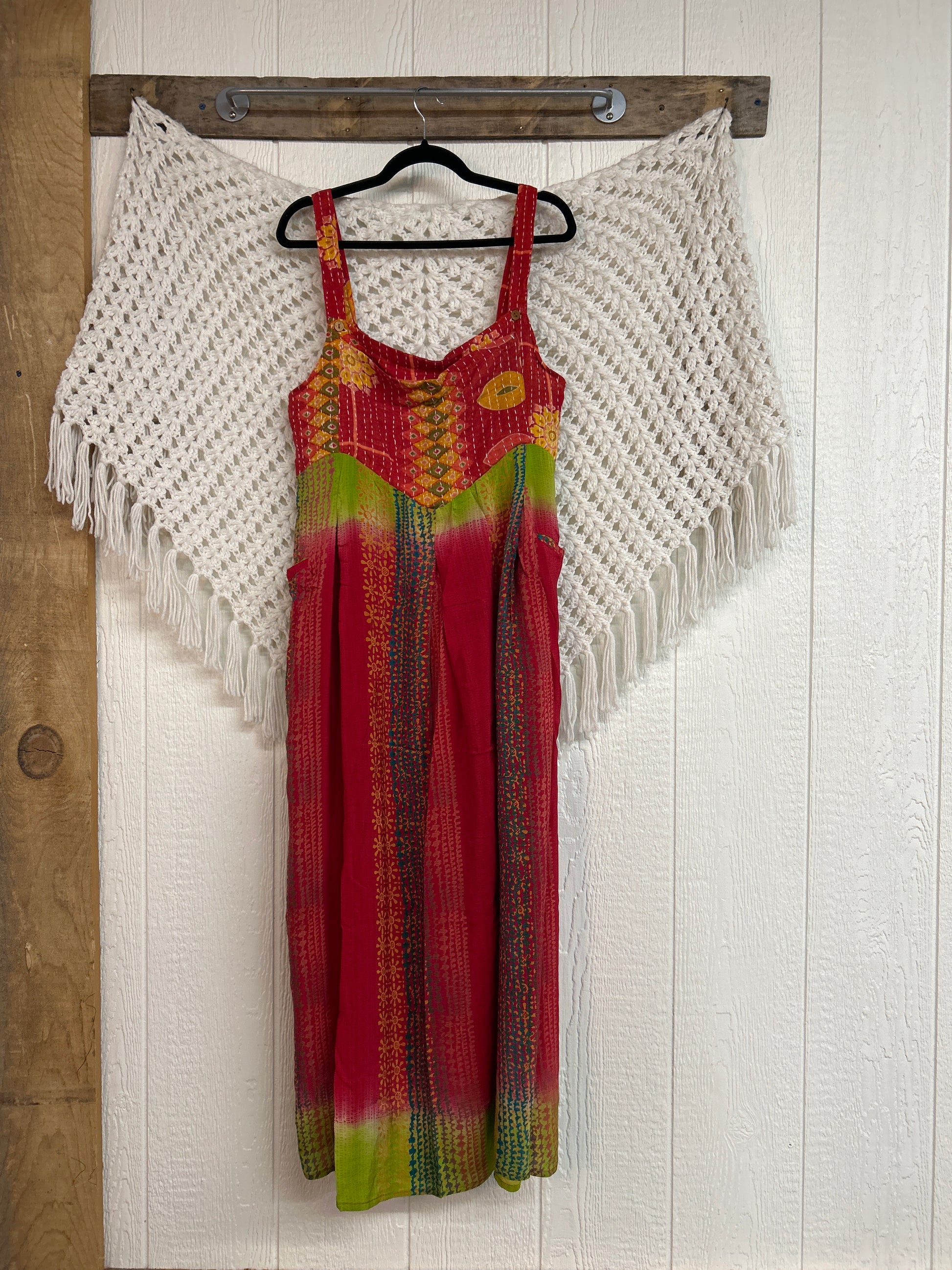 Perfect for EVERY season this overall dress features a kantha bib front with center pocket, adjustable button straps, tie back, crepe skirt and interior pockets on the skirt.