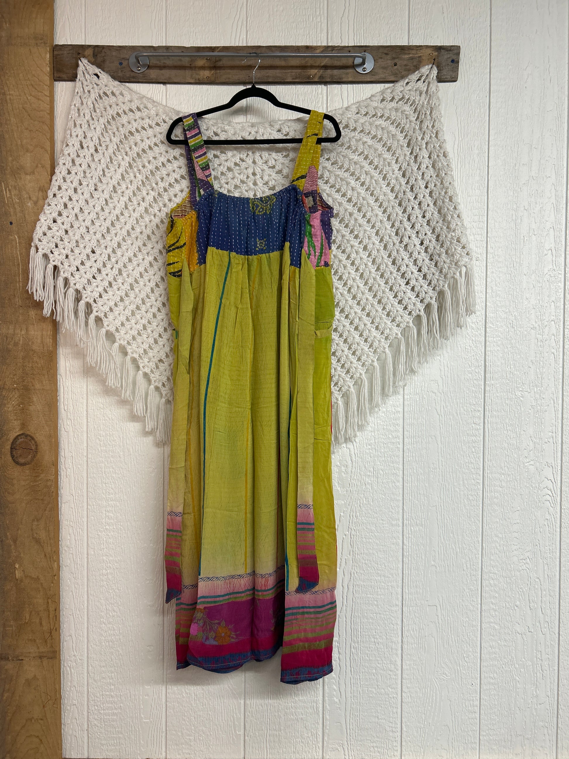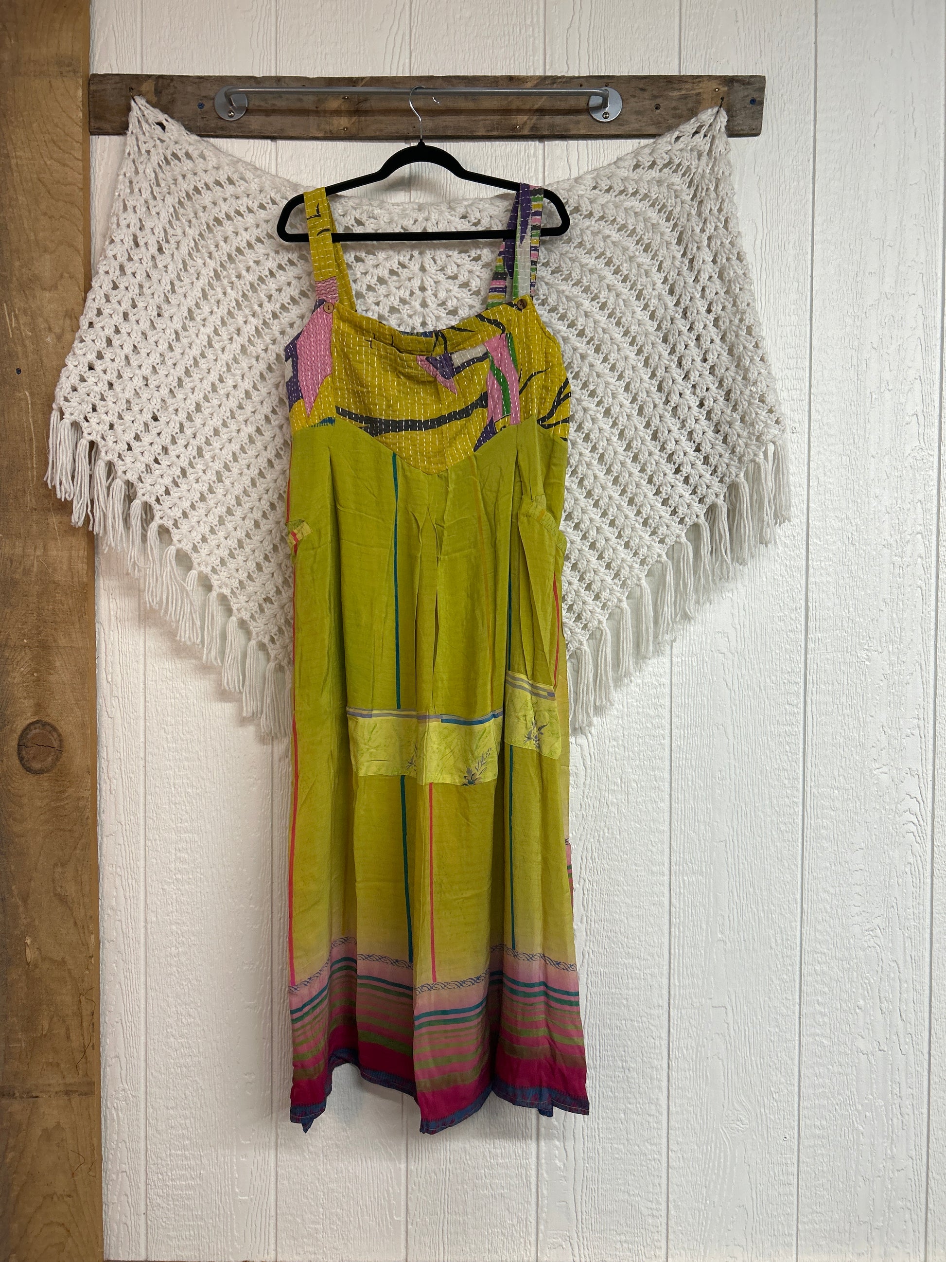 Perfect for EVERY season this overall dress features a kantha bib front with center pocket, adjustable button straps, tie back, crepe skirt and interior pockets on the skirt.