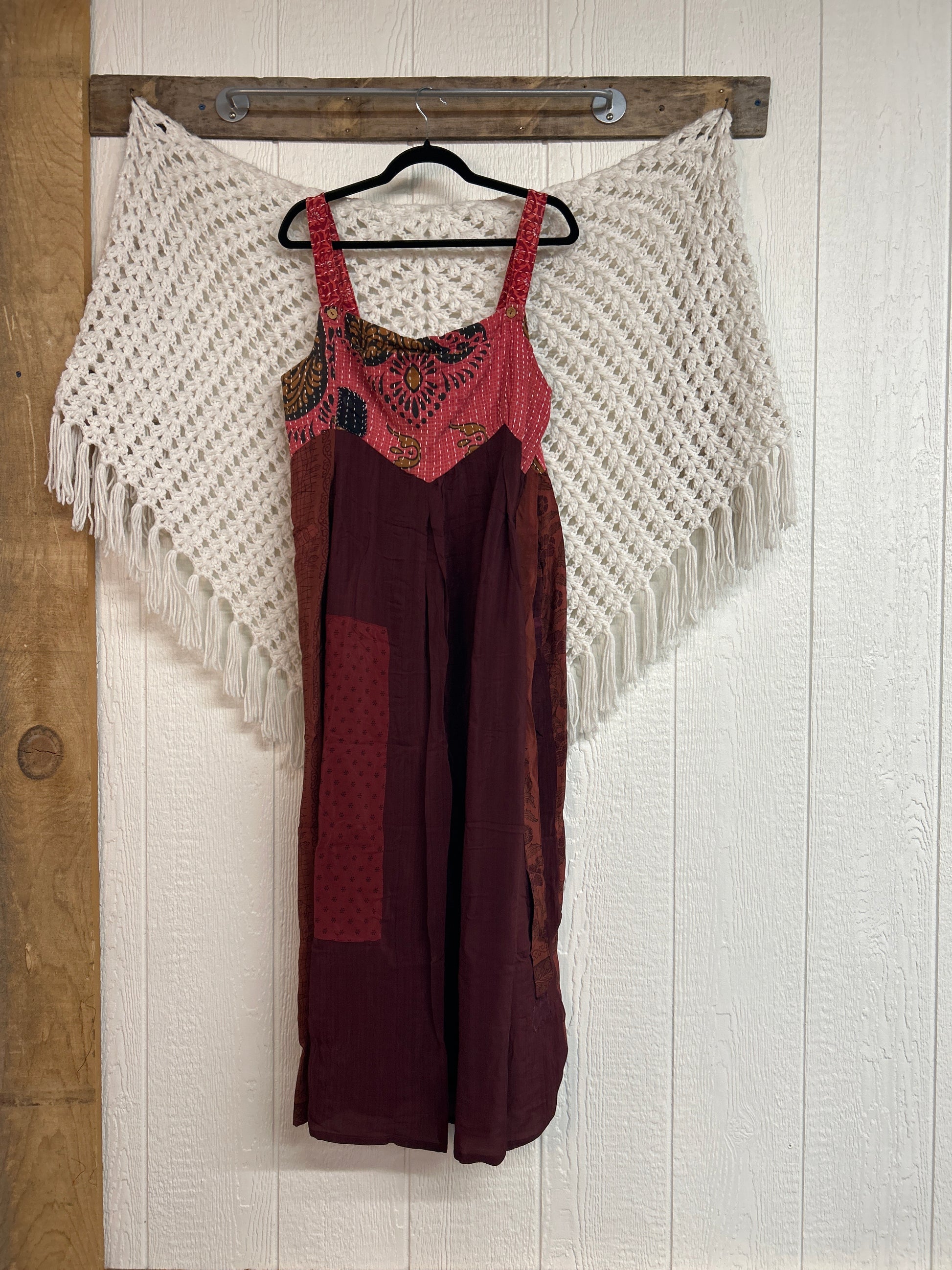 Perfect for EVERY season this overall dress features a kantha bib front with center pocket, adjustable button straps, tie back, crepe skirt and interior pockets on the skirt.