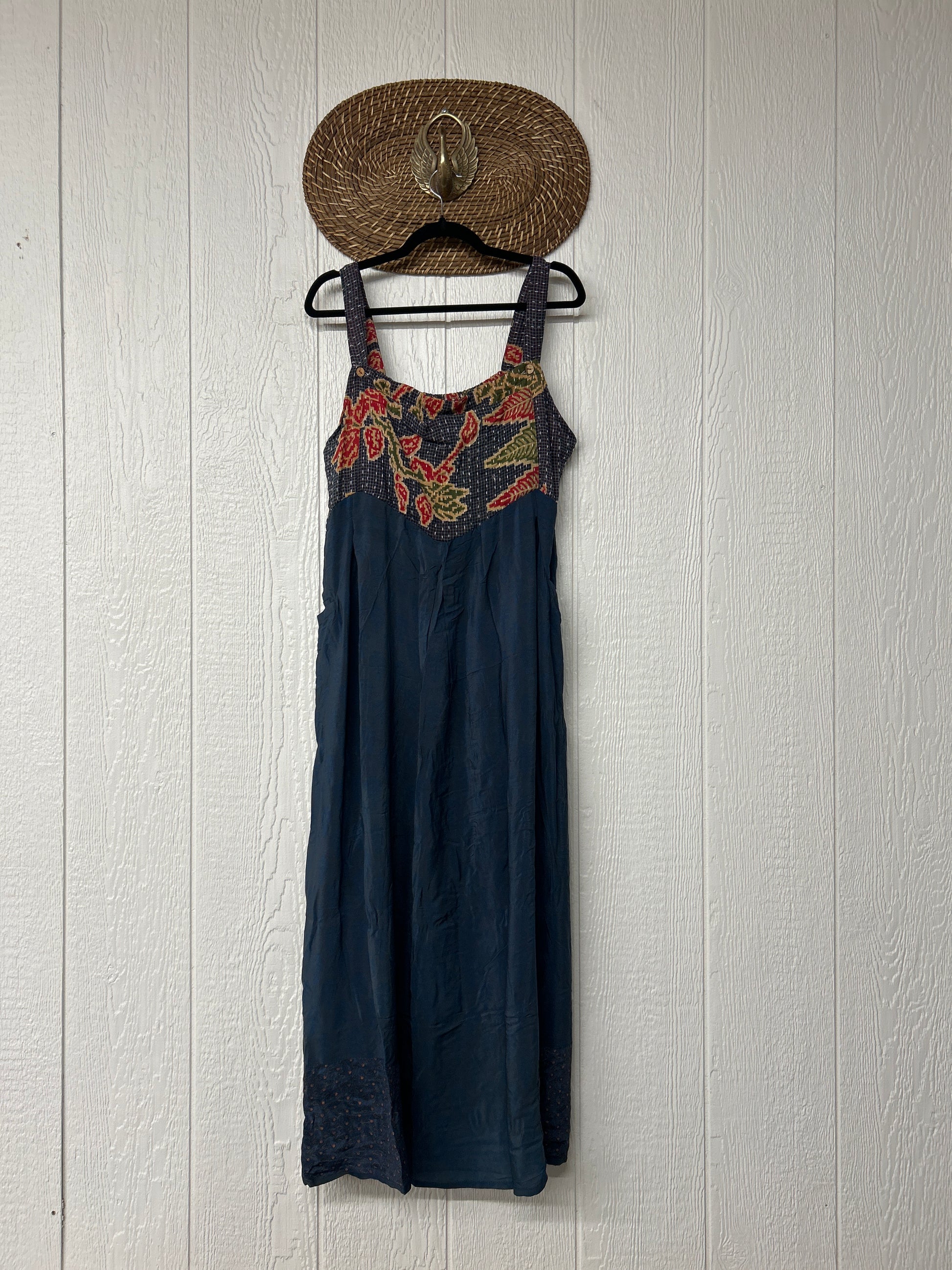 Perfect for EVERY season this overall dress features a kantha bib front with center pocket, adjustable button straps, tie back, crepe skirt and interior pockets on the skirt.