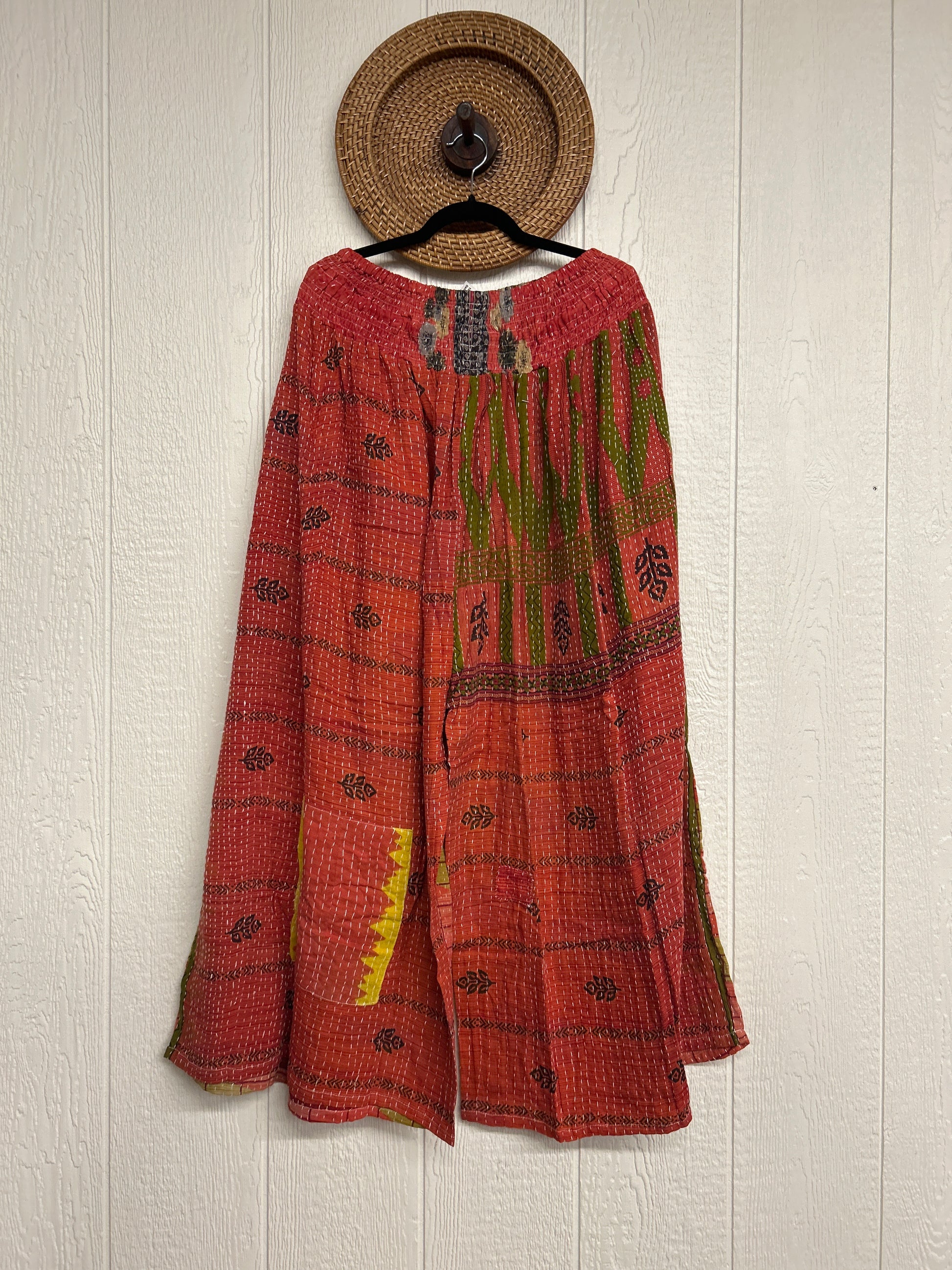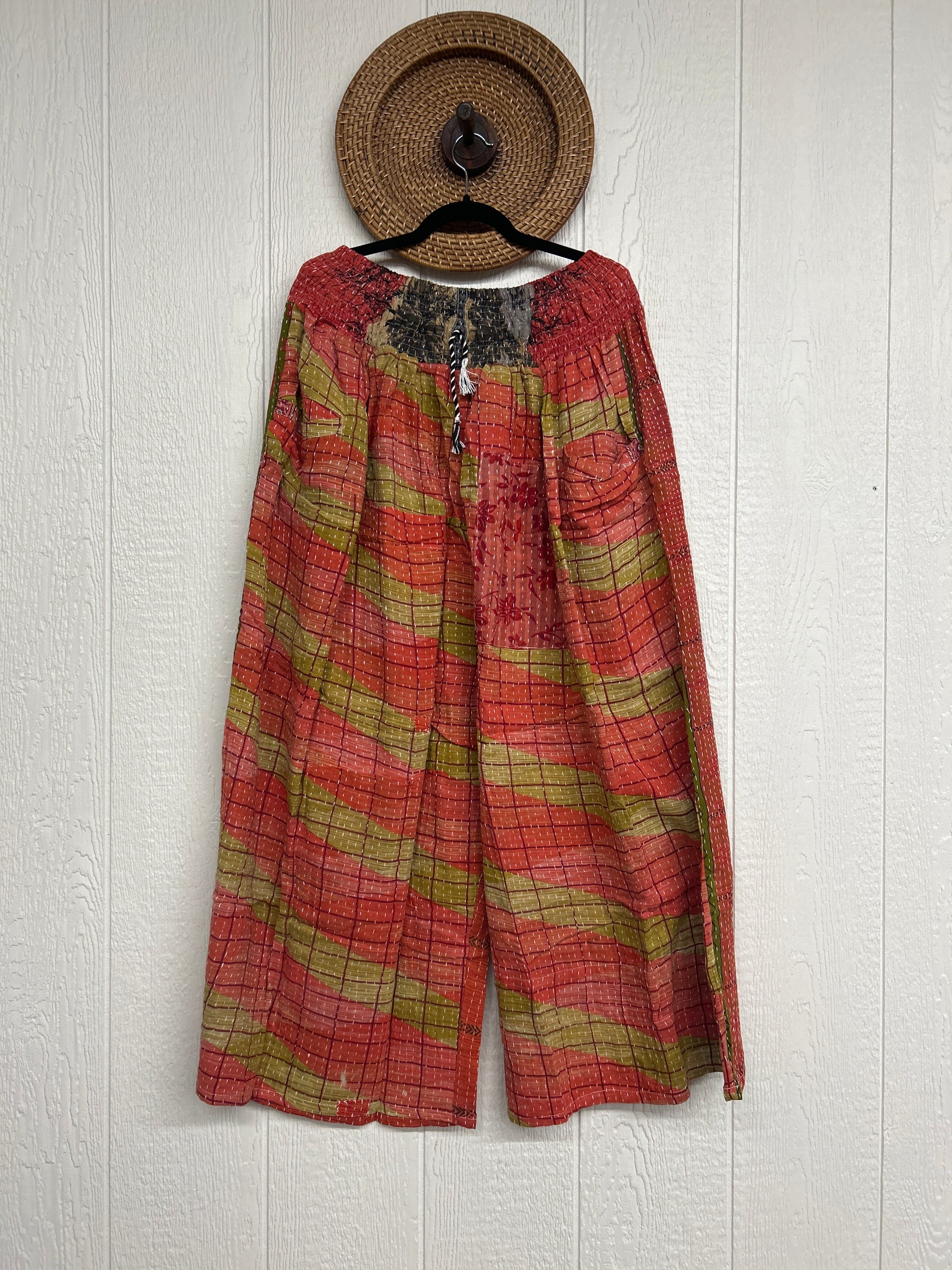 Crafted from vintage cotton kantha stitched sari these pants feature wide legs, pleating, interior pockets, and a stetchy waistband with a drawstring.