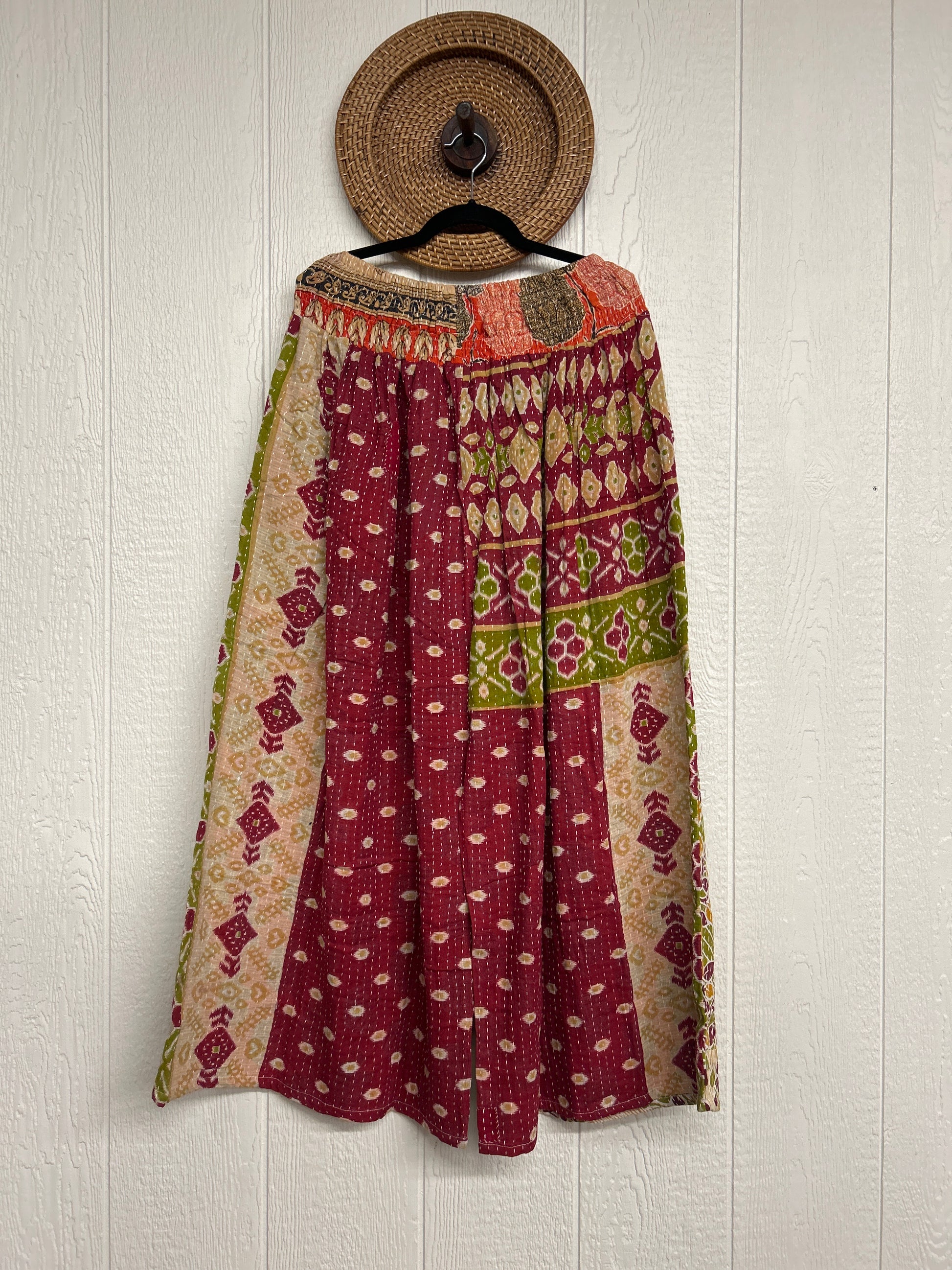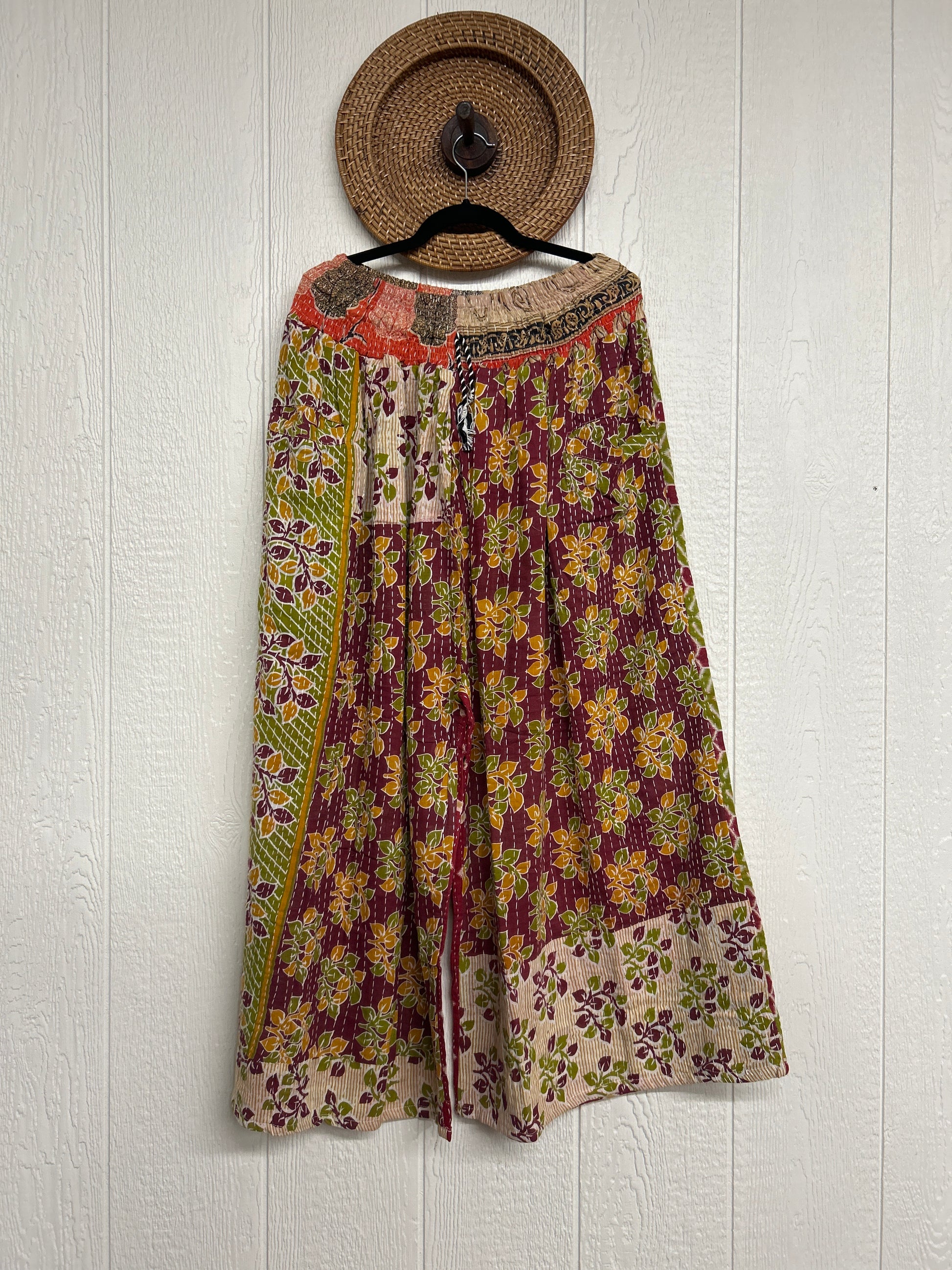 Crafted from vintage cotton kantha stitched sari these pants feature wide legs, pleating, interior pockets, and a stetchy waistband with a drawstring.