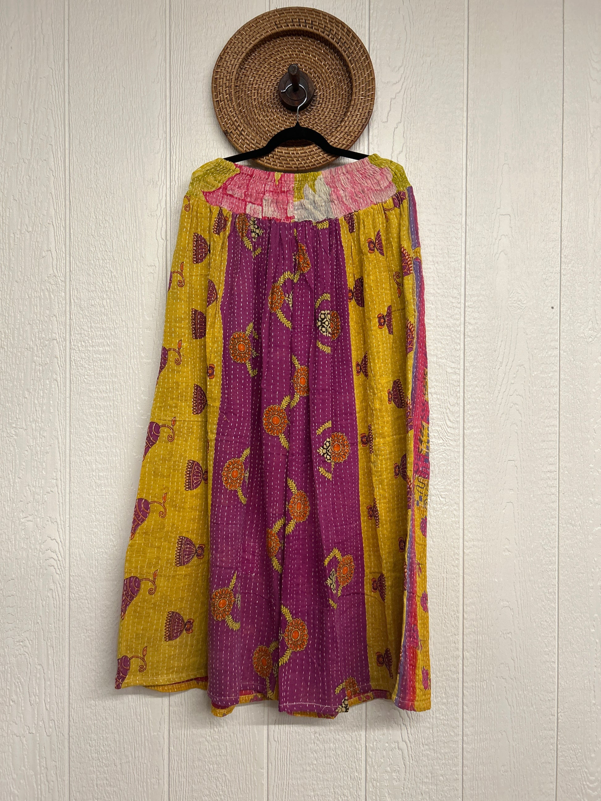 Crafted from vintage cotton kantha stitched sari these pants feature wide legs, pleating, interior pockets, and a stetchy waistband with a drawstring.