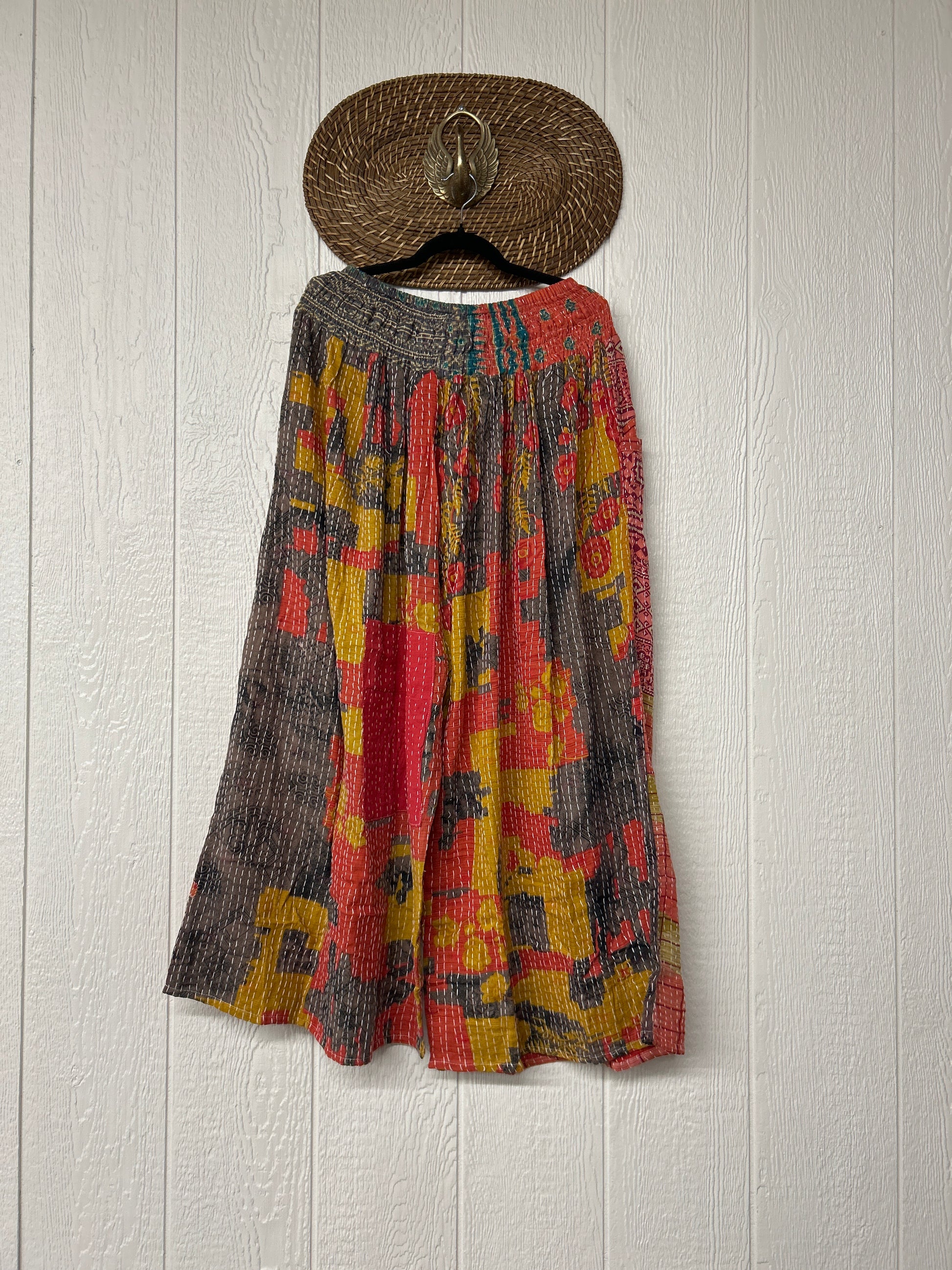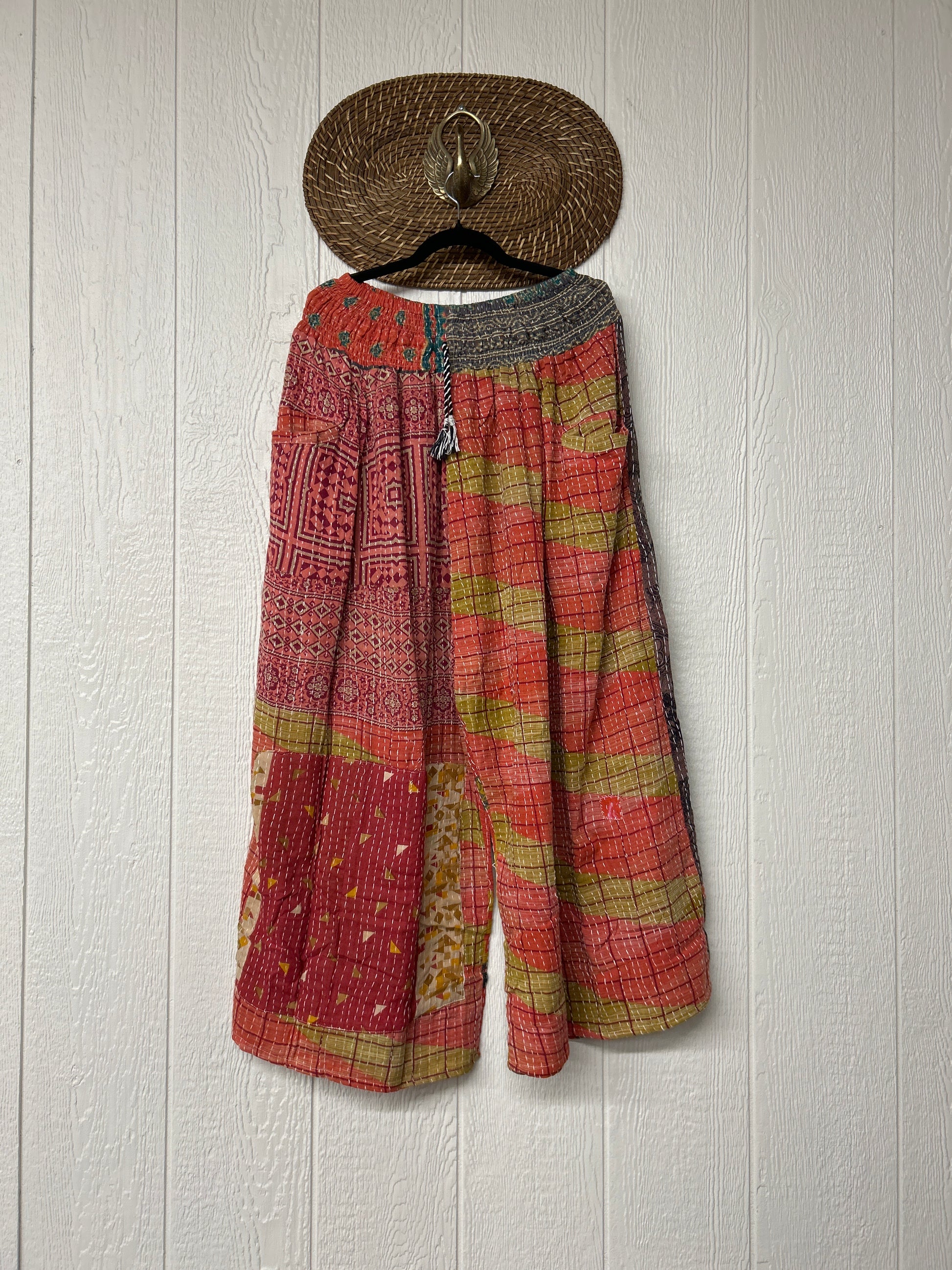 Crafted from vintage cotton kantha stitched sari these pants feature wide legs, pleating, interior pockets, and a stetchy waistband with a drawstring.
