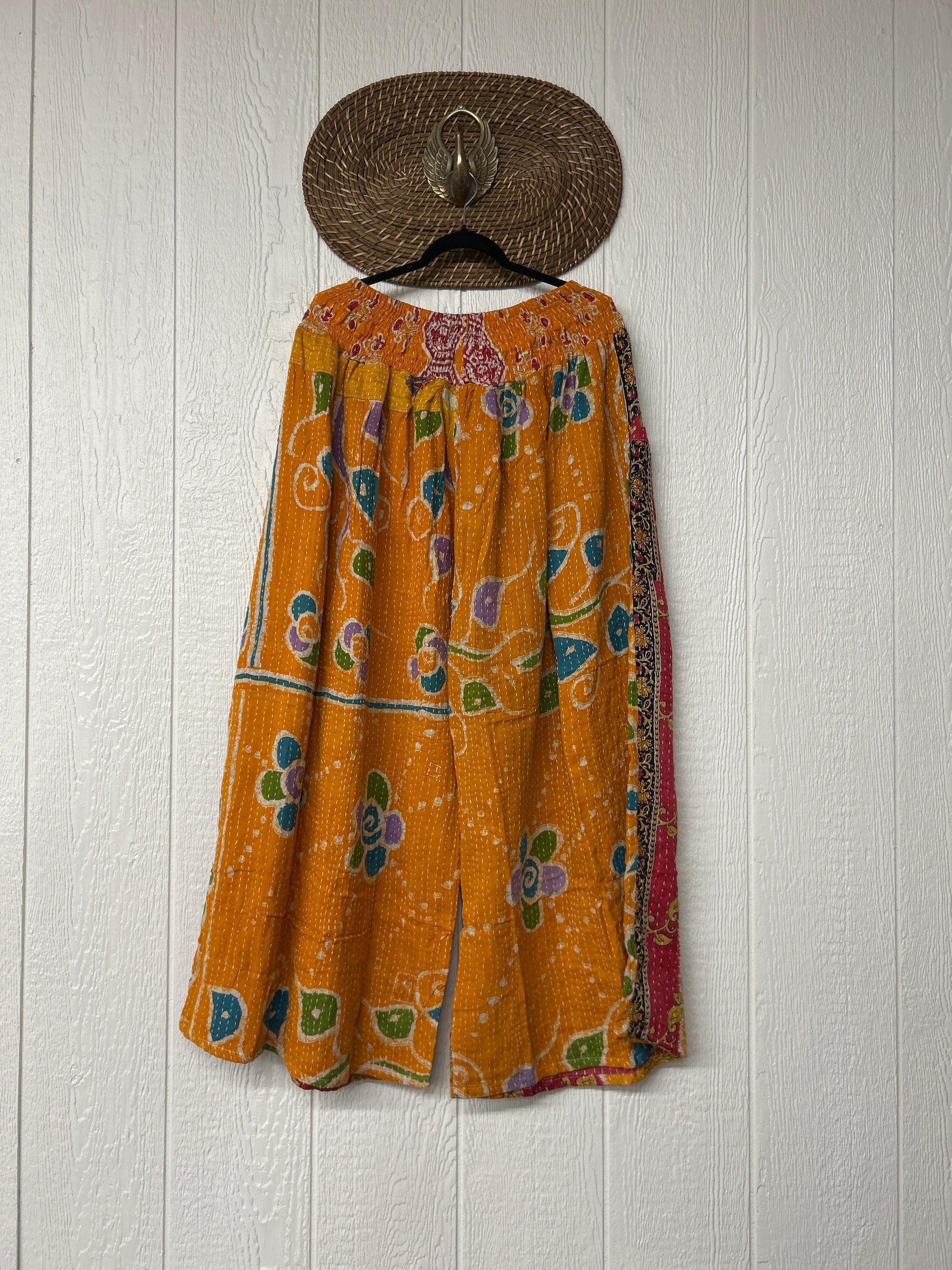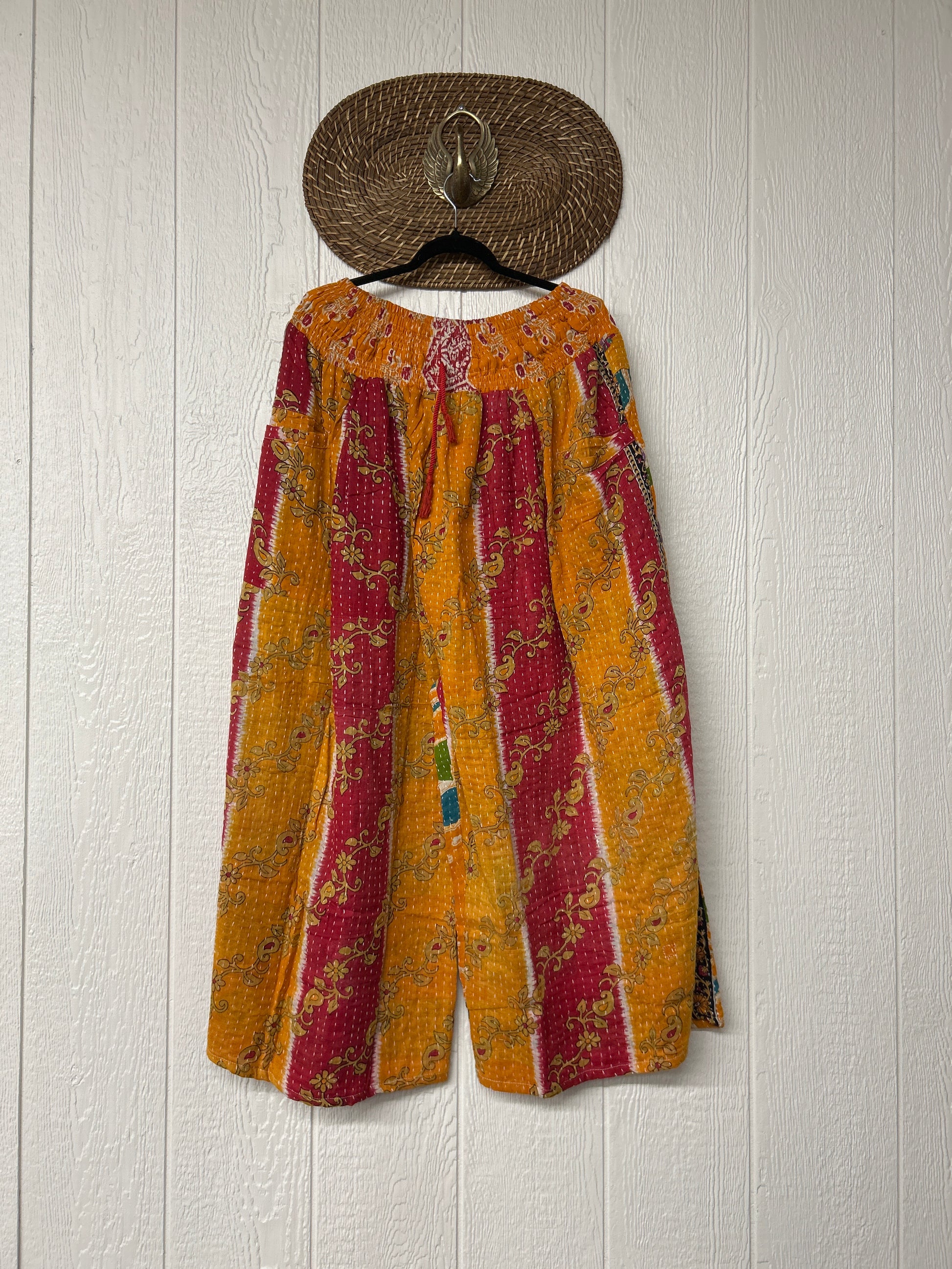 Crafted from vintage cotton kantha stitched sari these pants feature wide legs, pleating, interior pockets, and a stetchy waistband with a drawstring.
