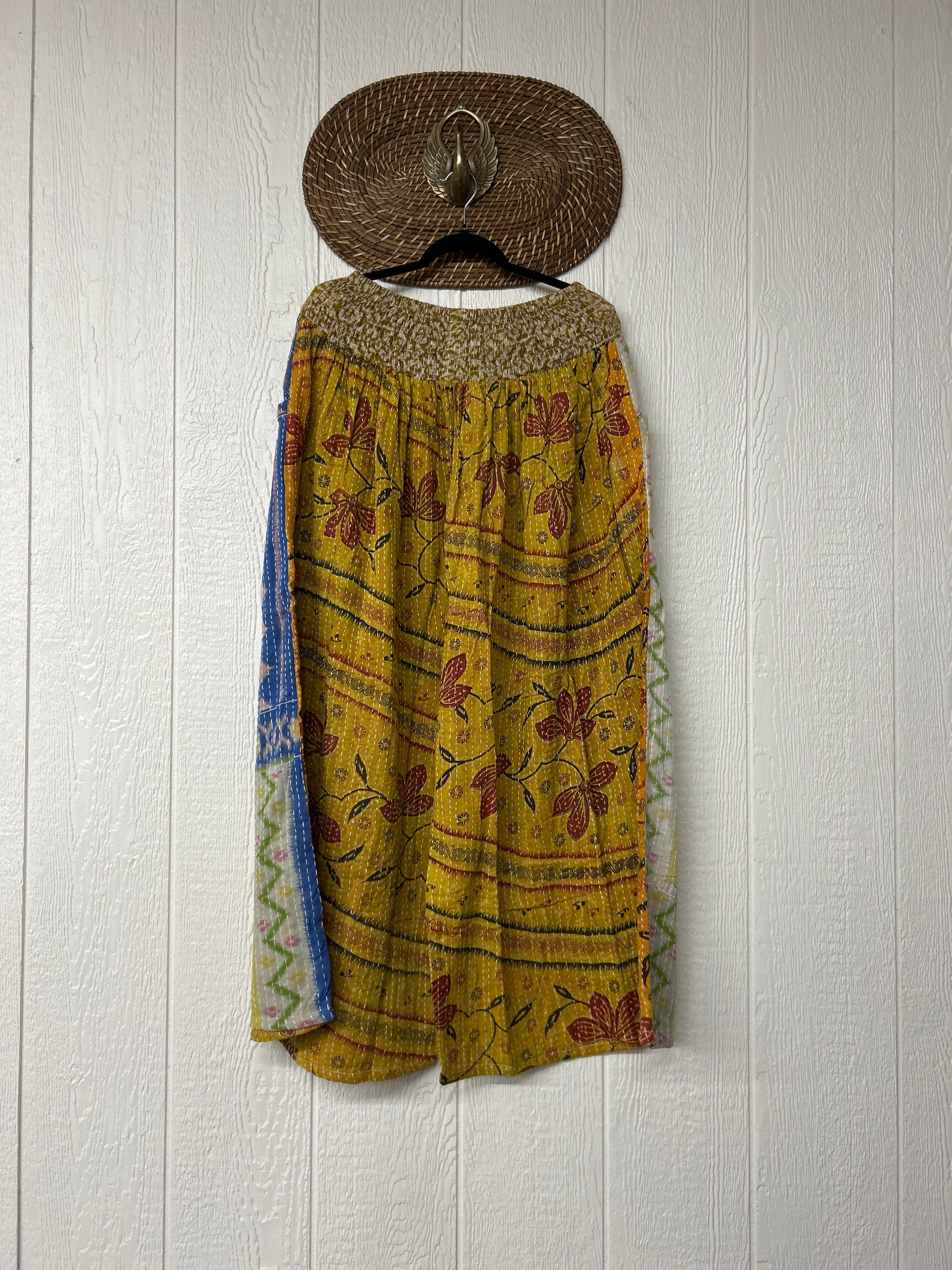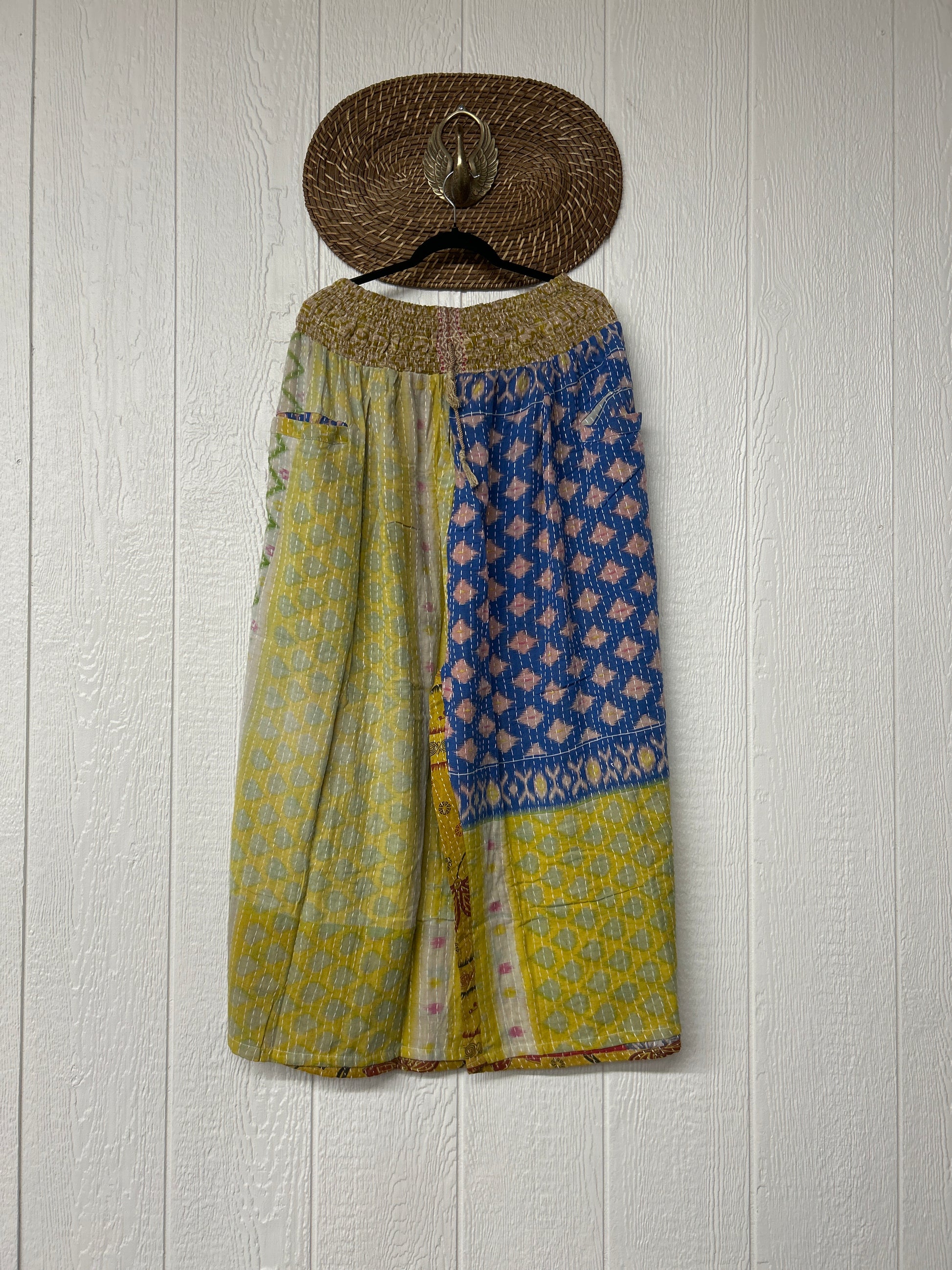 Crafted from vintage cotton kantha stitched sari these pants feature wide legs, pleating, interior pockets, and a stetchy waistband with a drawstring.