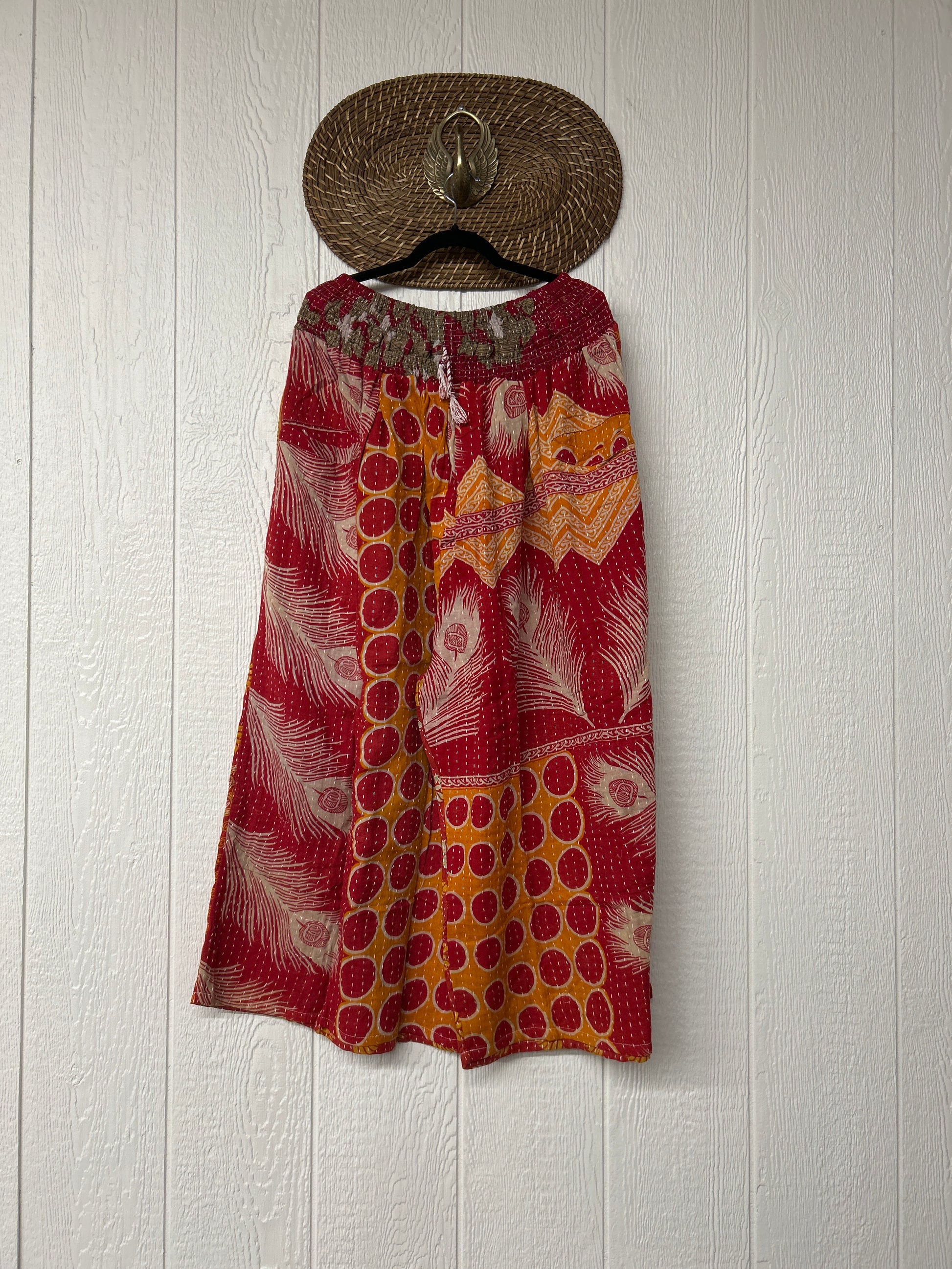 Crafted from vintage cotton kantha stitched sari these pants feature wide legs, pleating, interior pockets, and a stetchy waistband with a drawstring.