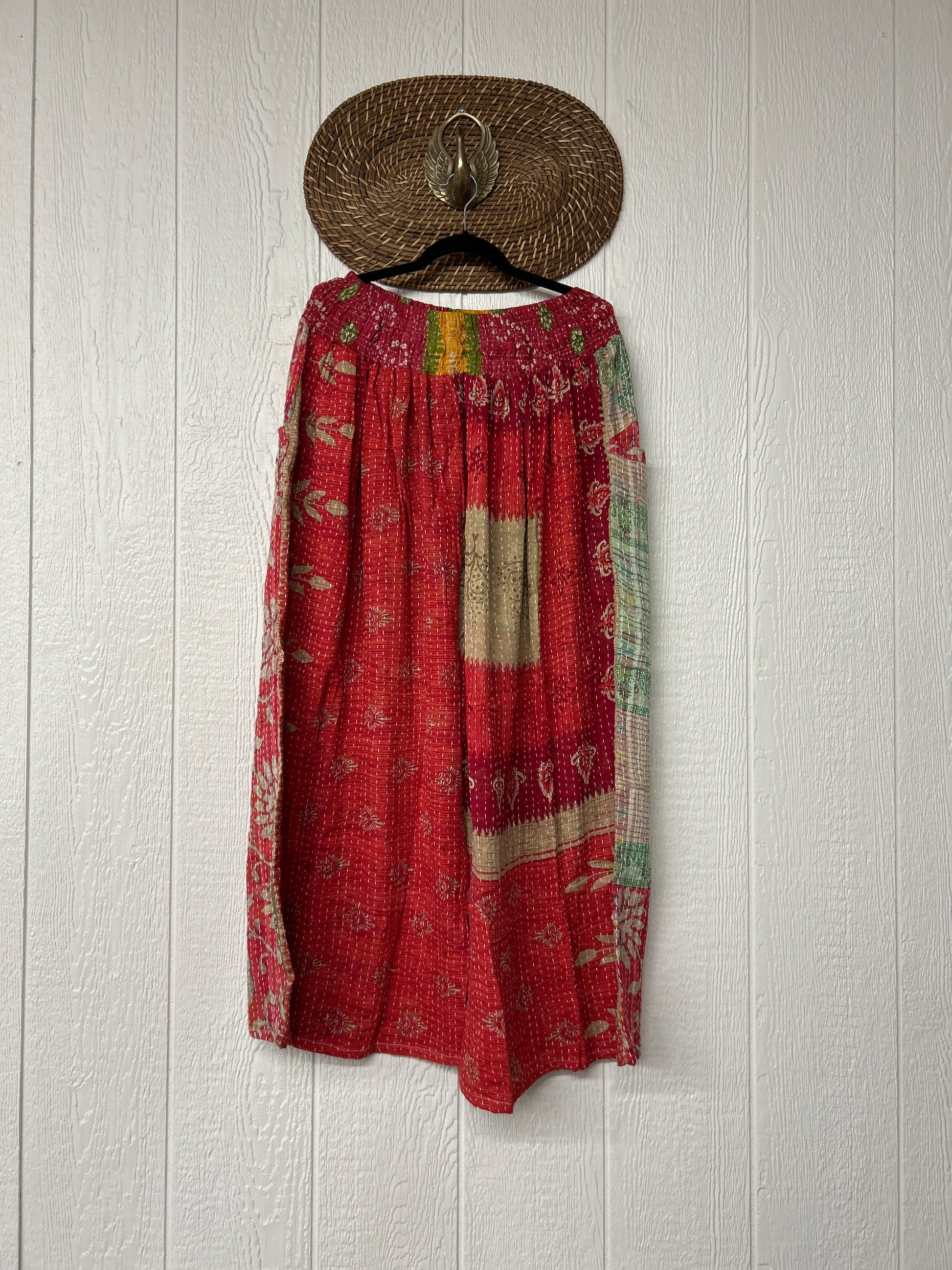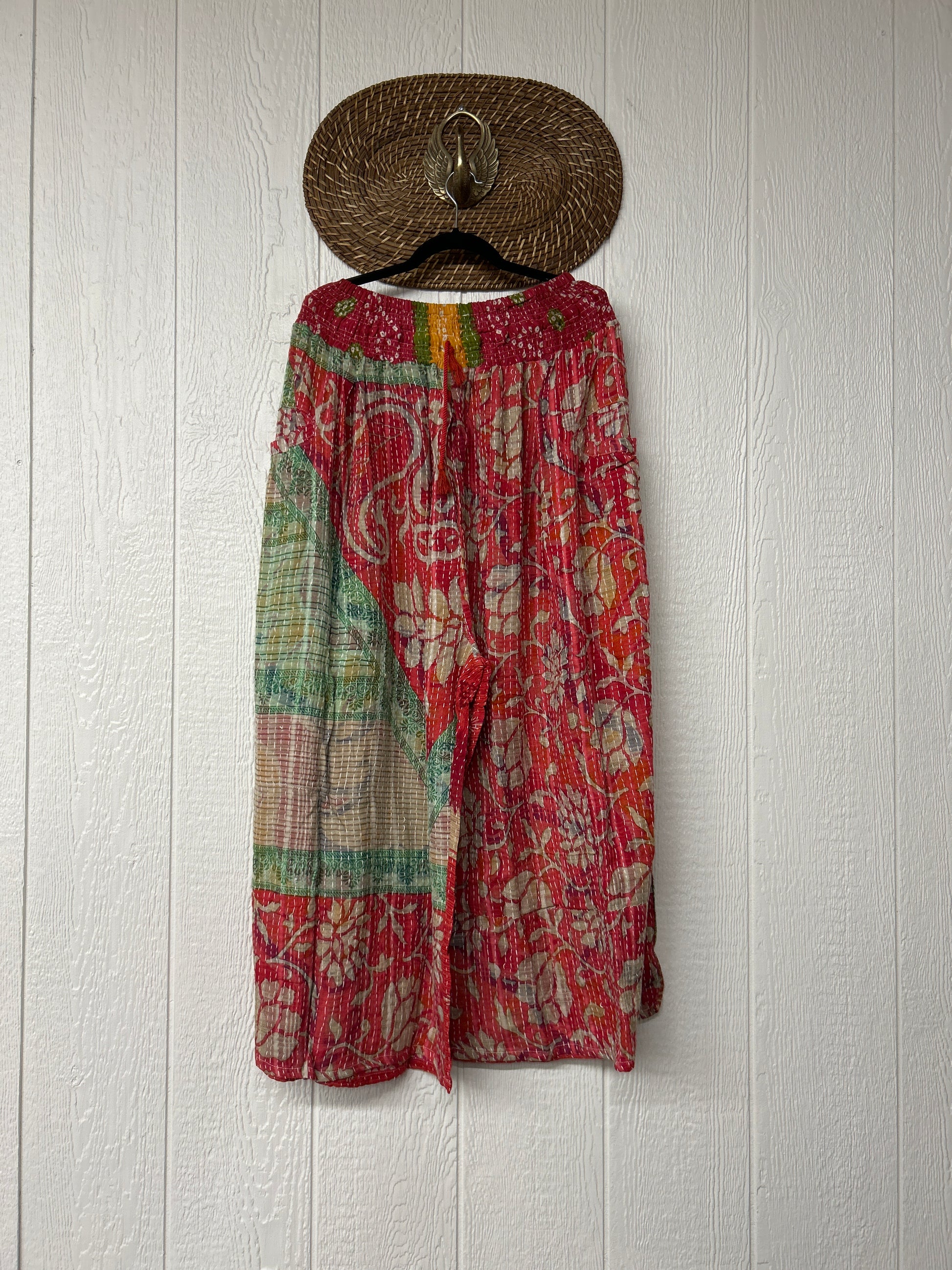 Crafted from vintage cotton kantha stitched sari these pants feature wide legs, pleating, interior pockets, and a stetchy waistband with a drawstring.