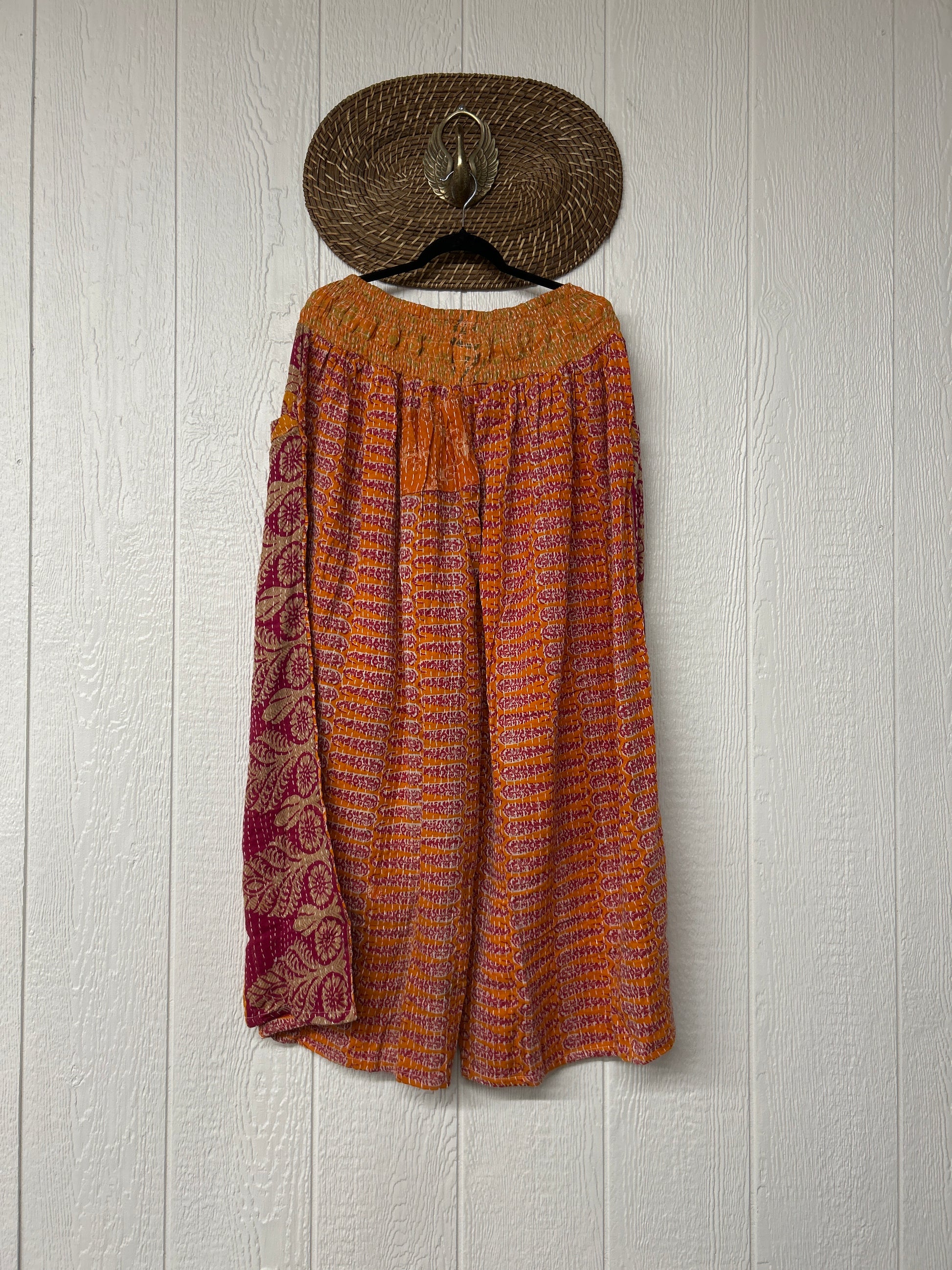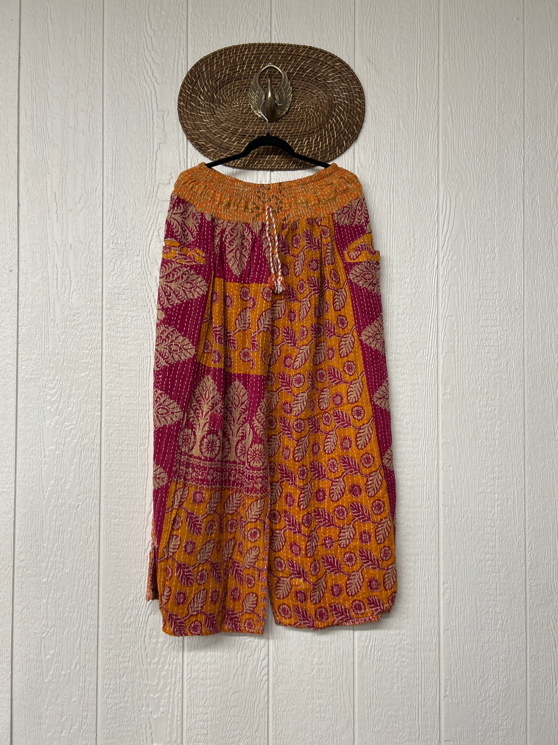 Crafted from vintage cotton kantha stitched sari these pants feature wide legs, pleating, interior pockets, and a stetchy waistband with a drawstring.