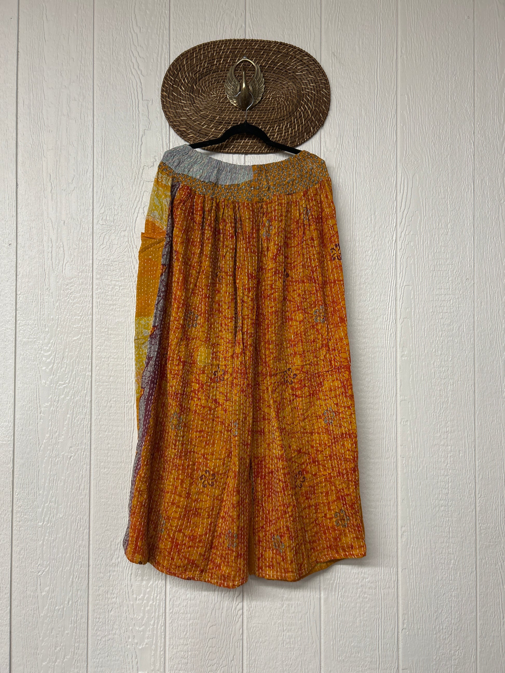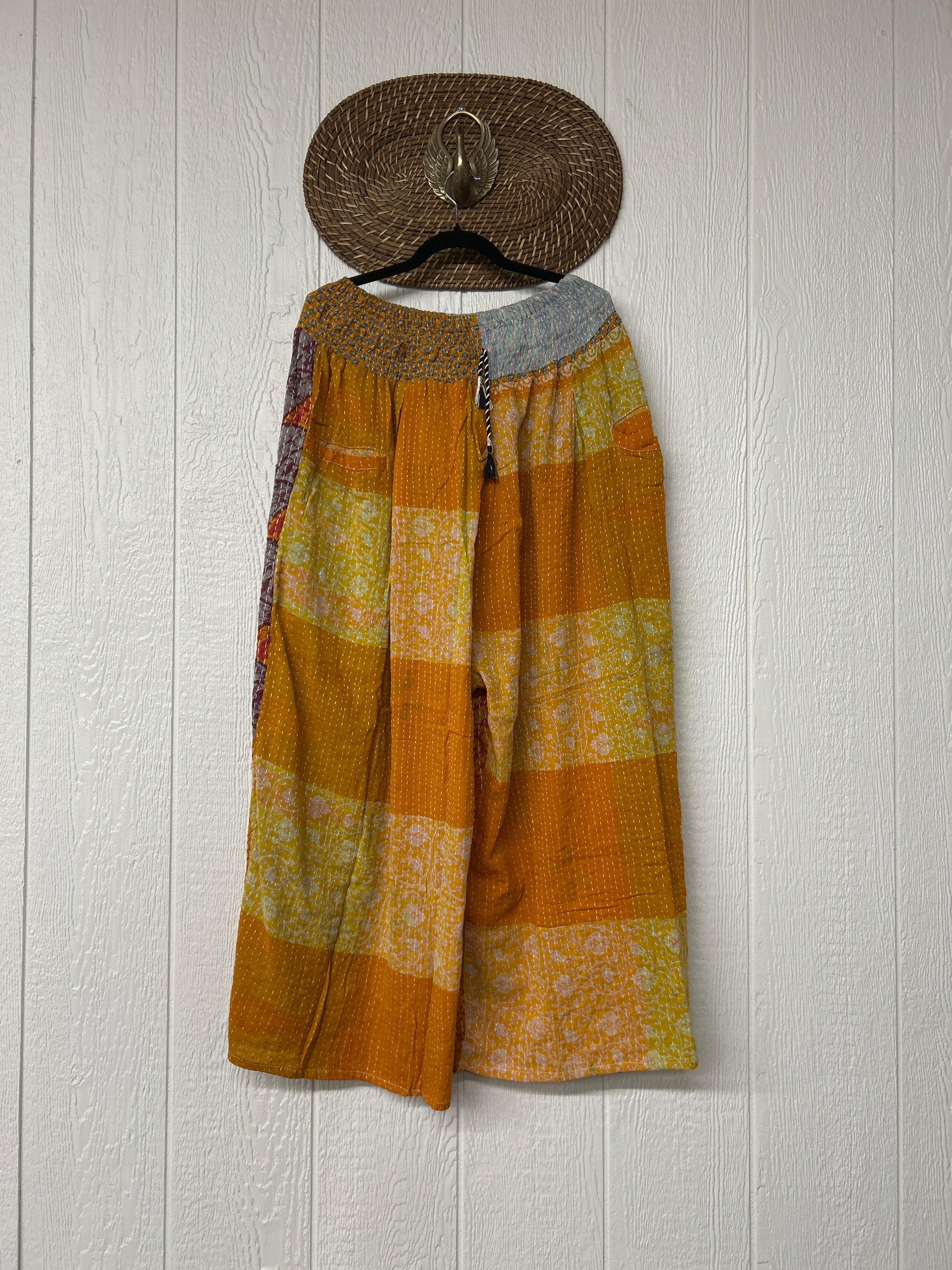Crafted from vintage cotton kantha stitched sari these pants feature wide legs, pleating, interior pockets, and a stetchy waistband with a drawstring.