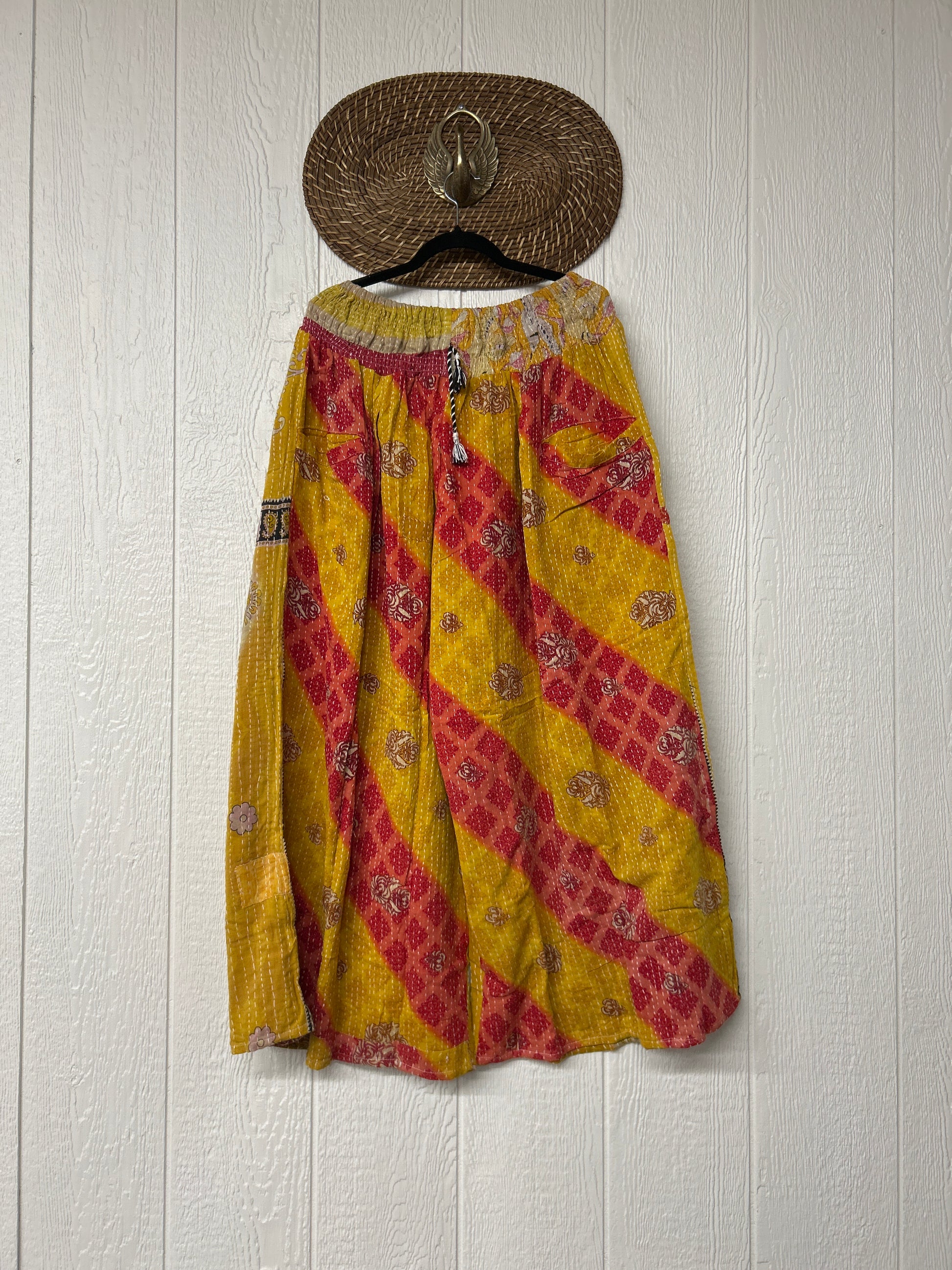 Crafted from vintage cotton kantha stitched sari these pants feature wide legs, pleating, interior pockets, and a stetchy waistband with a drawstring.