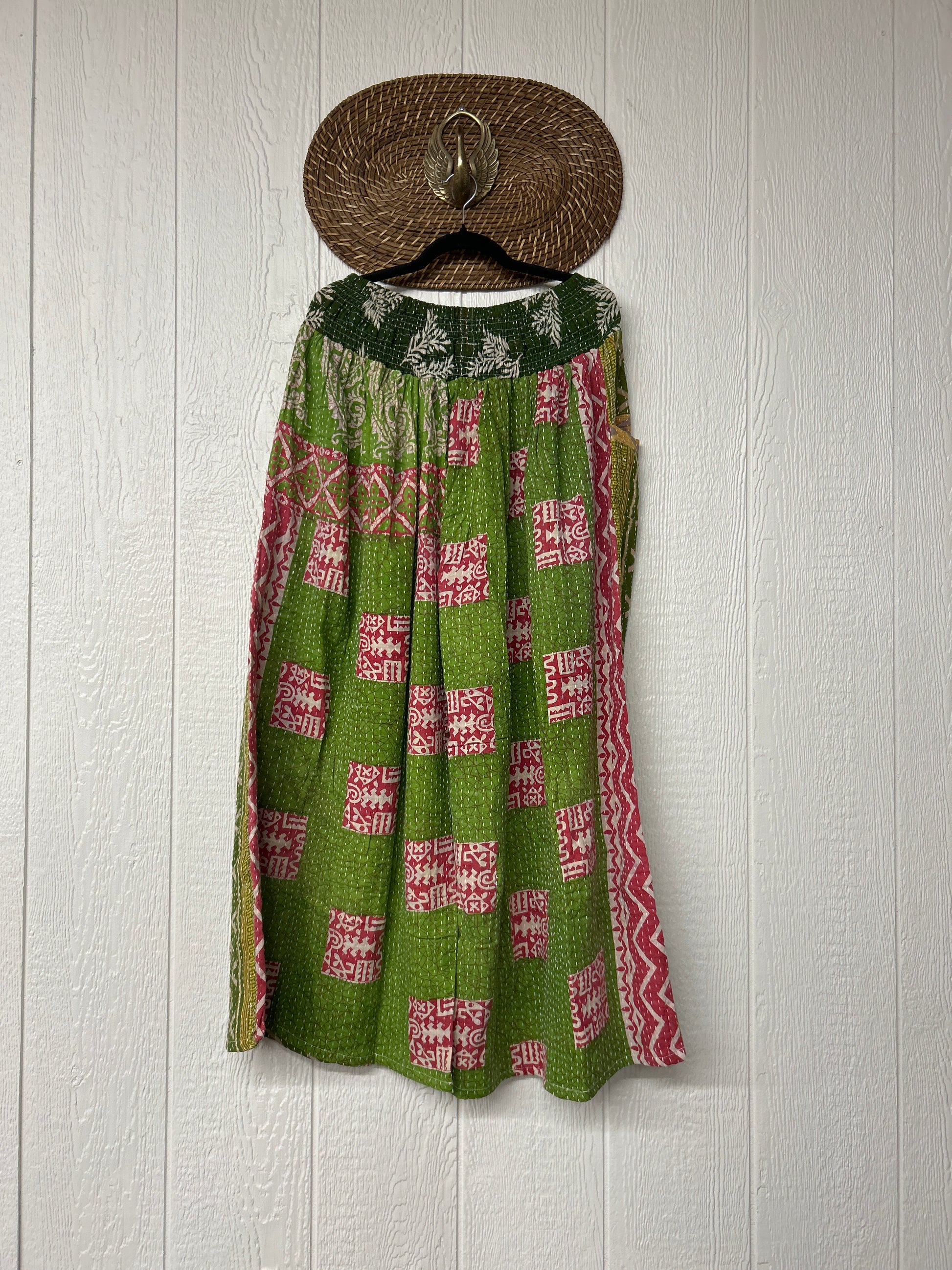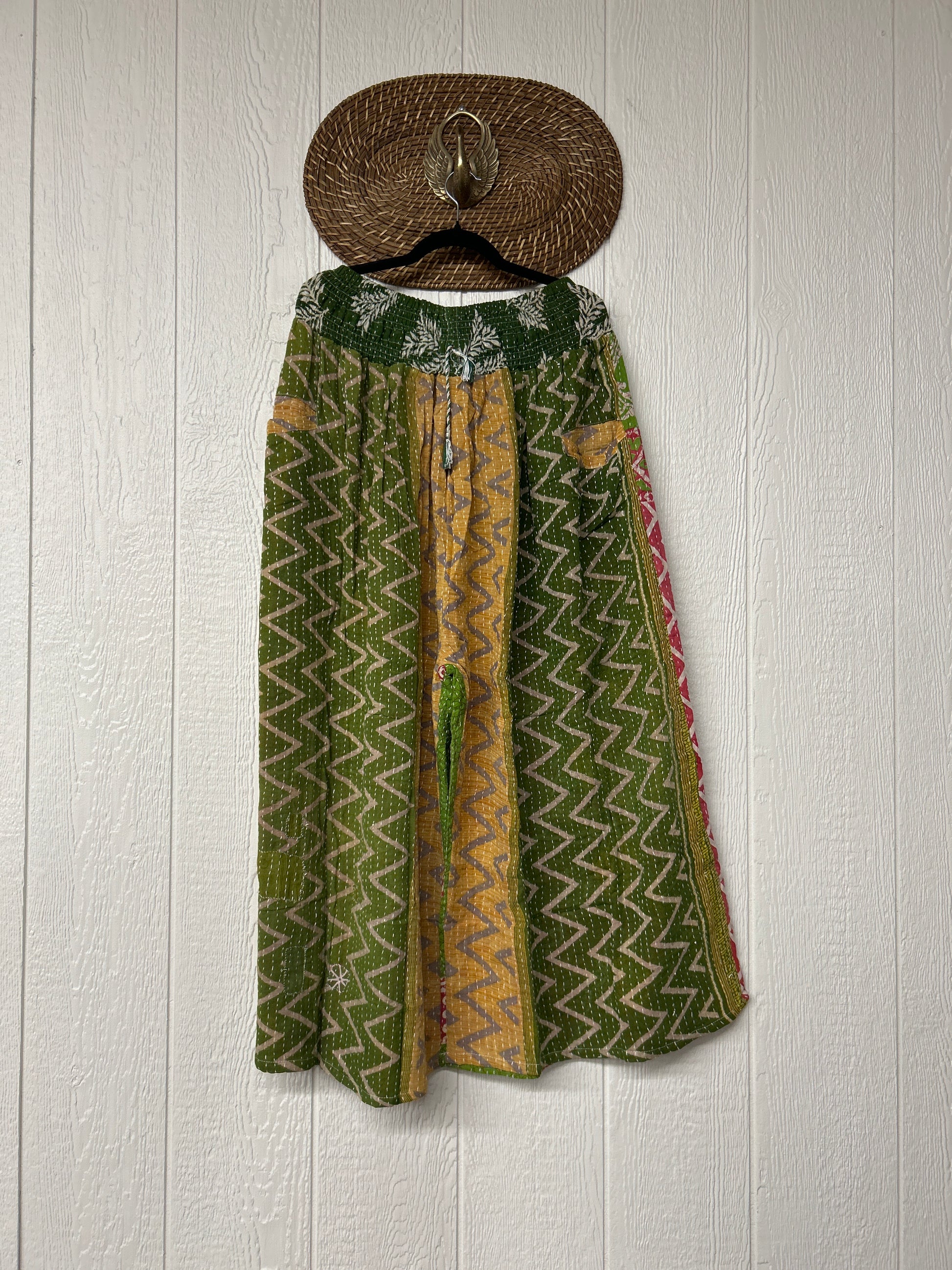 Crafted from vintage cotton kantha stitched sari these pants feature wide legs, pleating, interior pockets, and a stetchy waistband with a drawstring.