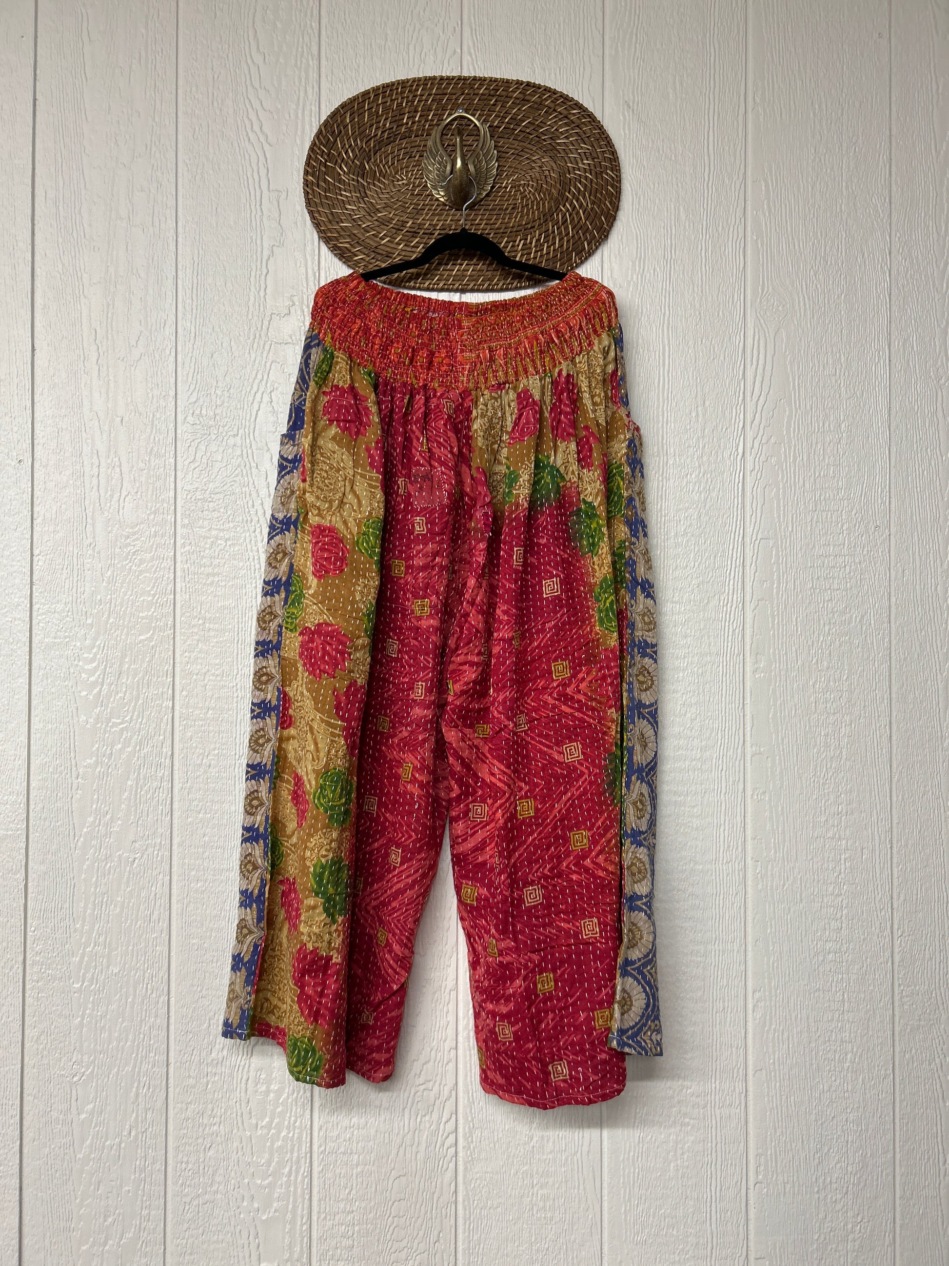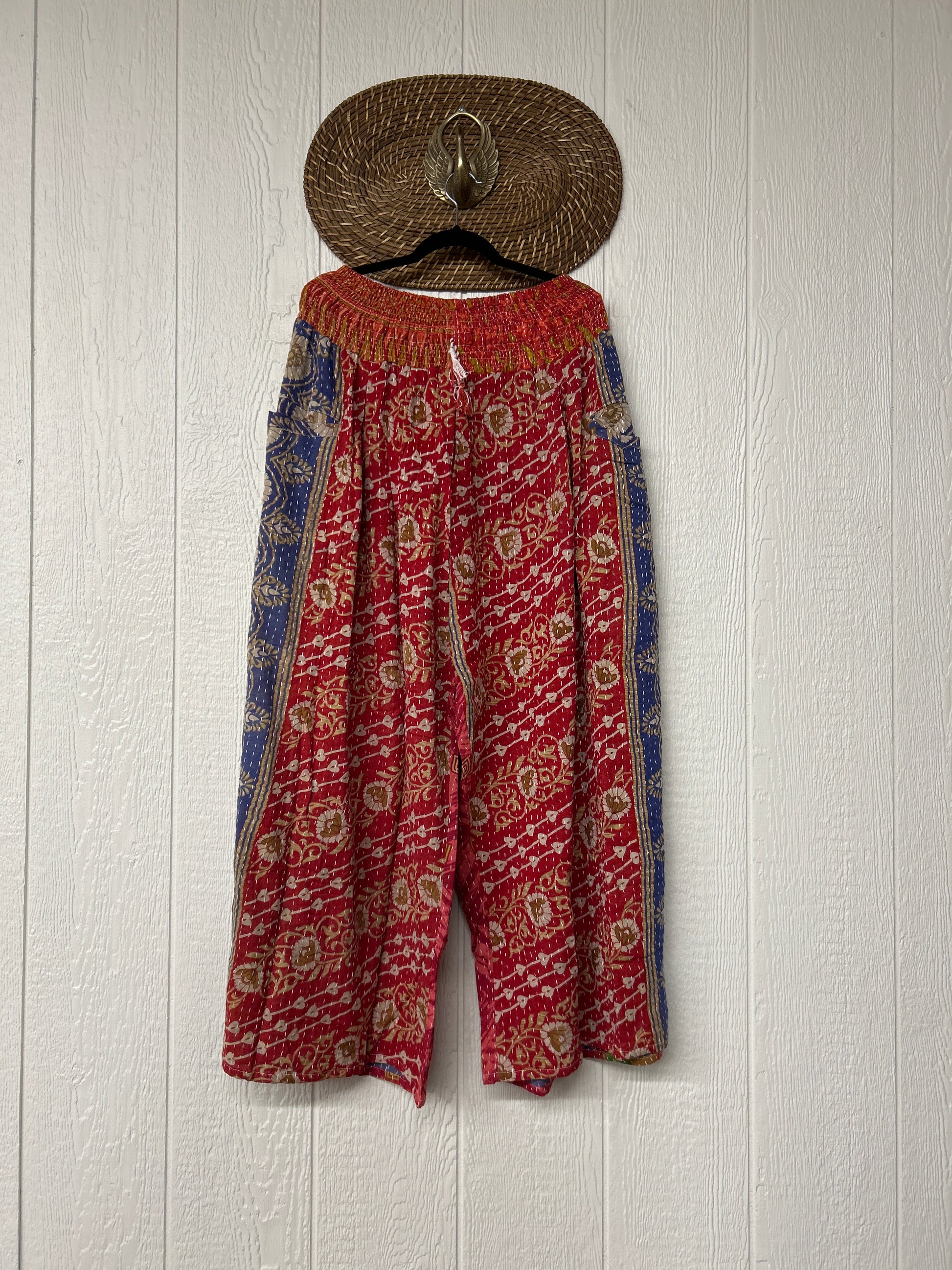 Crafted from vintage cotton kantha stitched sari these pants feature wide legs, pleating, interior pockets, and a stetchy waistband with a drawstring.