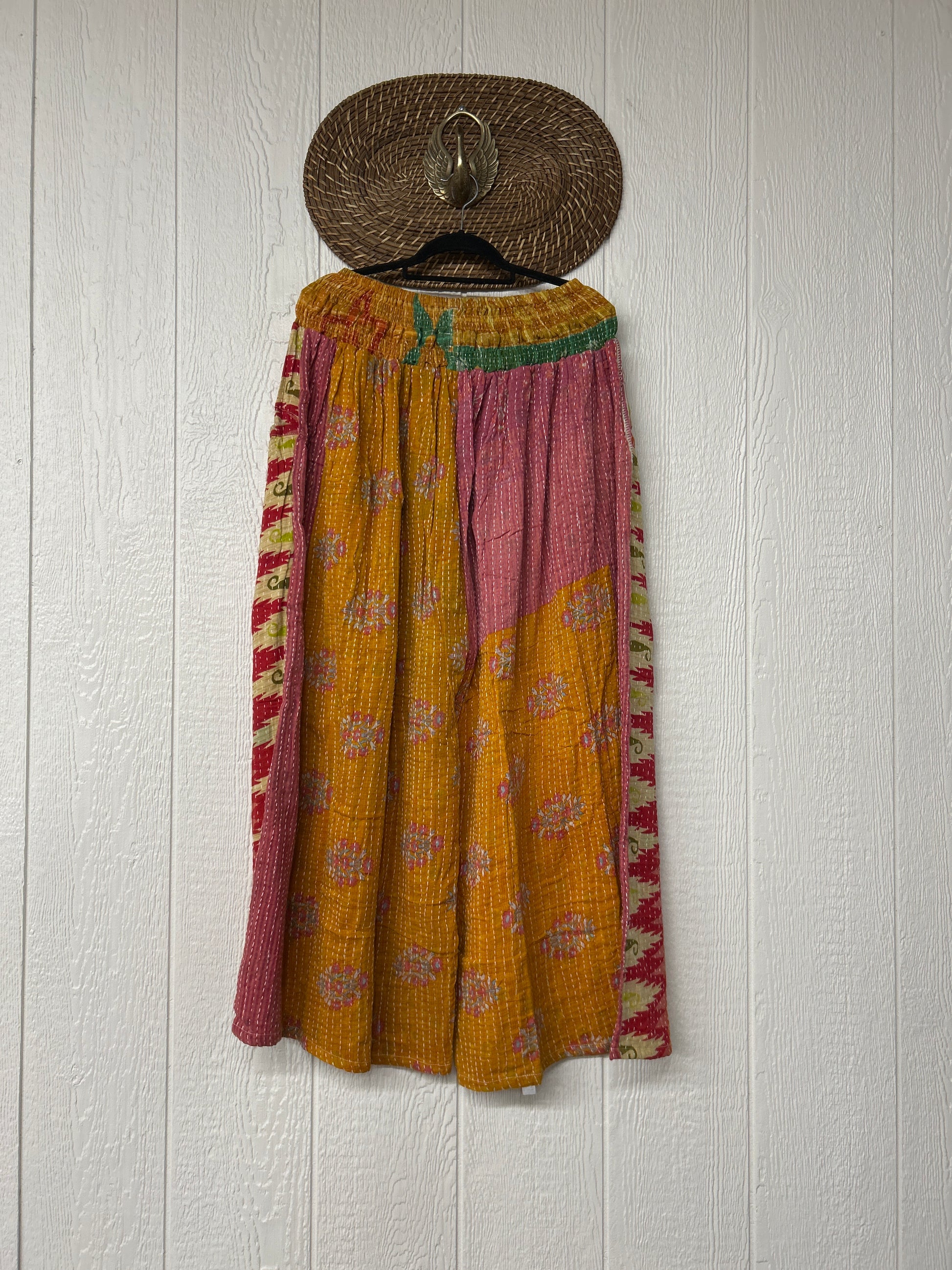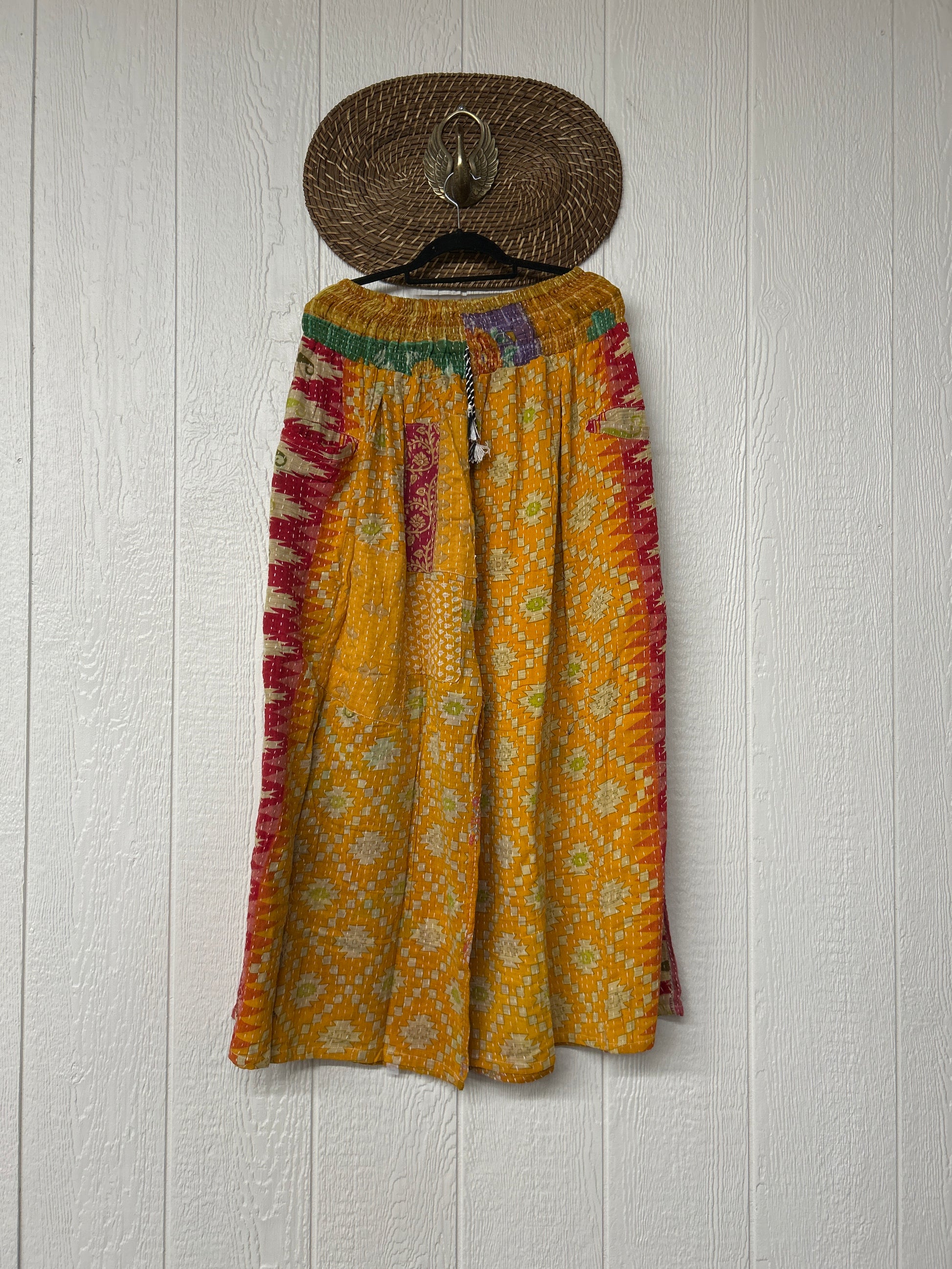 Crafted from vintage cotton kantha stitched sari these pants feature wide legs, pleating, interior pockets, and a stetchy waistband with a drawstring.