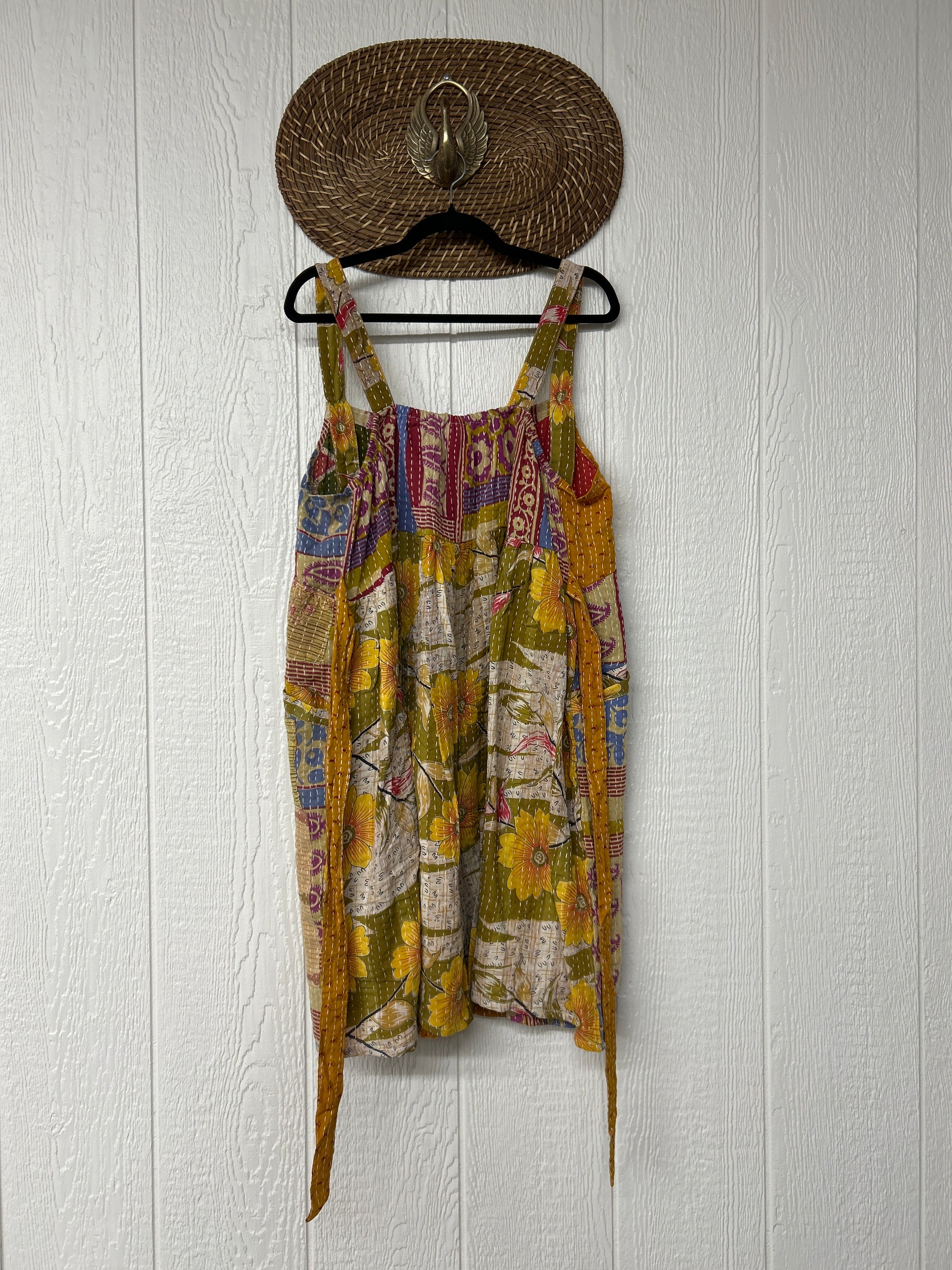 Fabrics may have small threads or holes in the layers. Color inconsistency or small stains may be present. The saris are sewn together and extend the life of each design.