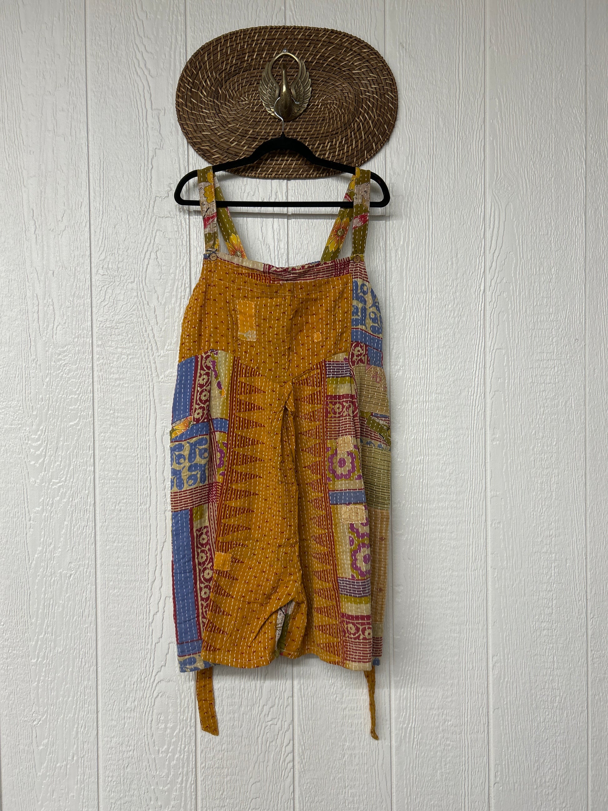 Features adjustable button straps, deep interior pockets, front bib pocket and short length.