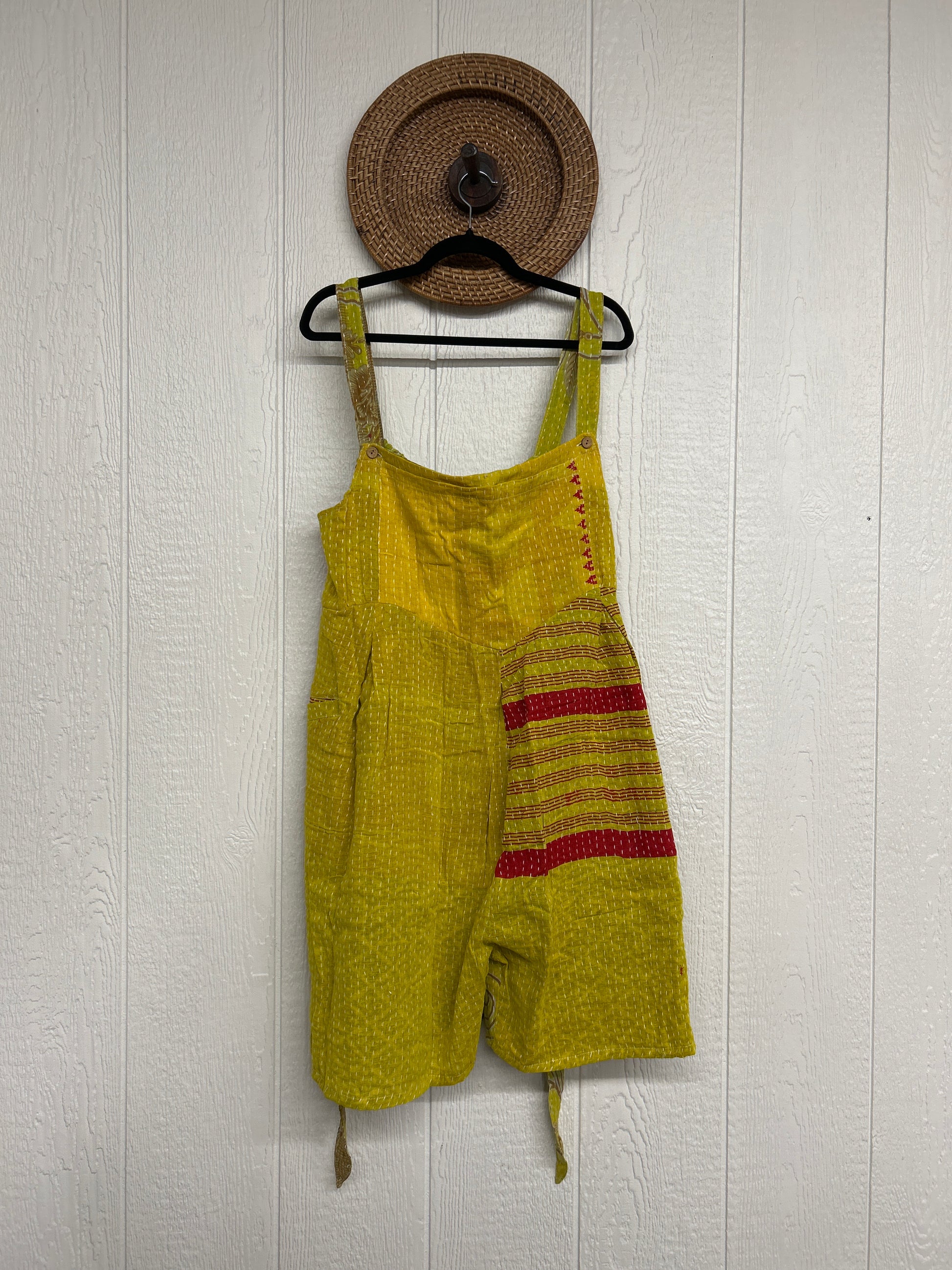Features adjustable button straps, deep interior pockets, front bib pocket and short length.