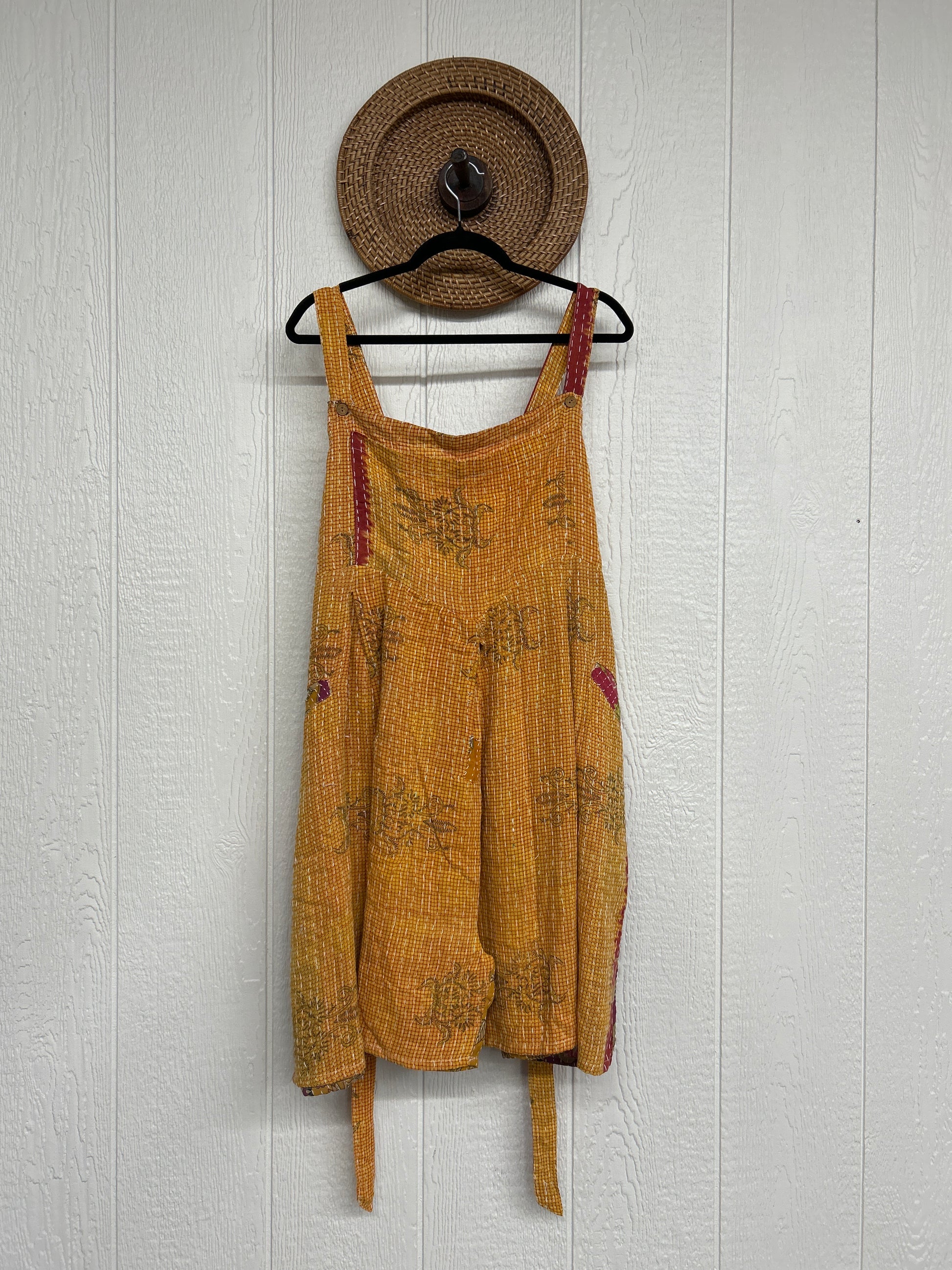 Features adjustable button straps, deep interior pockets, front bib pocket and short length.