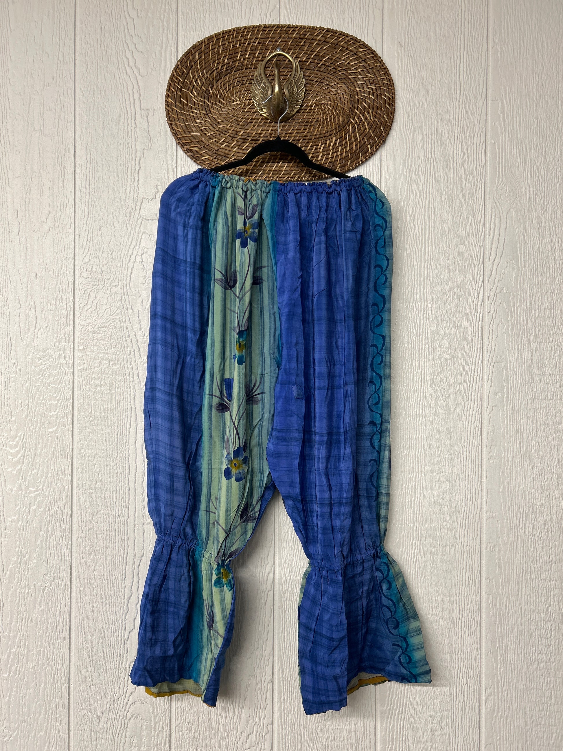 Crafted from vintage double crepe sari, these chic sari bloomers are reversible, featuring two big exterior pockets and interior pockets making them fully reversible. The waistband is magic and elastic featuring a drawstring for ultimate versatility.