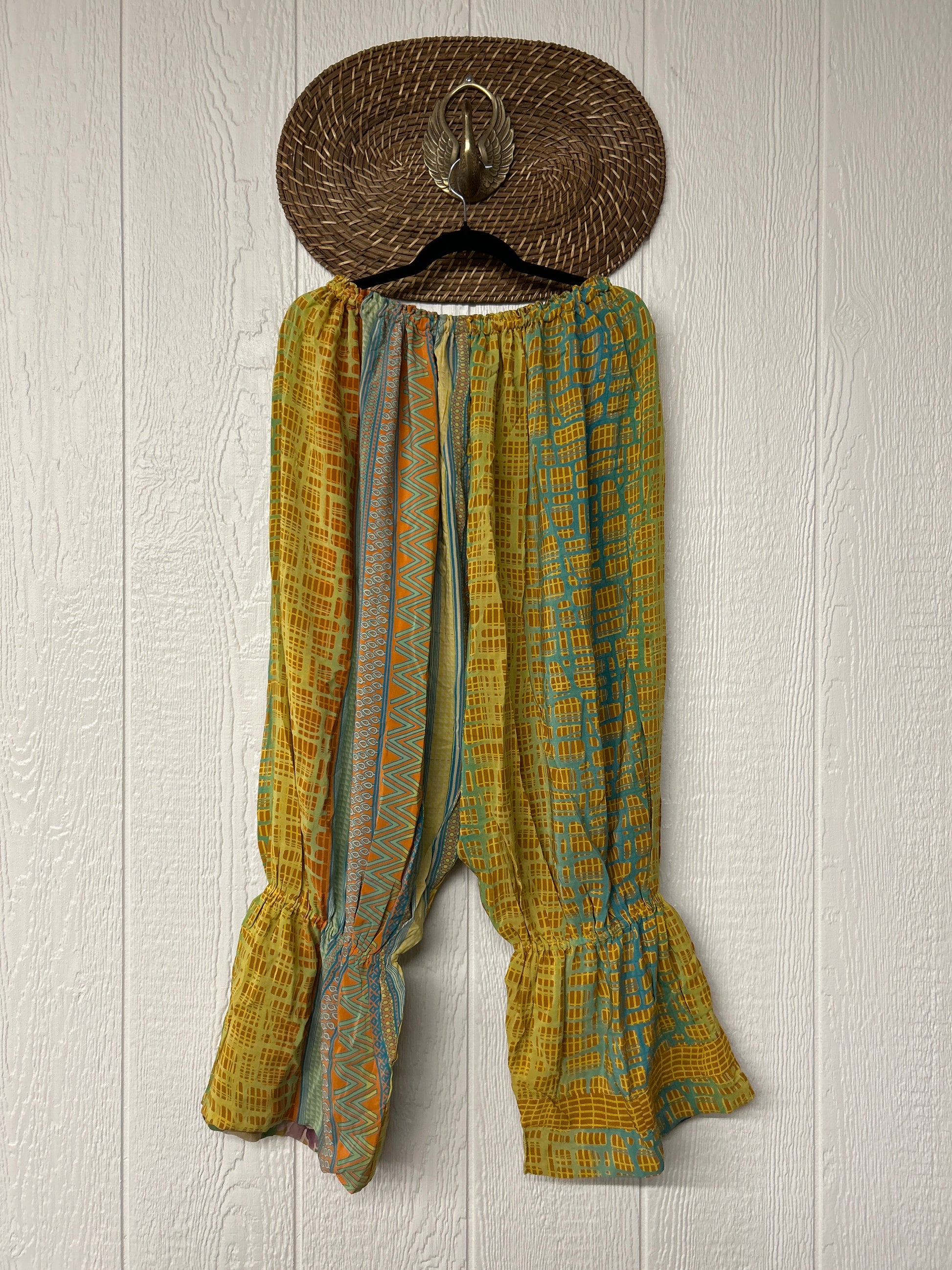 Crafted from vintage double crepe sari, these chic sari bloomers are reversible, featuring two big exterior pockets and interior pockets making them fully reversible. The waistband is magic and elastic featuring a drawstring for ultimate versatility.