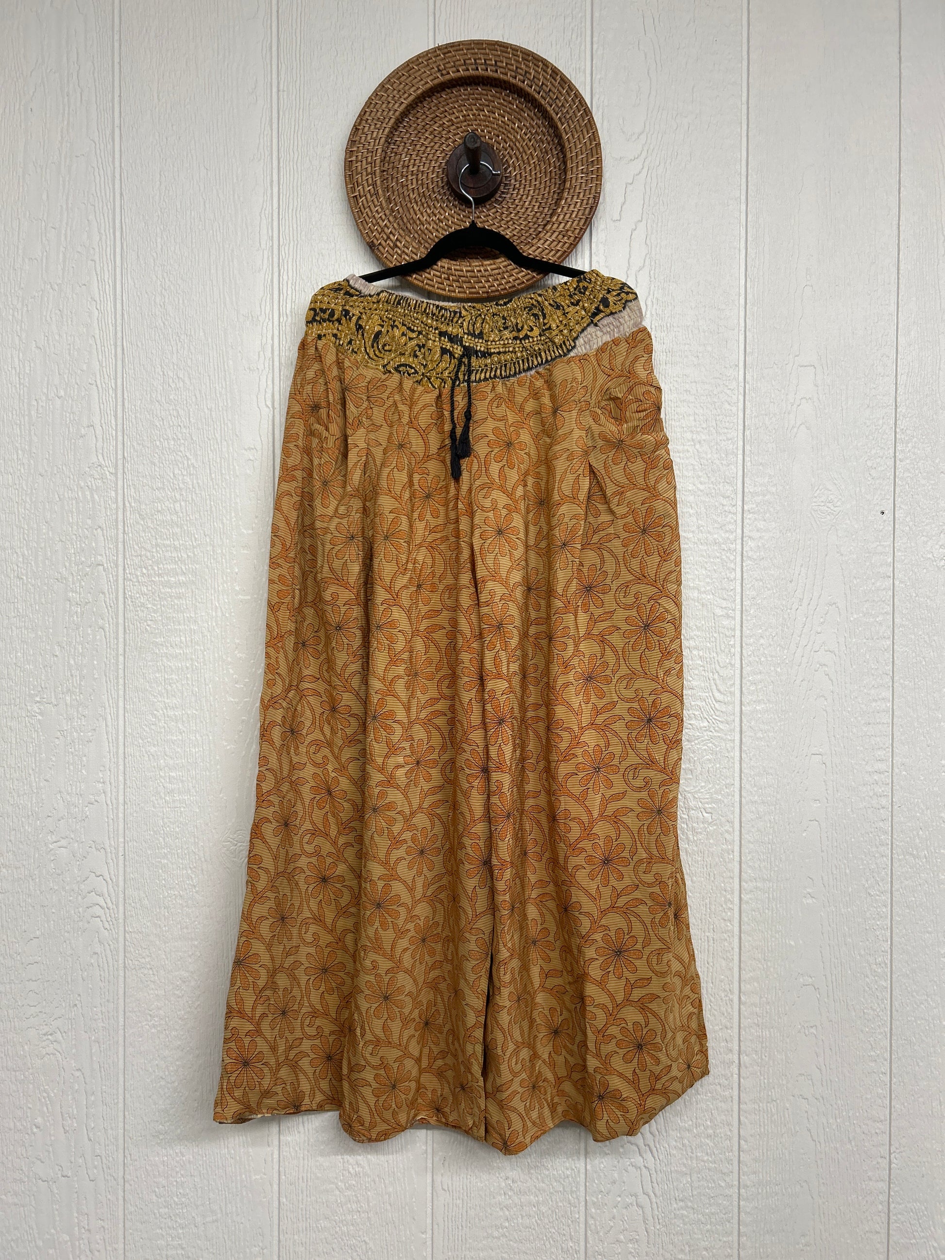 Crafted from vintage double crepe sari these pants feature wide legs, pleating, exterior and interior pockets making them fully reversible, and a stretchy waistband with a drawstring.