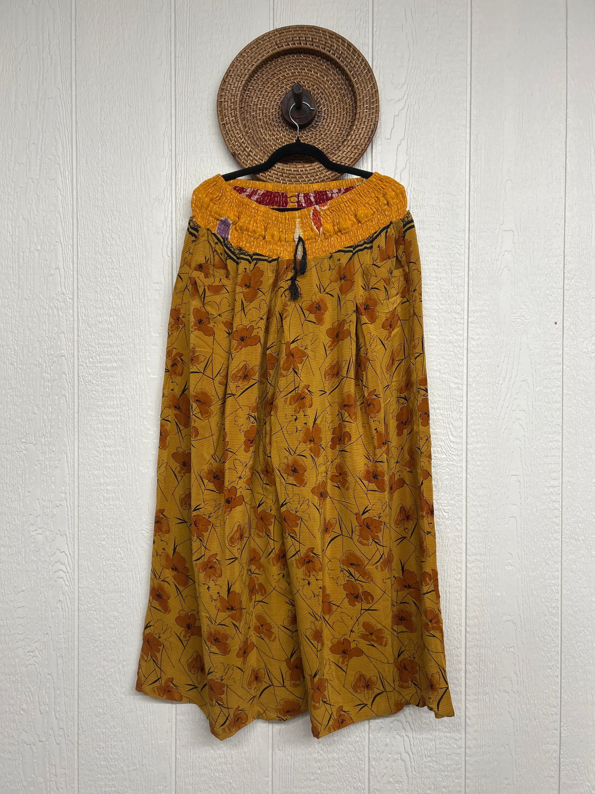 Crafted from vintage double crepe sari these pants feature wide legs, pleating, exterior and interior pockets making them fully reversible, and a stretchy waistband with a drawstring.