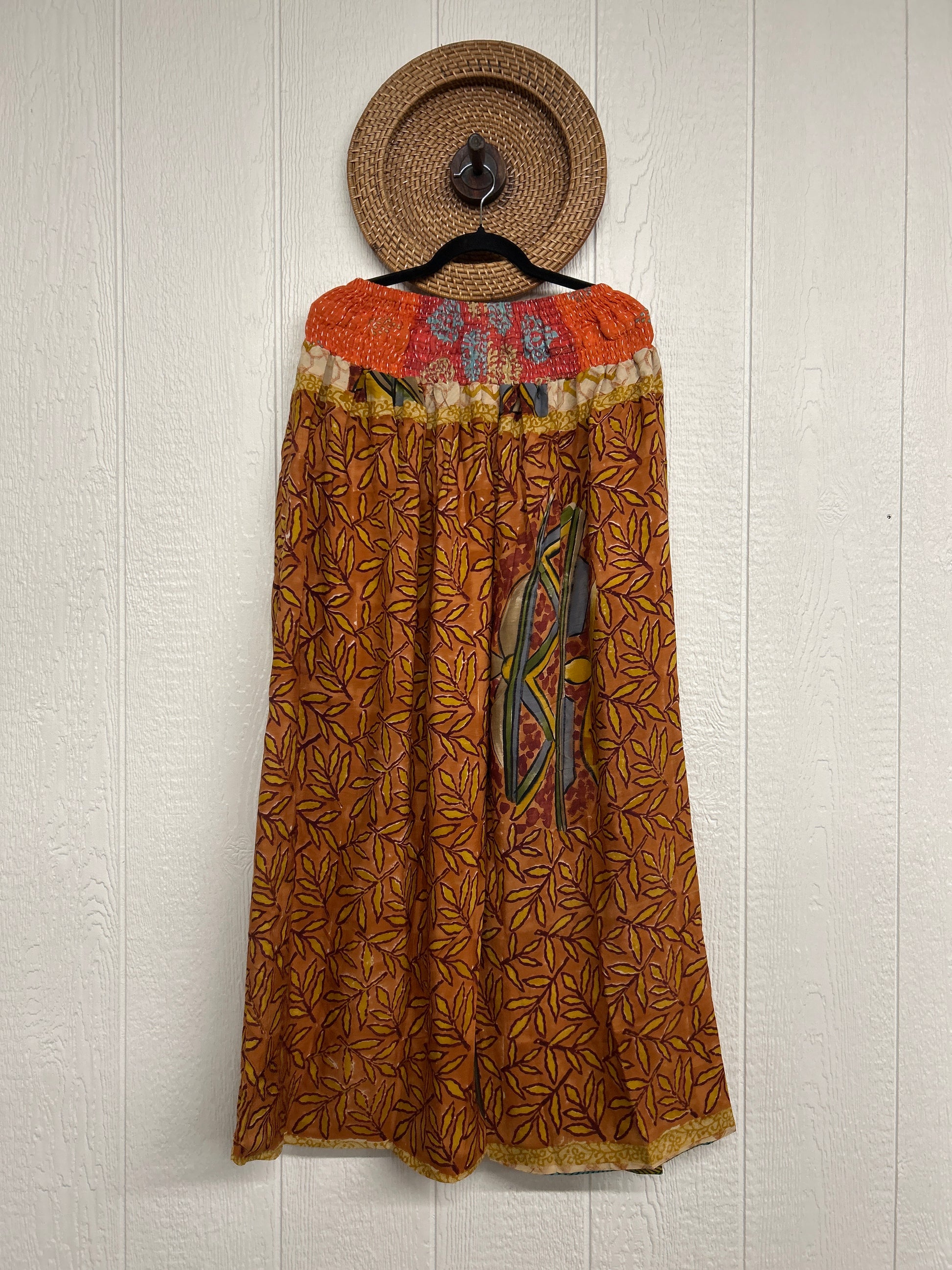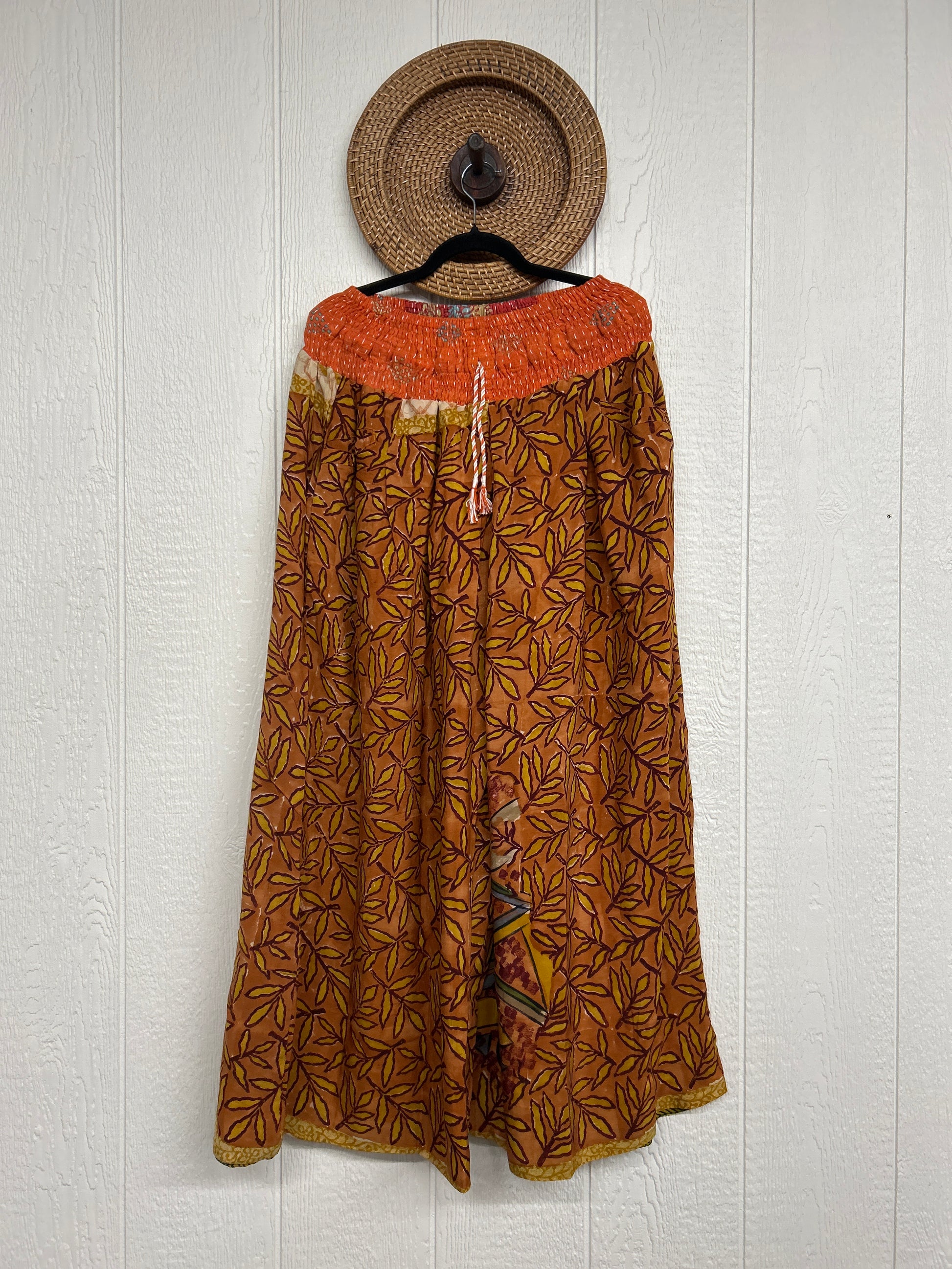 Crafted from vintage double crepe sari these pants feature wide legs, pleating, exterior and interior pockets making them fully reversible, and a stretchy waistband with a drawstring.
