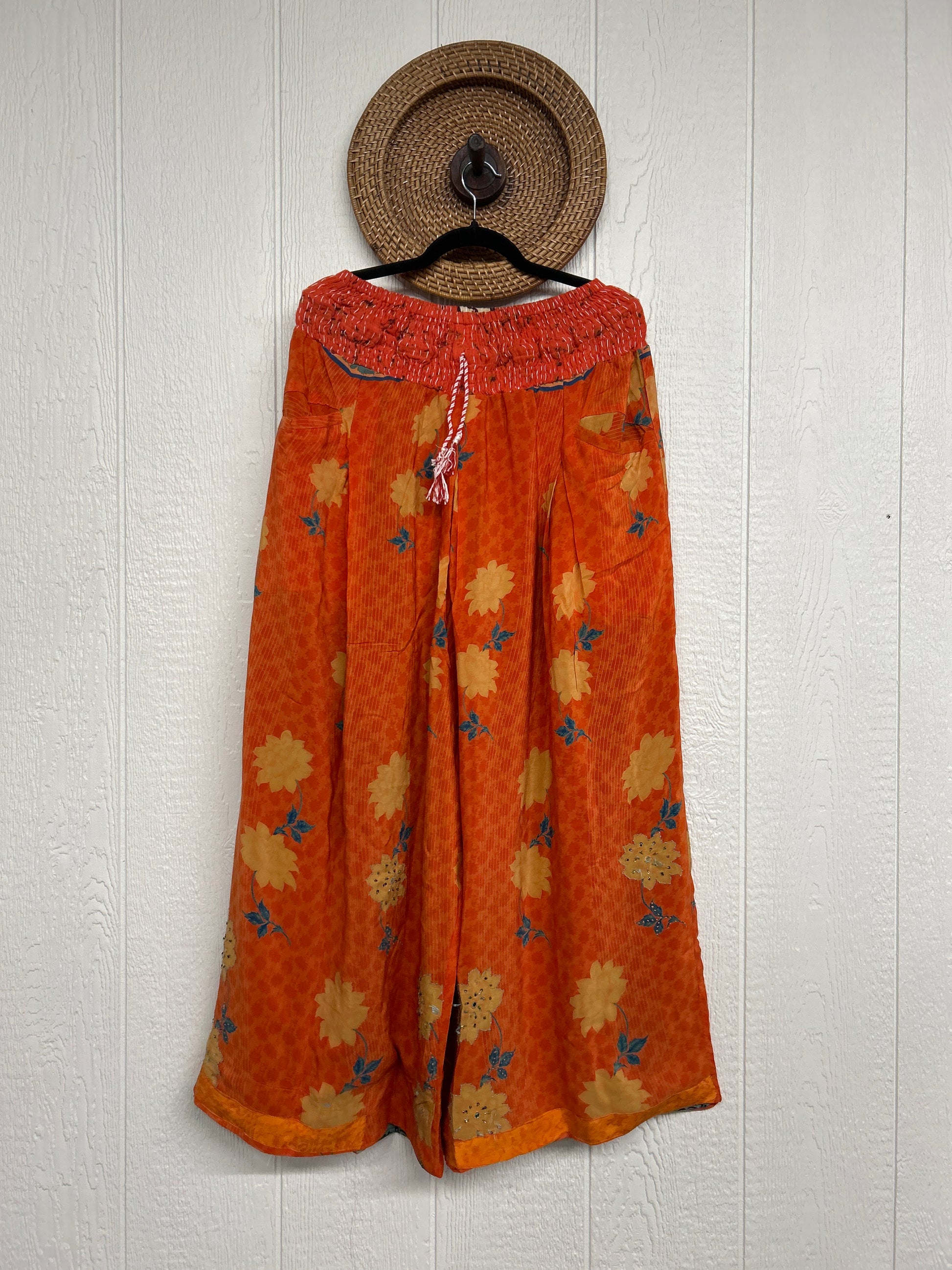 Crafted from vintage double crepe sari these pants feature wide legs, pleating, exterior and interior pockets making them fully reversible, and a stretchy waistband with a drawstring.