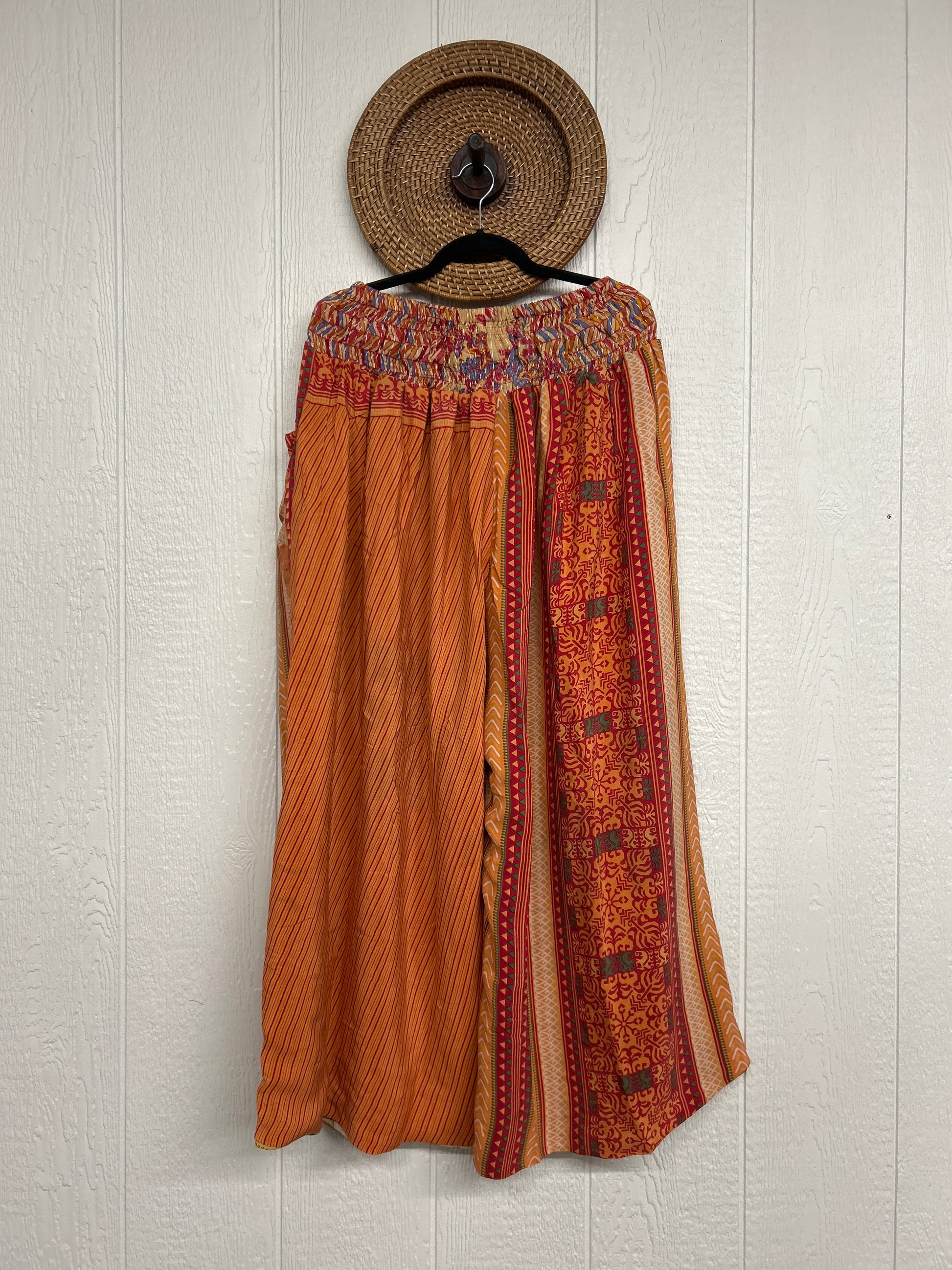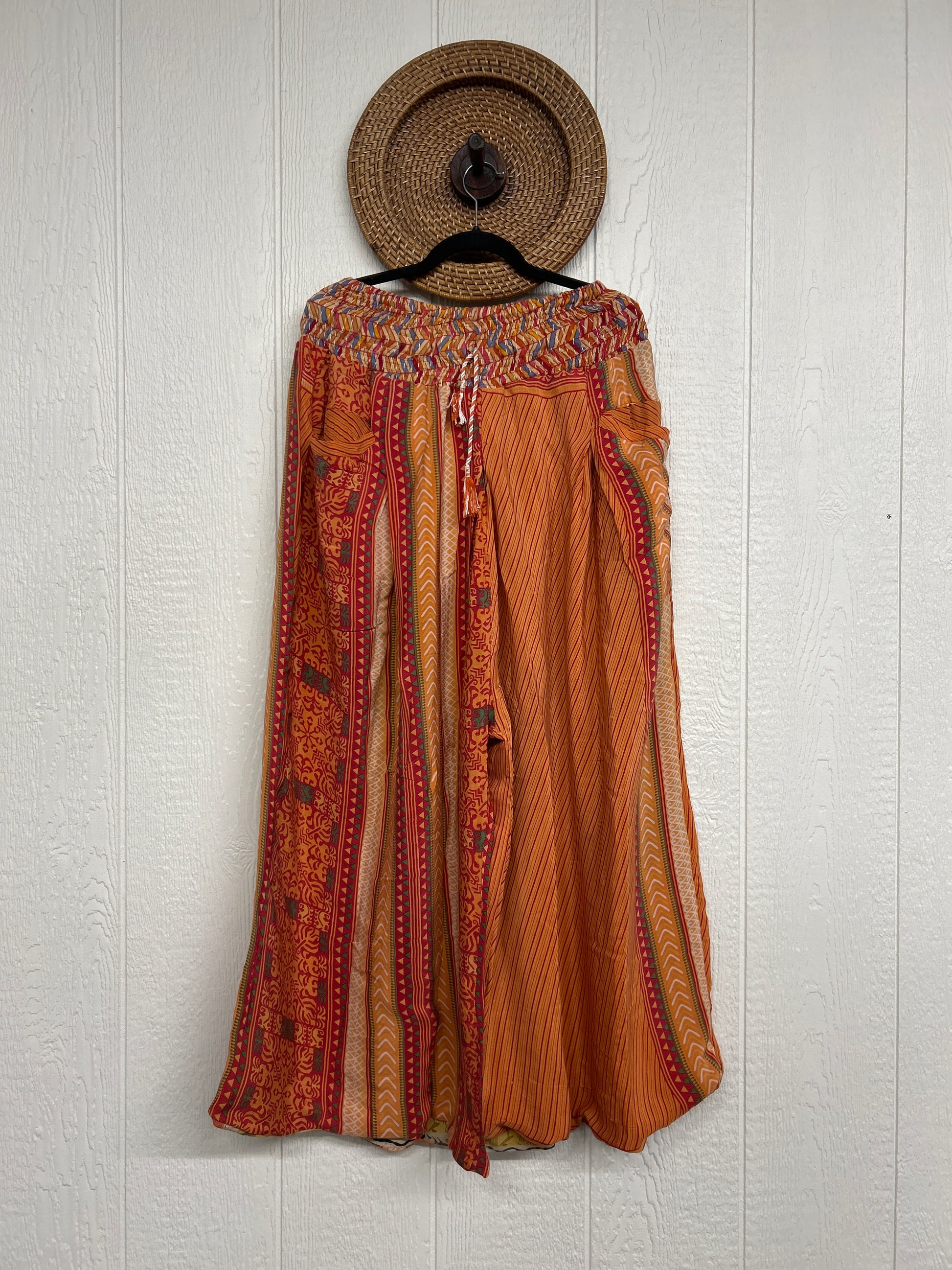 Crafted from vintage double crepe sari these pants feature wide legs, pleating, exterior and interior pockets making them fully reversible, and a stretchy waistband with a drawstring.