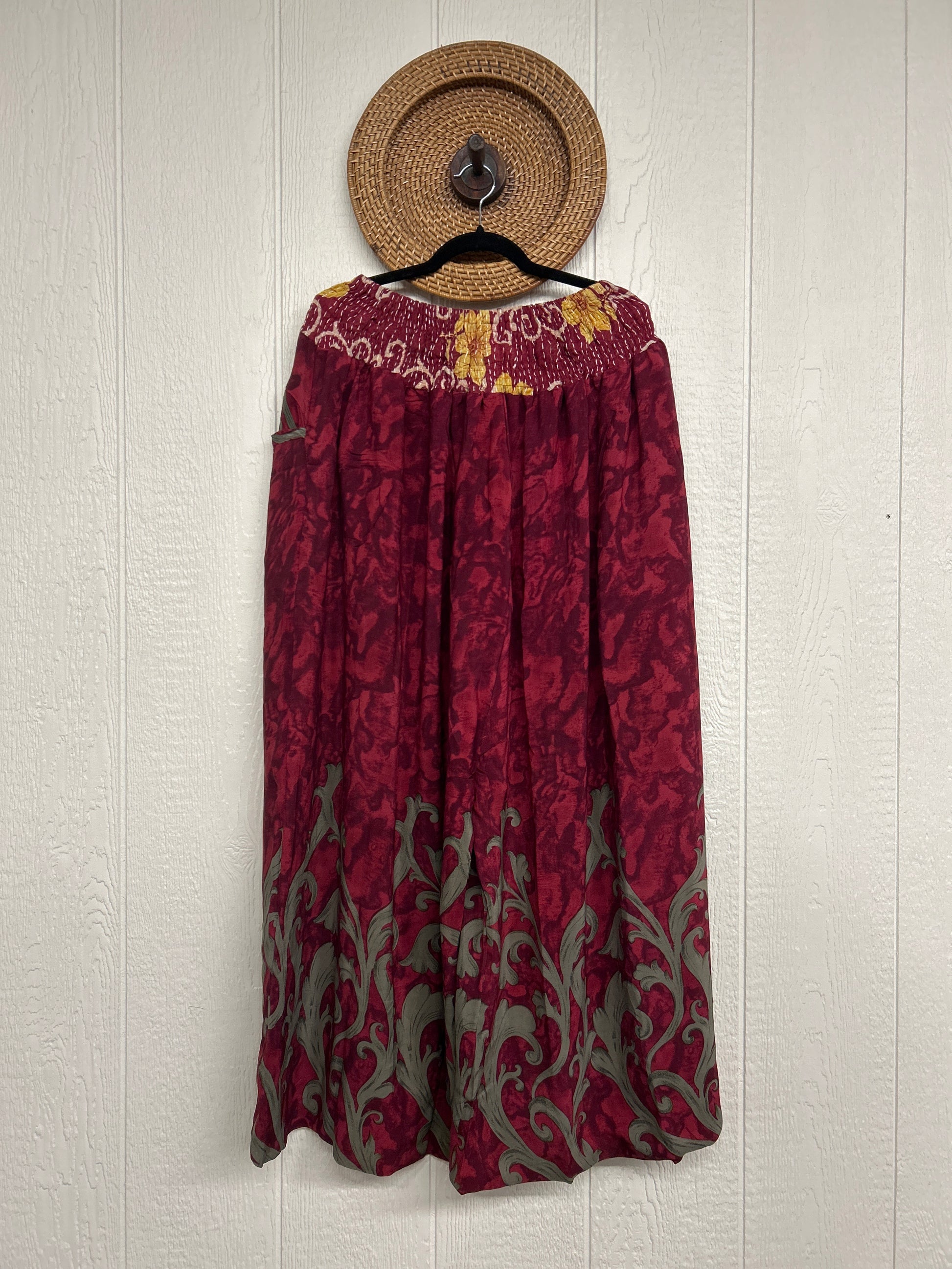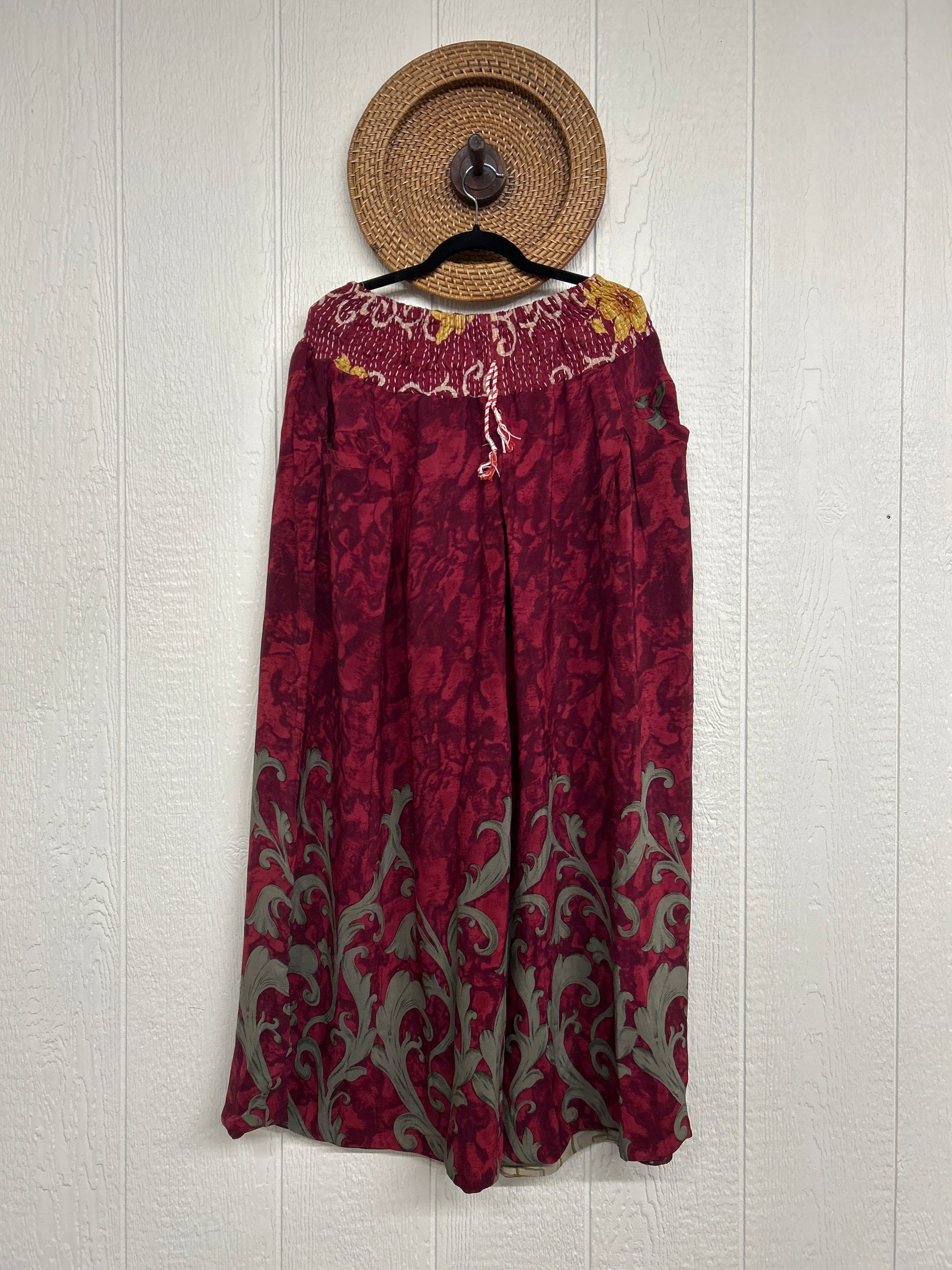 Crafted from vintage double crepe sari these pants feature wide legs, pleating, exterior and interior pockets making them fully reversible, and a stretchy waistband with a drawstring.