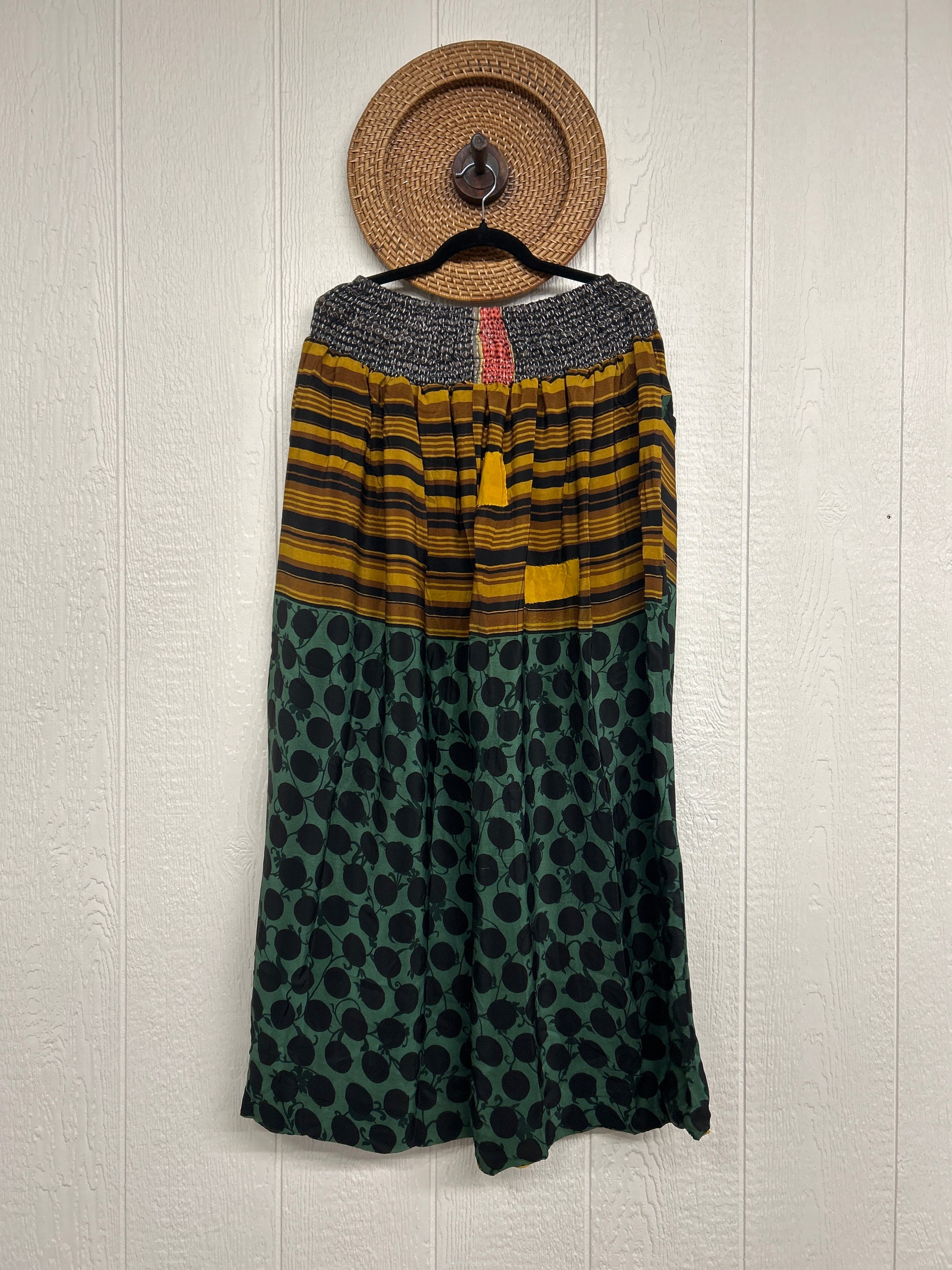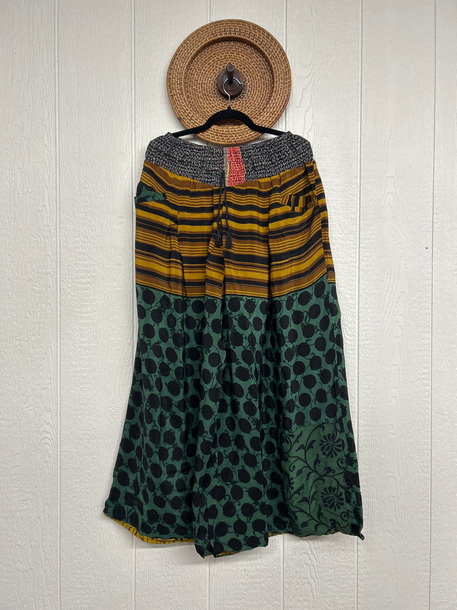 Crafted from vintage double crepe sari these pants feature wide legs, pleating, exterior and interior pockets making them fully reversible, and a stretchy waistband with a drawstring.