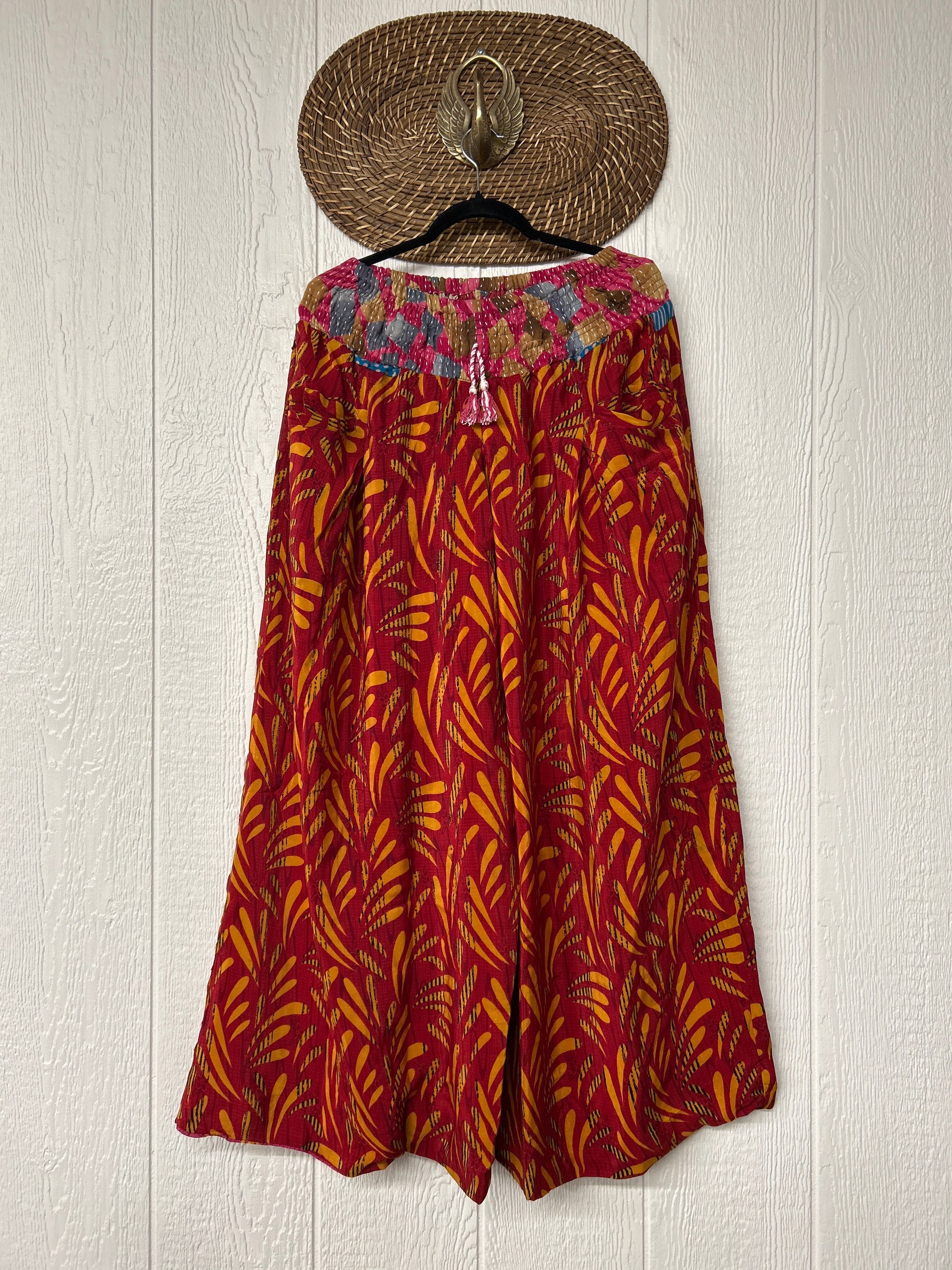 Crafted from vintage double crepe sari these pants feature wide legs, pleating, exterior and interior pockets making them fully reversible, and a stretchy waistband with a drawstring.